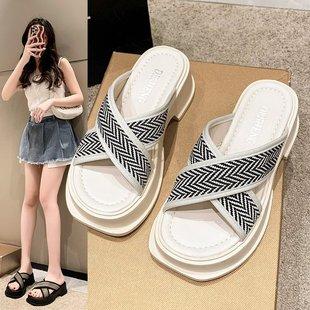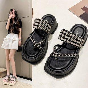 Sandálias de sola grossa pied de poule de celebridades da Internet para mulheres, roupas de verão ao ar livre, 2023, novos chinelos de ponta cruzada de alta qualidade para mulheres, atacado