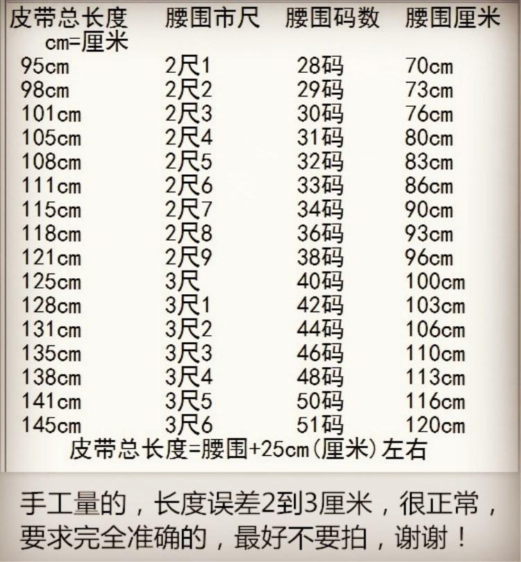 Por favor, deixe uma mensagem para o comprimento que você quer. O cinto mais longo tem 125 cm (incluindo a fivela). Se o comprimento for maior que 125 cm, você será cobrado extra. Um extra de 0,5 yuan será cobrado para cada aumento de 1 cm.