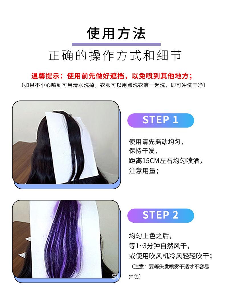 Spray de coloração que não desbota facilmente: depois que o cabelo estiver completamente seco após a pulverização, ele não grudará nas suas mãos e não desbotará facilmente, mesmo se você o segurar ou tocar.