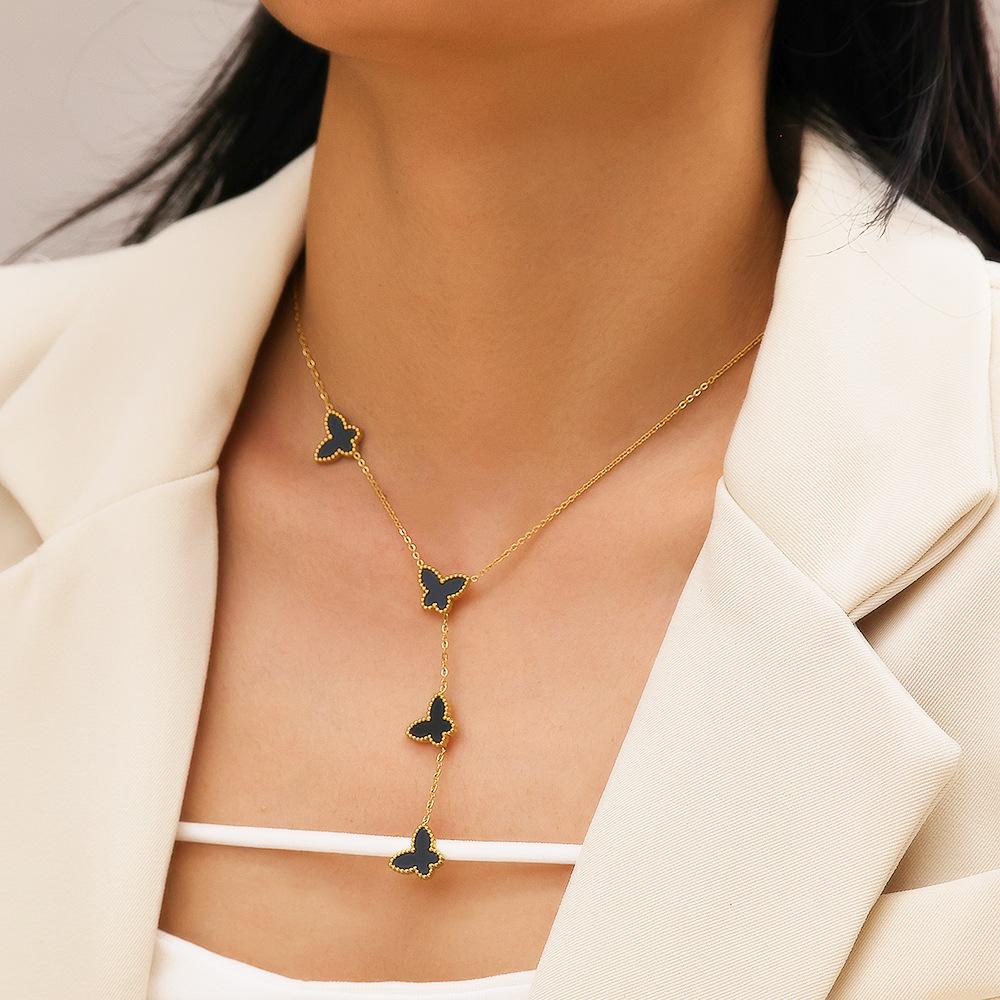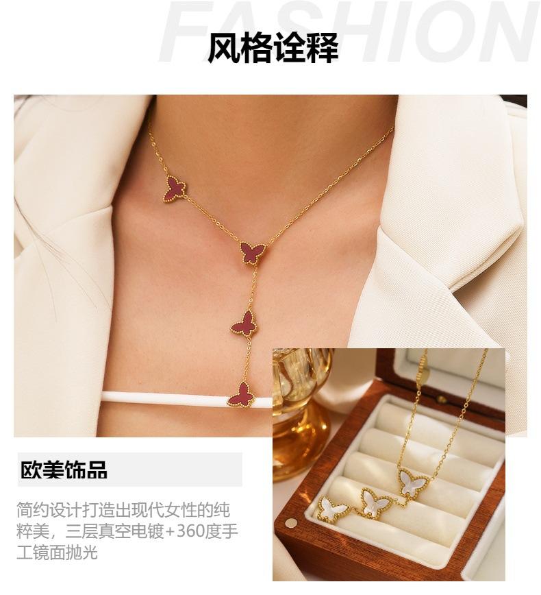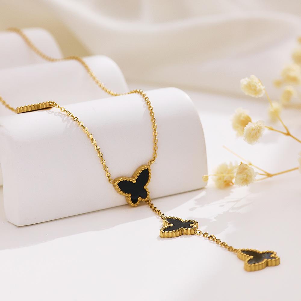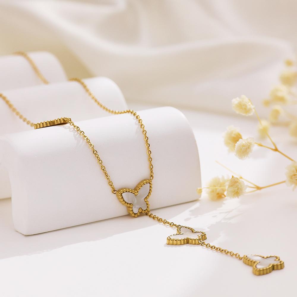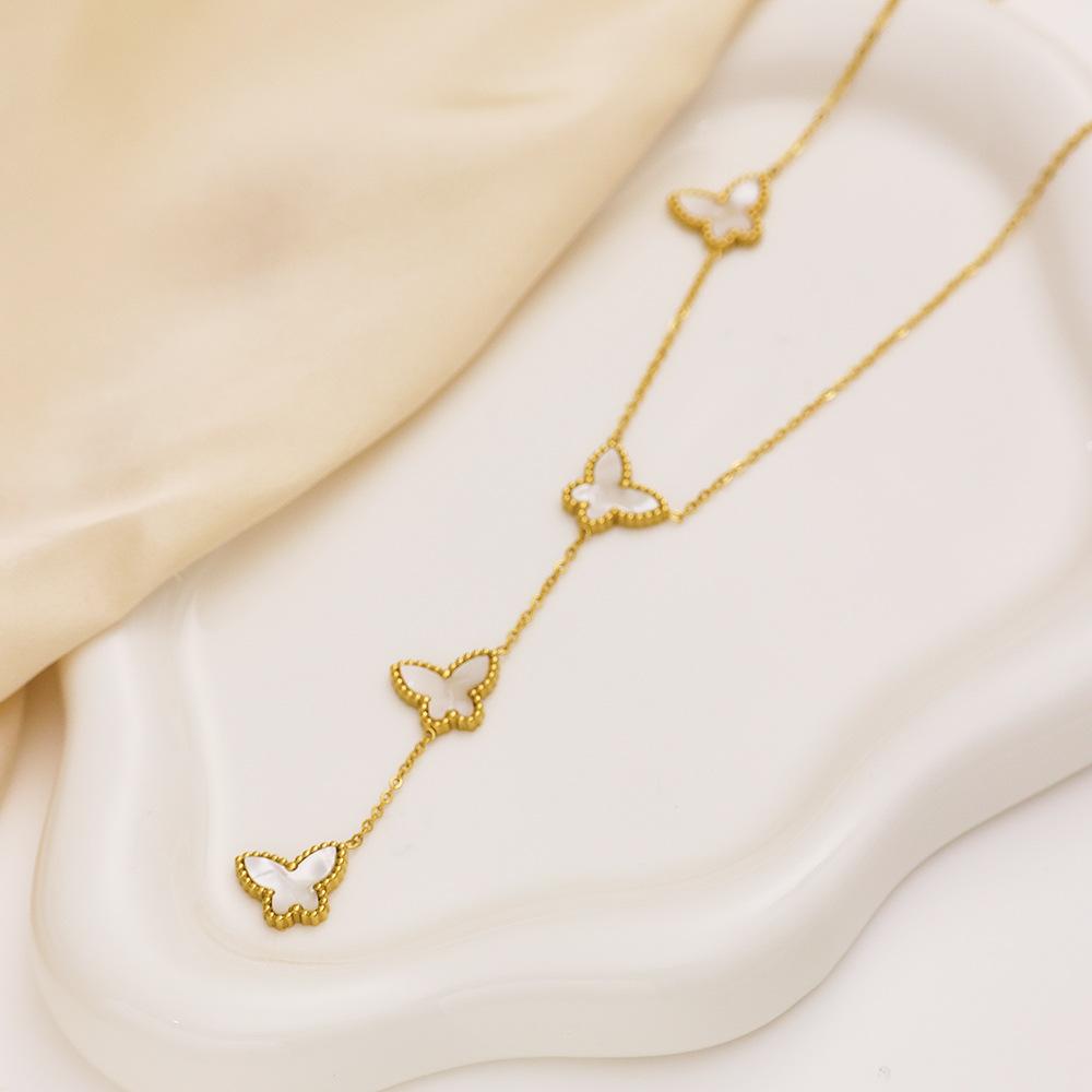 Corrente de Suéter de Aço Inoxidável Estilo Ins Europeu e Americano Banhado a Ouro 18K Corrente Clavicular de Madrepérola Pingente de Borboleta Francês Colar de Aço Titânio