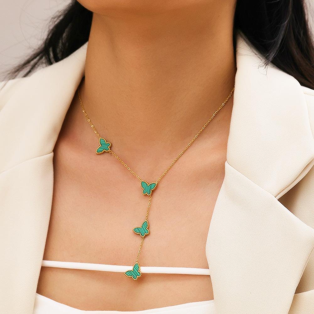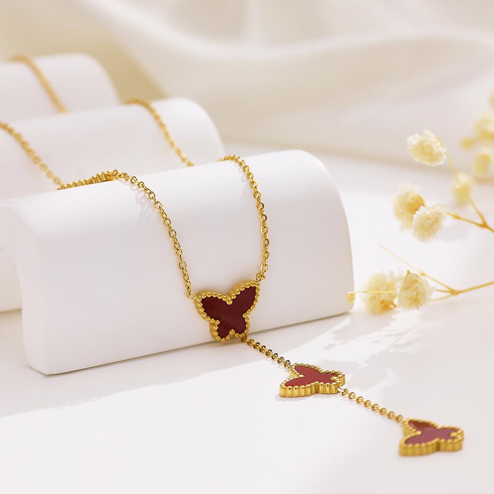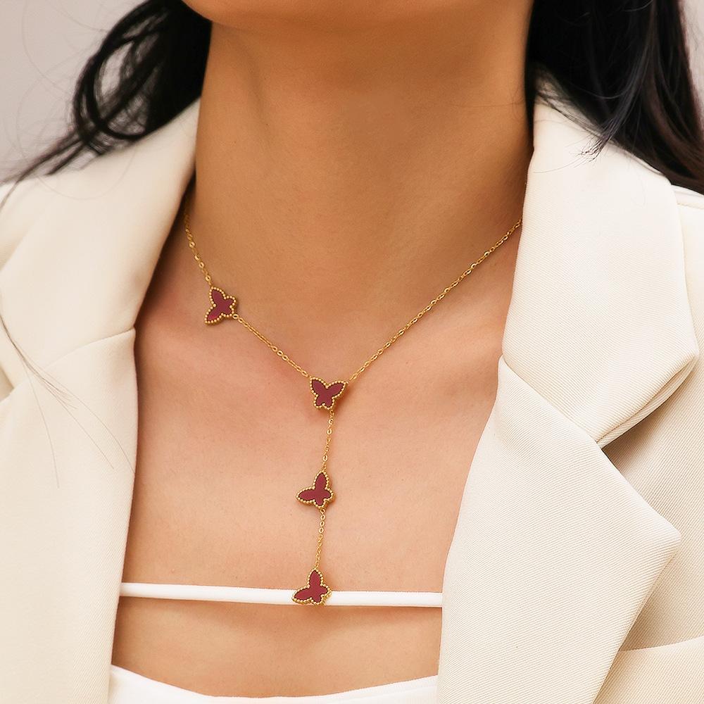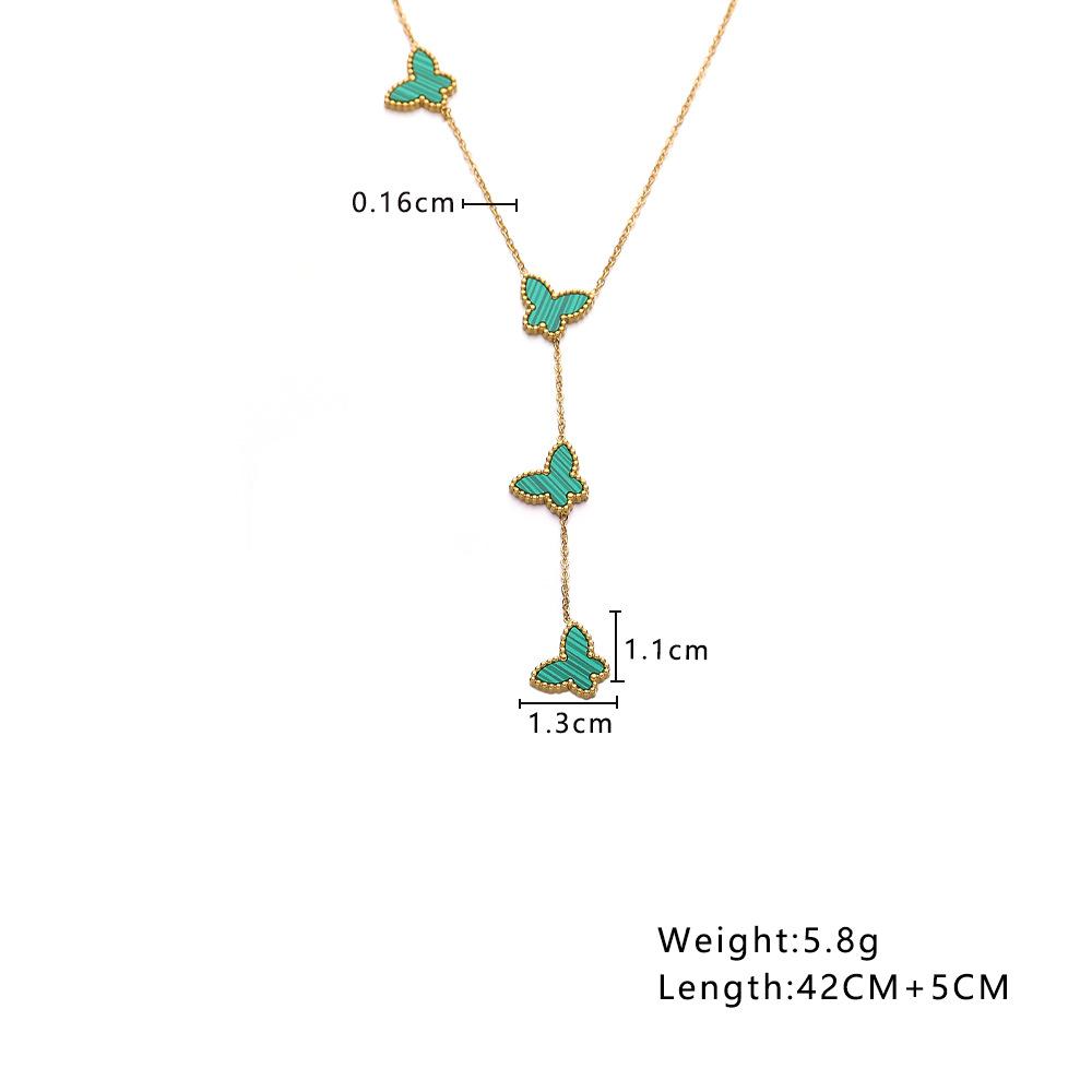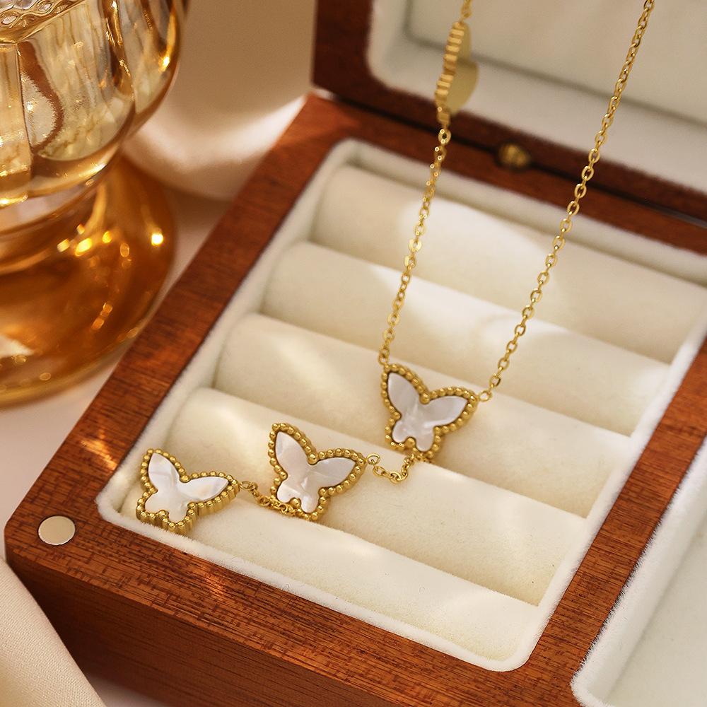 Corrente de Suéter de Aço Inoxidável Estilo Ins Europeu e Americano Banhado a Ouro 18K Corrente Clavicular de Madrepérola Pingente de Borboleta Francês Colar de Aço Titânio