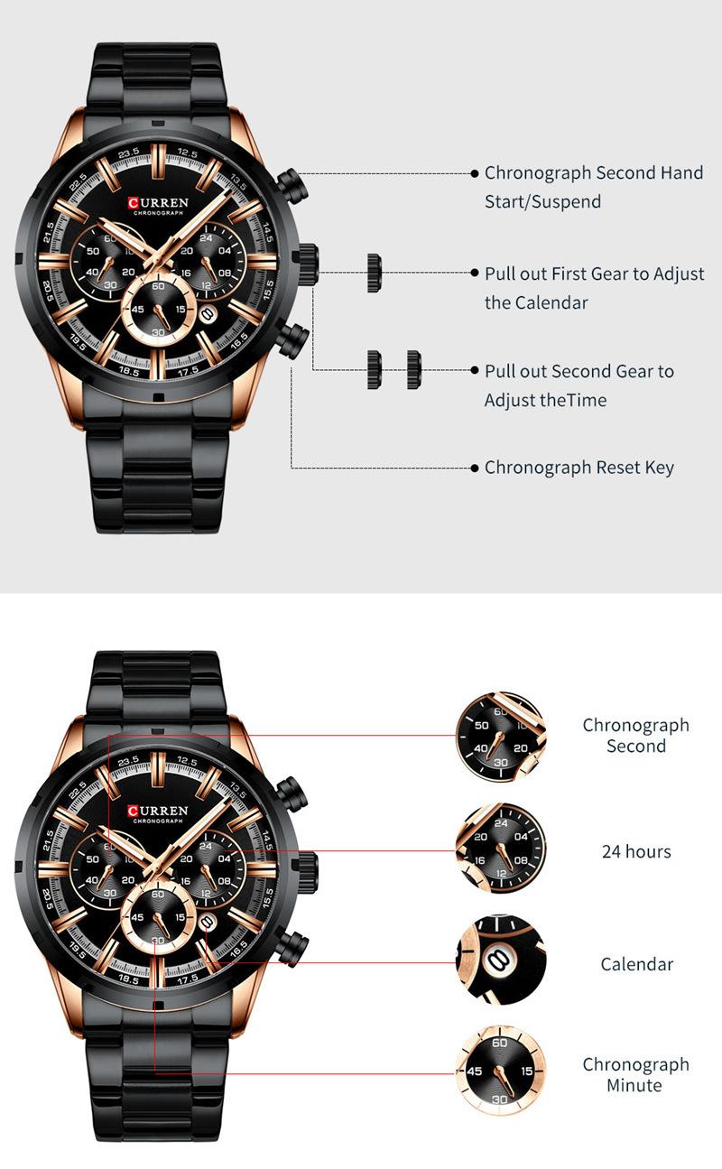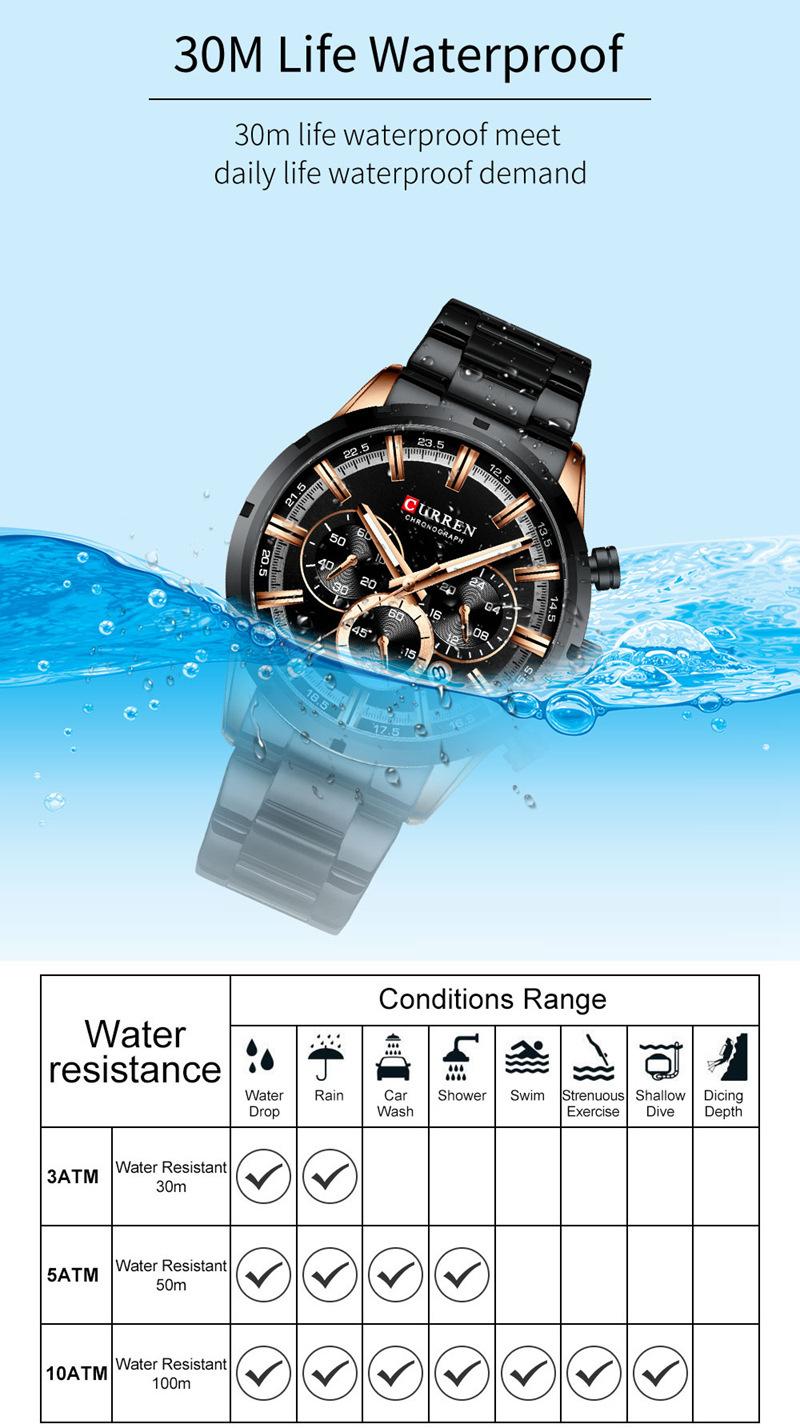 1. Salvo indicação em contrário, os relógios são à prova d'água para uso diário e podem ser usados para lavar as mãos e o rosto, mas não podem ser usados no chuveiro ou mergulhados em água;