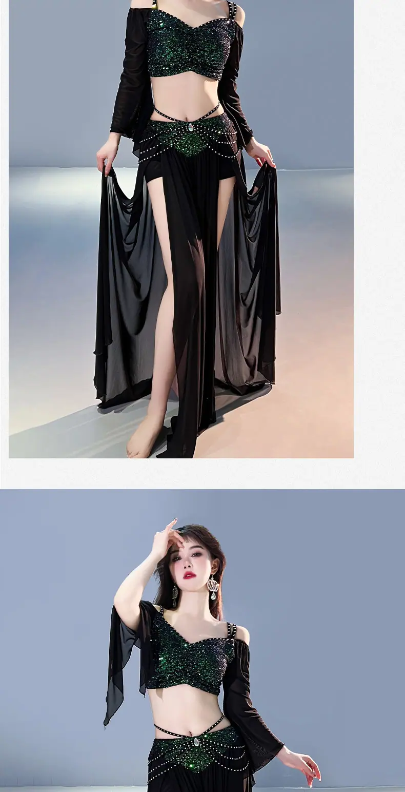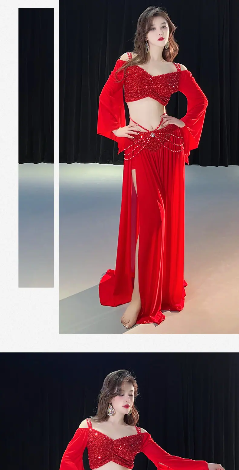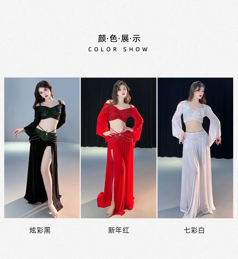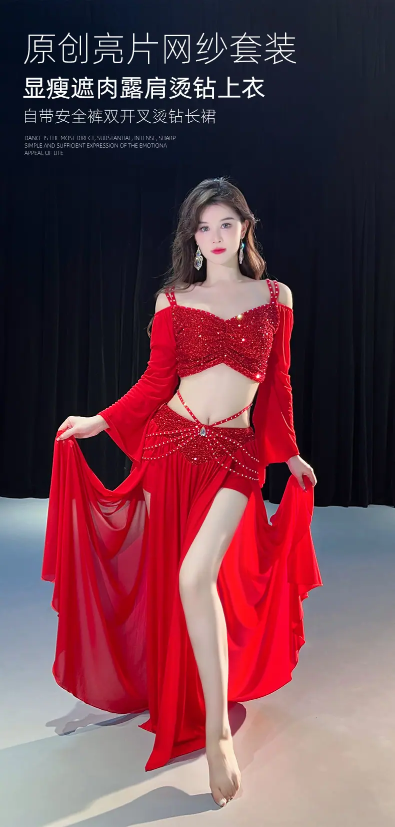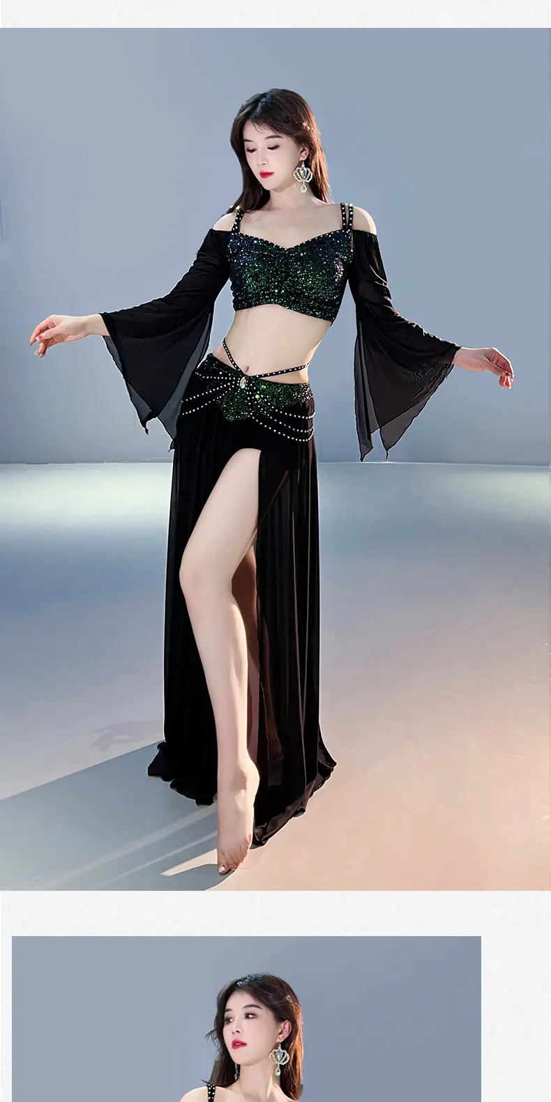 Traje de dança do ventre com design de nicho original para dançarinos, lantejoulas, malha de primavera, roupas de aula de treinamento, terno 5090