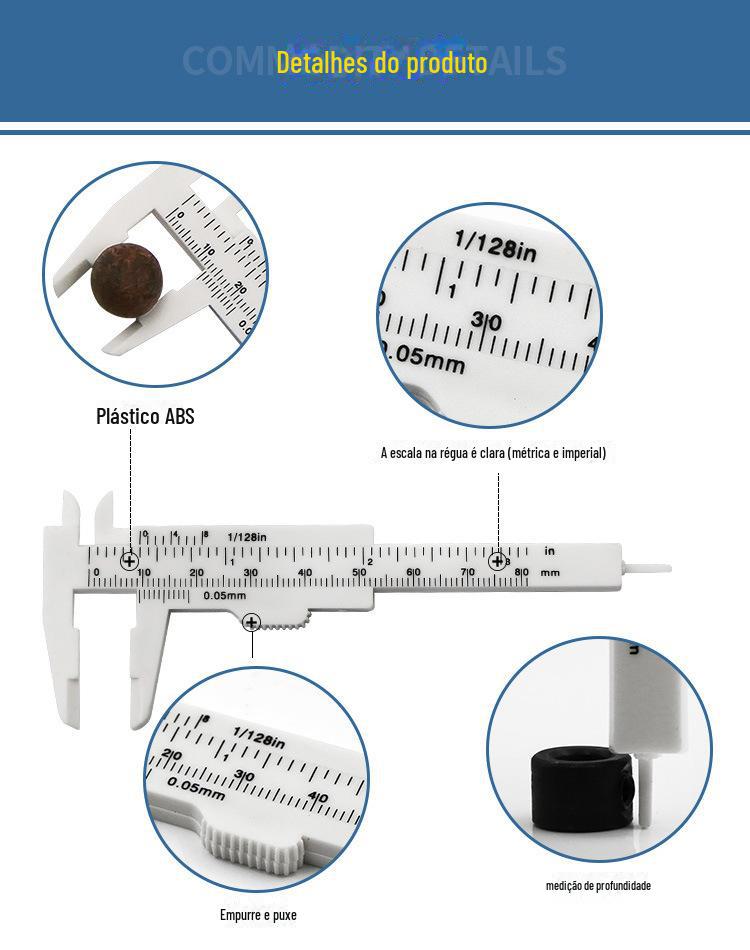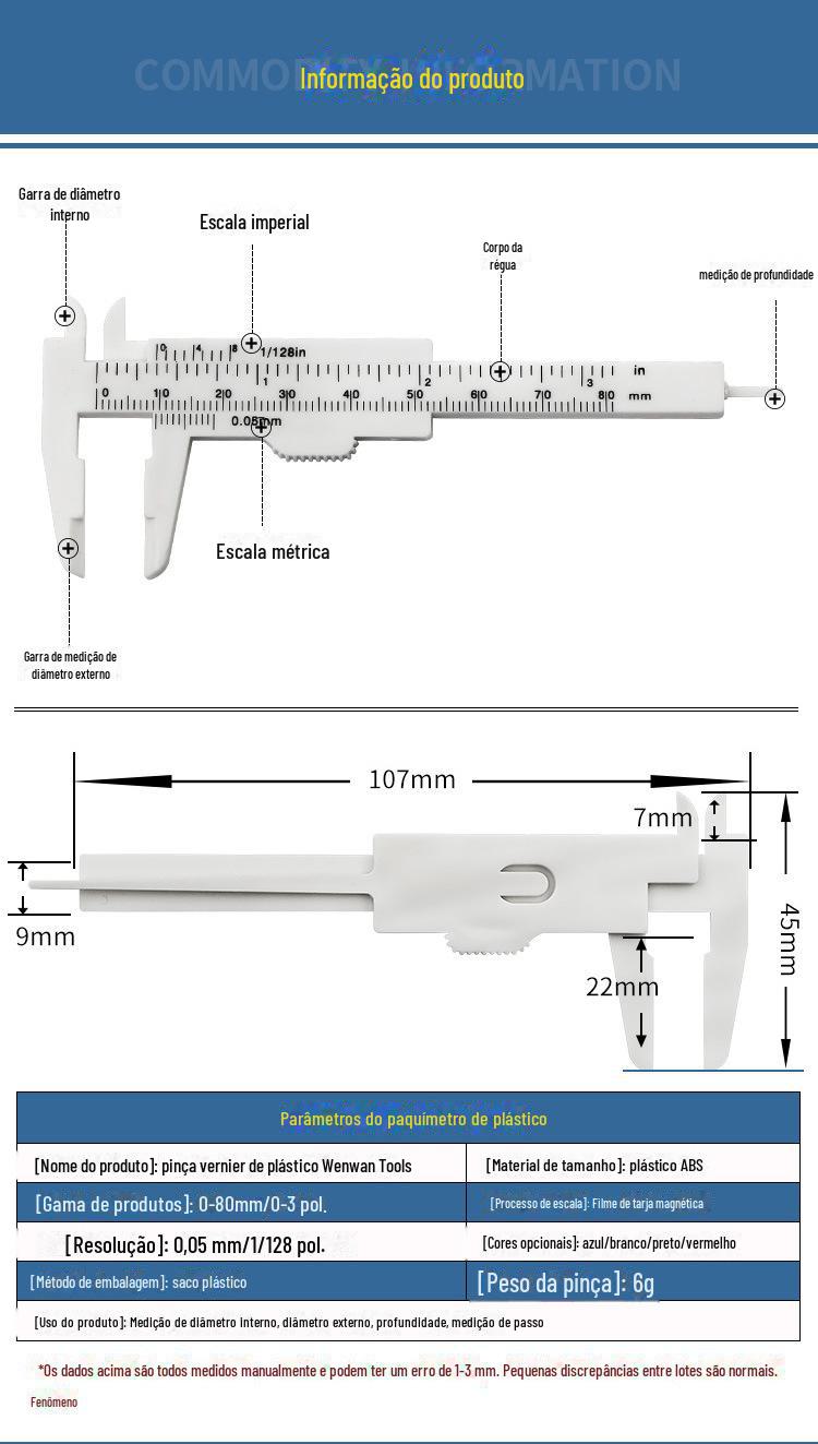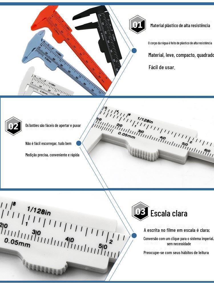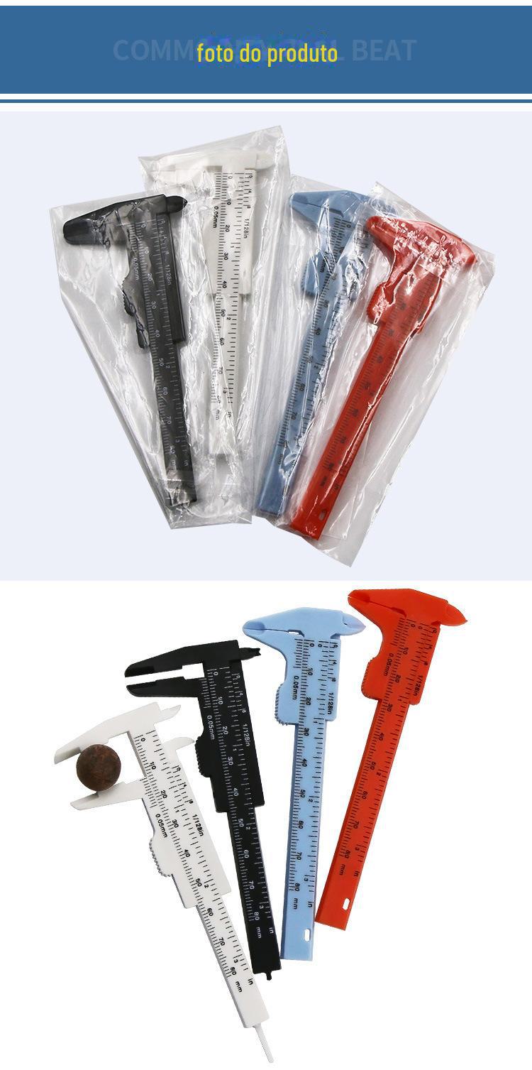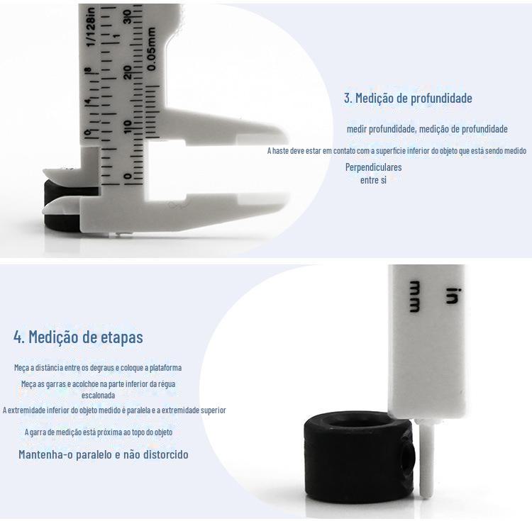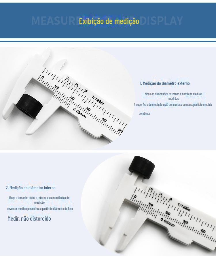 Comparado com paquímetros de metal, a precisão deste produto será um pouco menor. Além disso, as linhas de escala são impressas e alguns produtos não são claros; há algumas rebarbas e defeitos nos cantos dos produtos de plástico, que estão todos dentro da faixa normal! Você recebe o que paga. Não pode ser comparado com paquímetros digitais de alta precisão. Os requisitos para produtos são muito idealistas. Não faça lances se tiver requisitos mais altos;