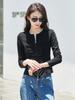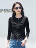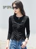 Camiseta feminina de manga comprida, gola redonda e zíper, moda coreana, plissada, elegante e de alta qualidade, outono 2025