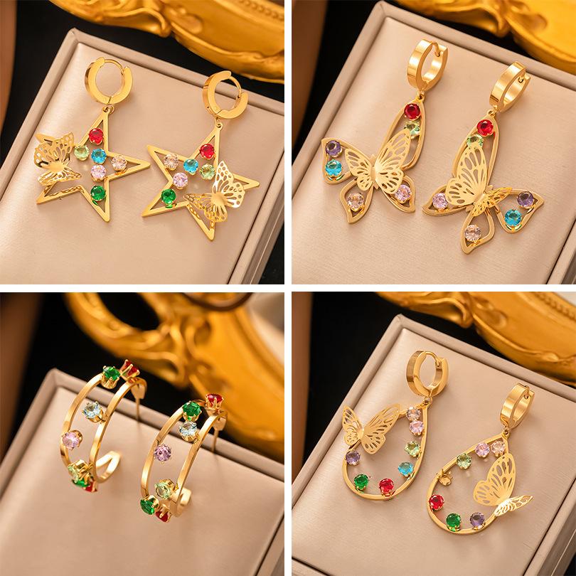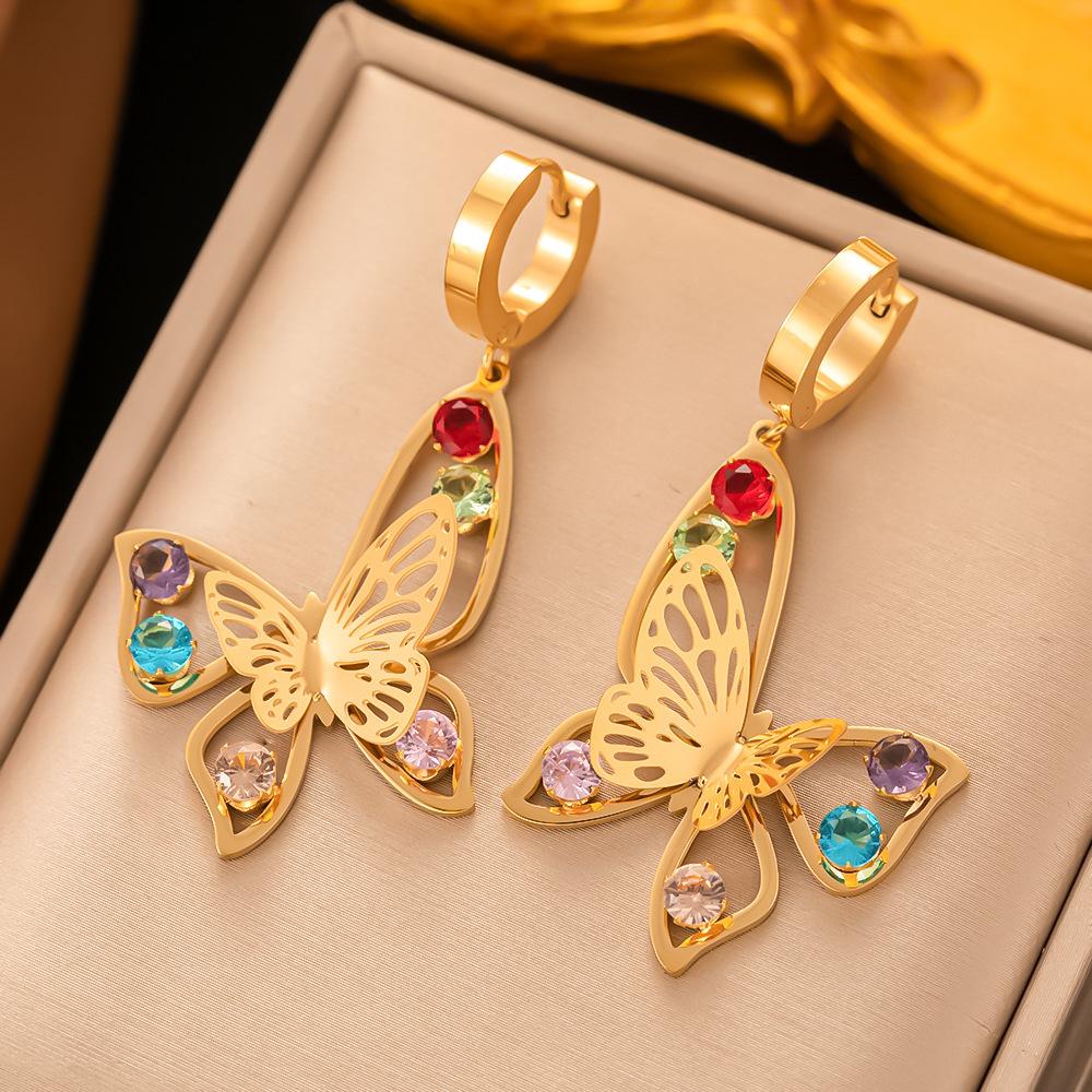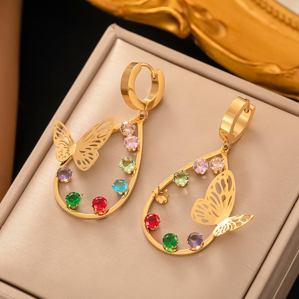 Compre Europeu e americano transfronteiriço atacado novo aço inoxidável colorido zircão brincos borla temperamento de alta qualidade brincos de borboleta oca no atacado no Joom.pro