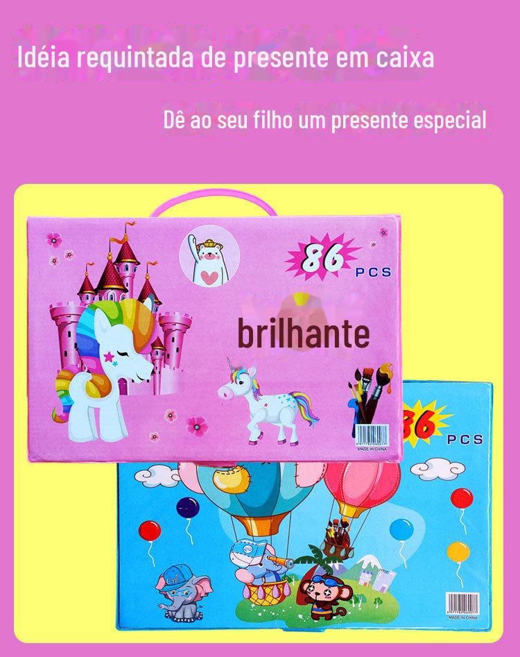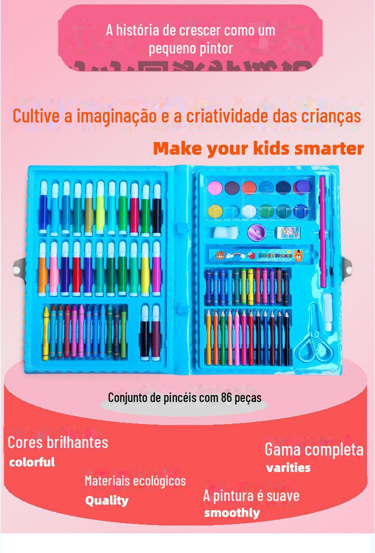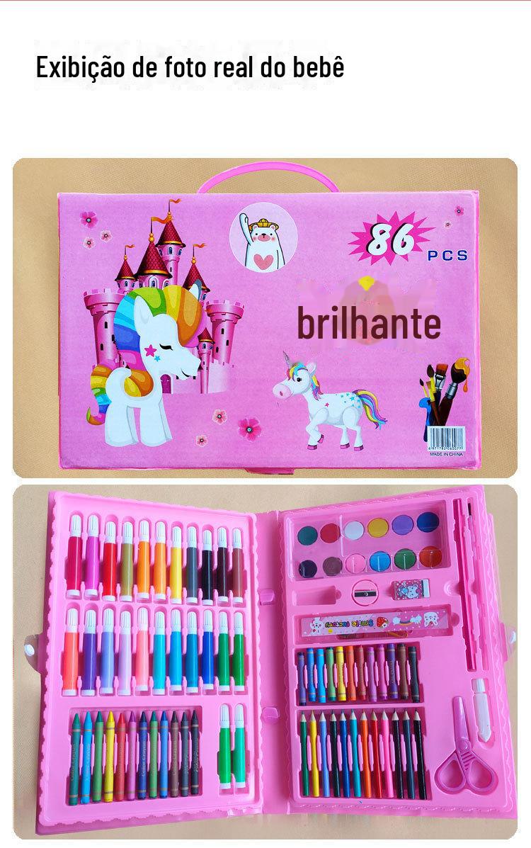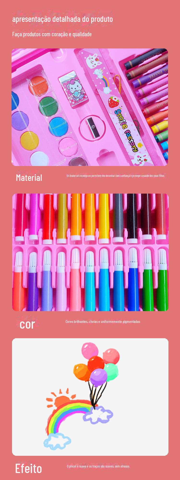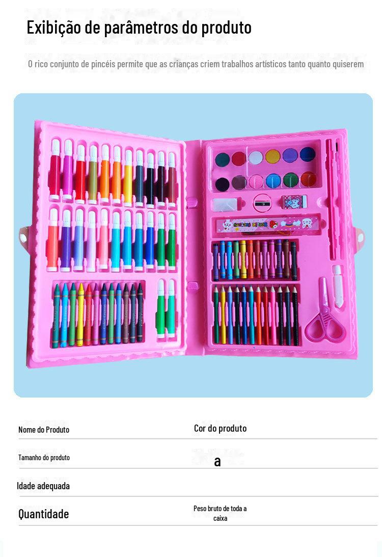 Estrutura interna: Contém 24 canetas aquarela, 12 lápis de cor, 12 bastões de cera coloridos, 12 lápis de cor,