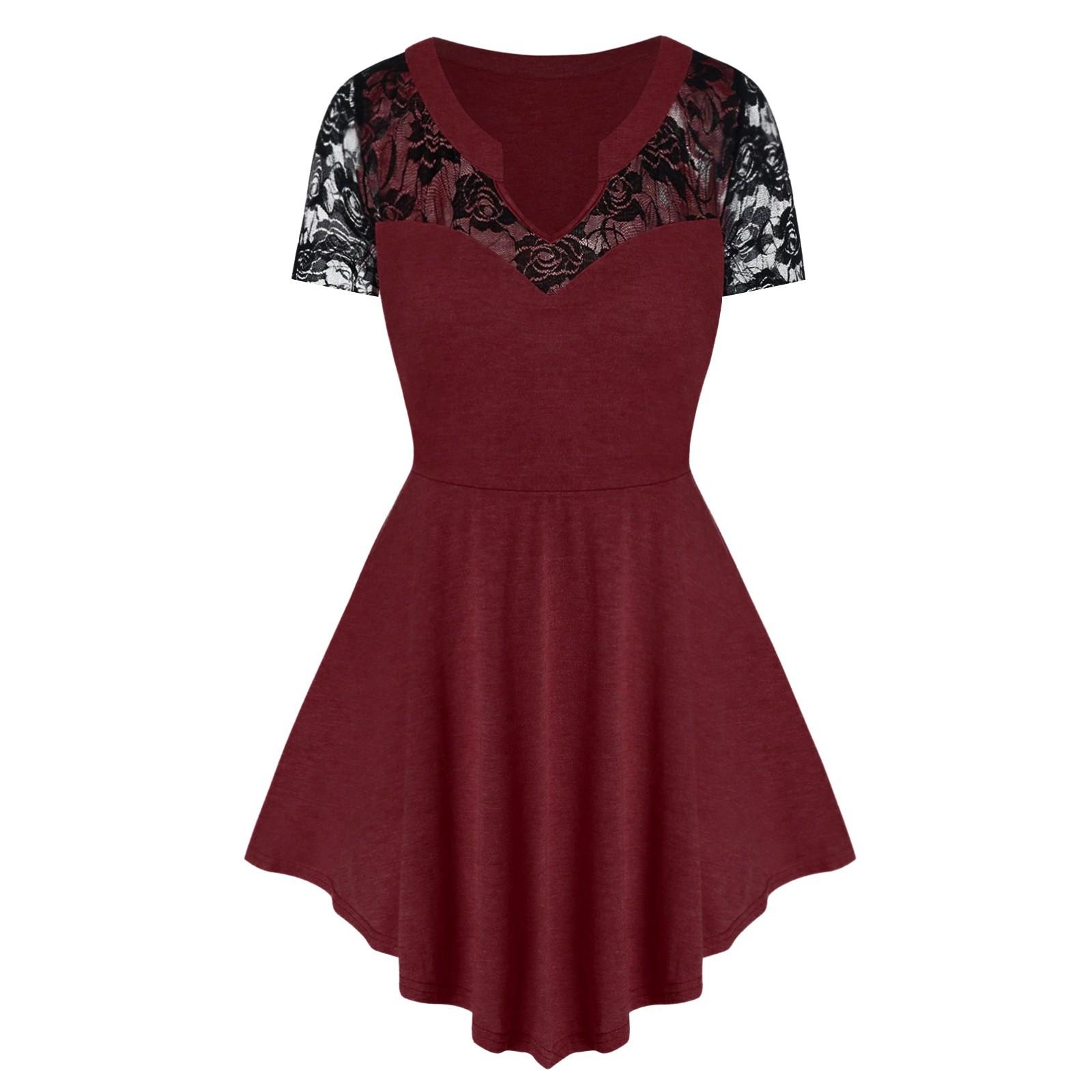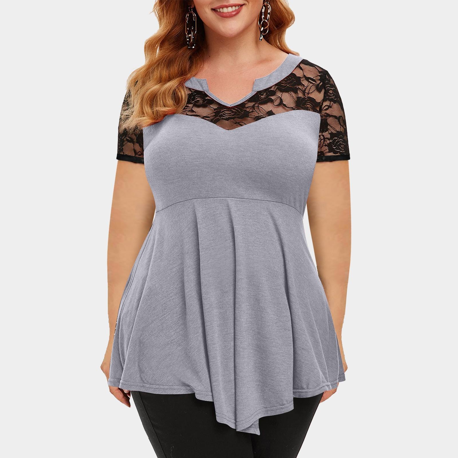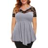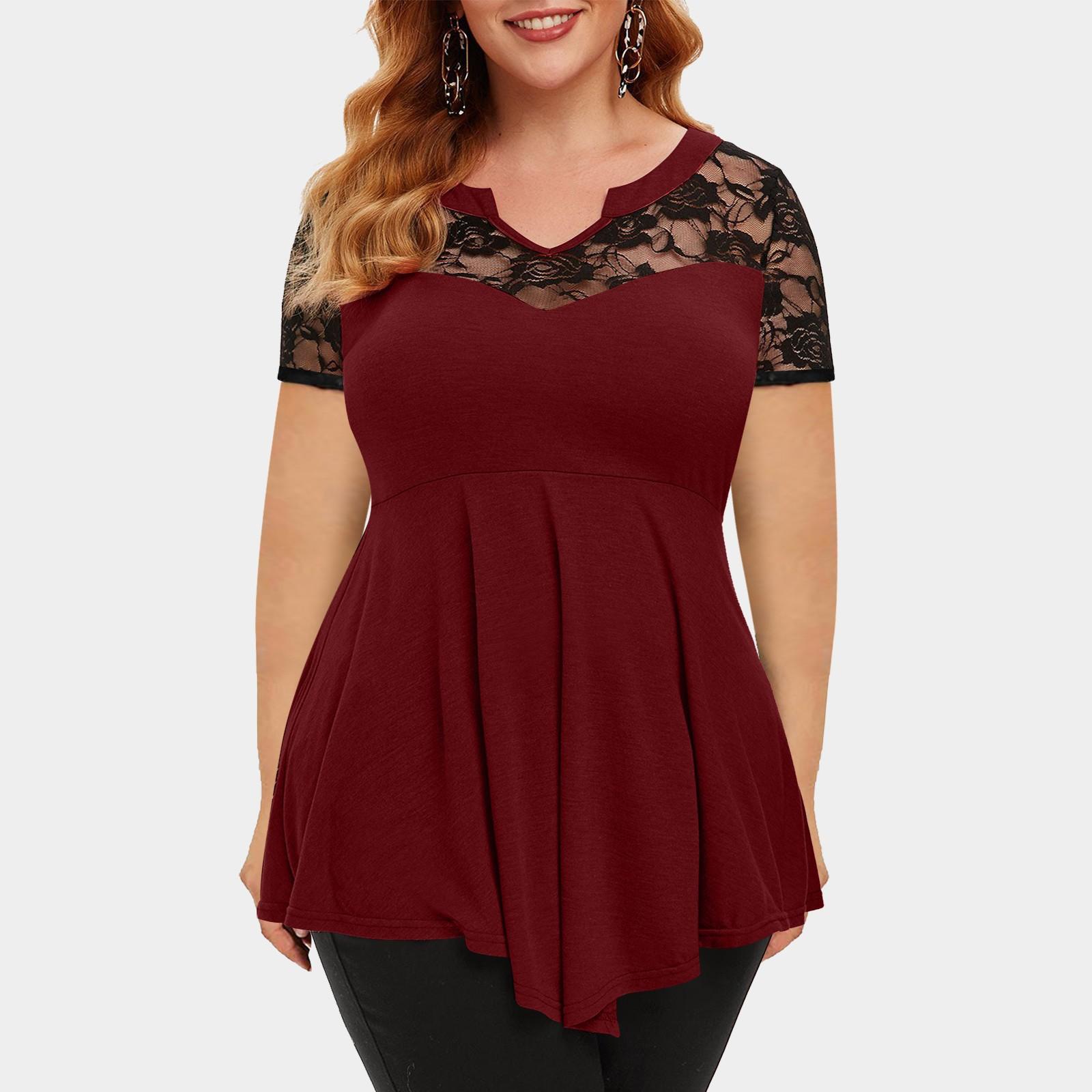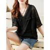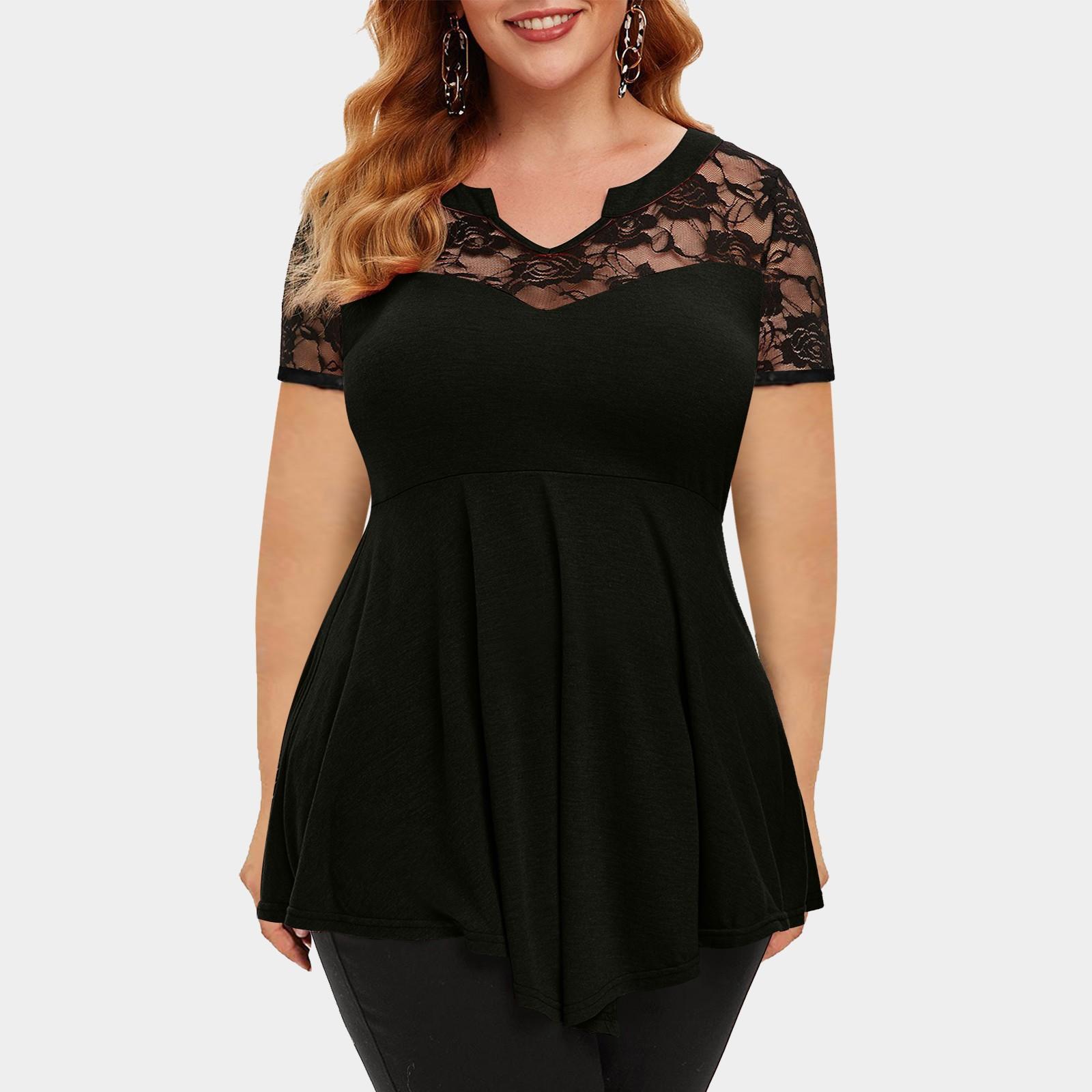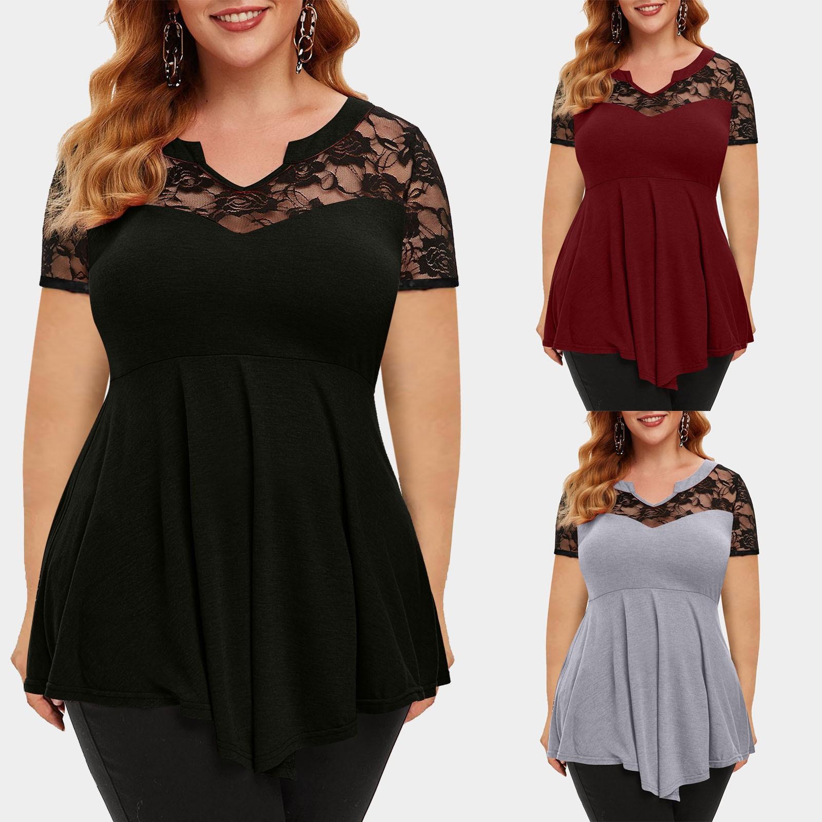 Top de renda tamanho grande feminino gola casual com decote em V renda manga curta boêmio bainha solta cor sólida top
