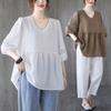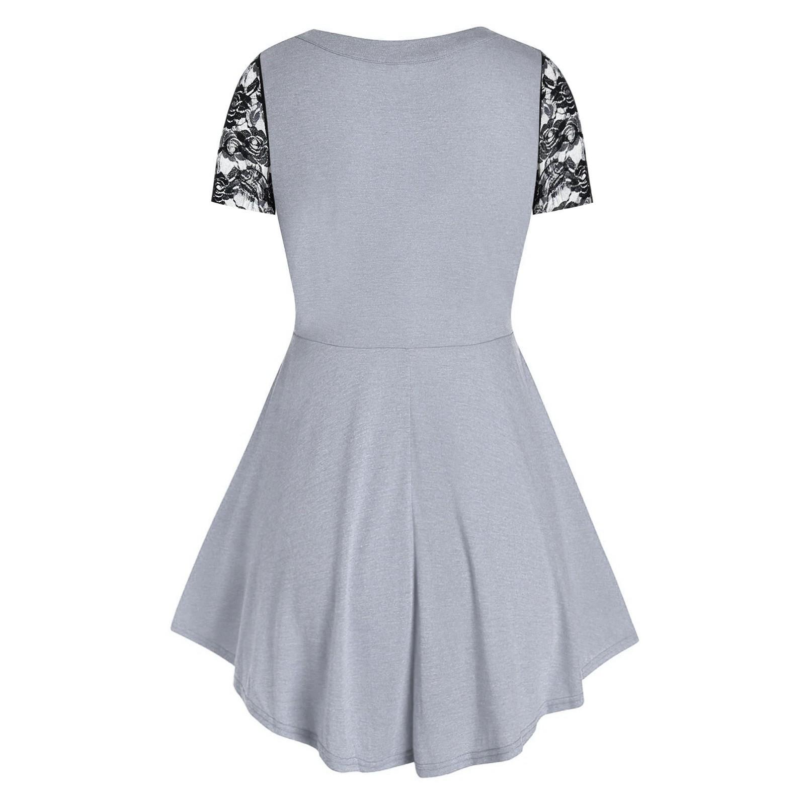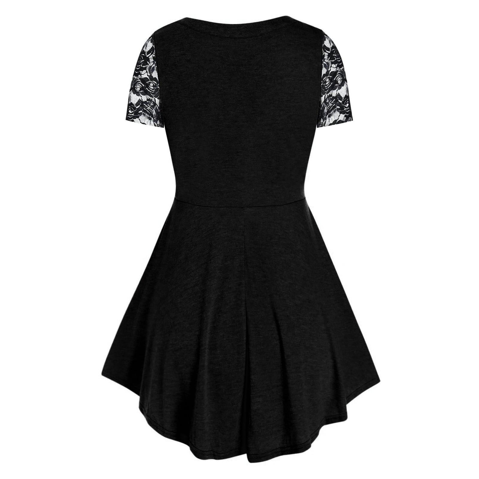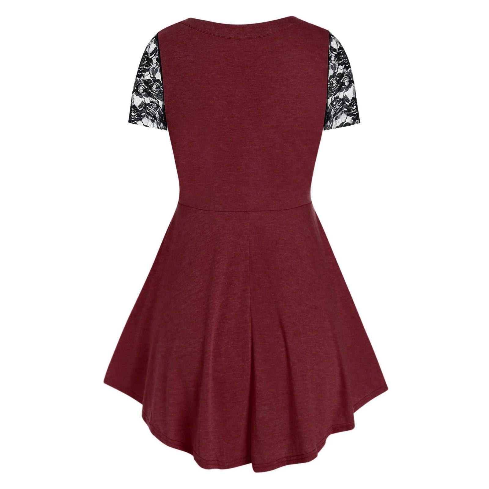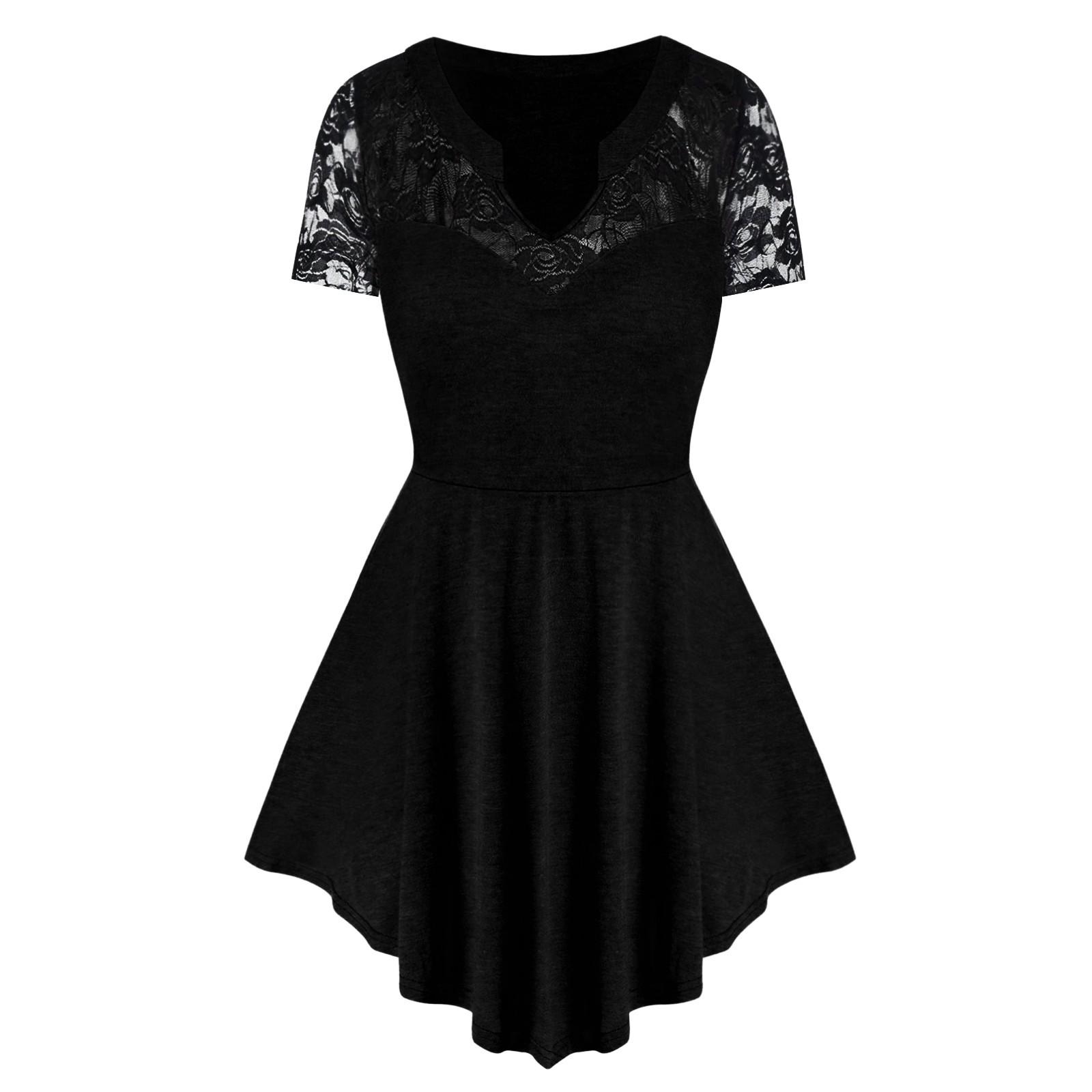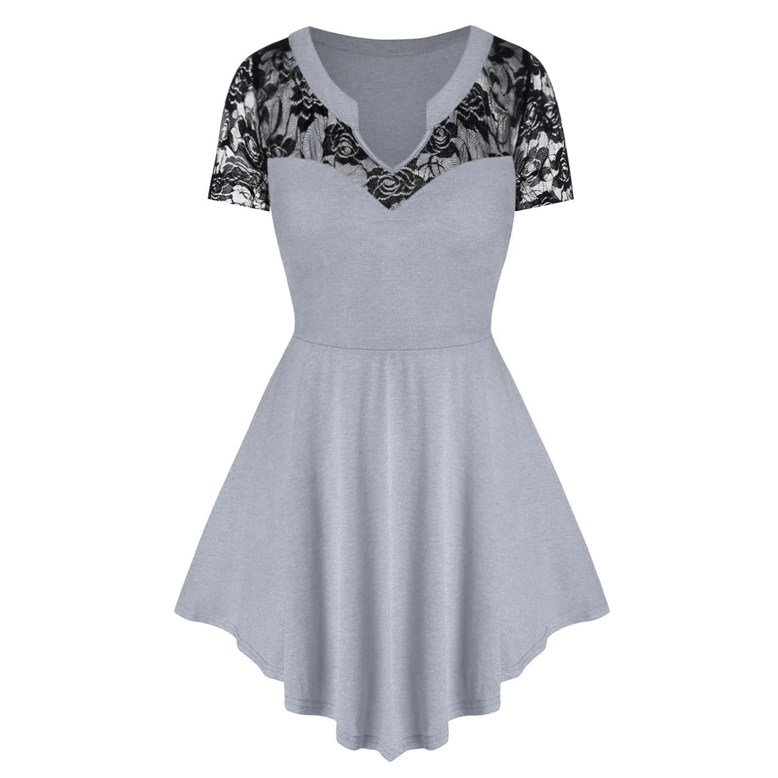 Top de renda tamanho grande feminino gola casual com decote em V renda manga curta boêmio bainha solta cor sólida top