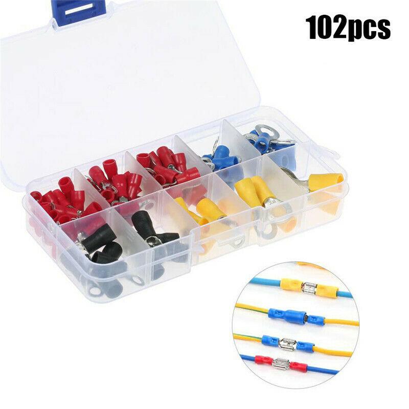 Uma caixa de armazenamento classificada, 102 terminais de fios diversos.