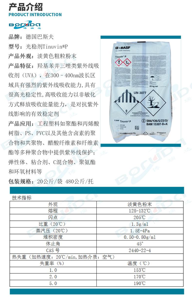 1) O Tinuvin P pode ser usado como proteção anti-UV para muitos polímeros, incluindo homo/coestireno, plásticos de engenharia como poliésteres e acrilatos, homo/copolímeros de cloreto de polivinila contendo halogênio (como resinas de vinilideno), acetais e celulose esterificada.
