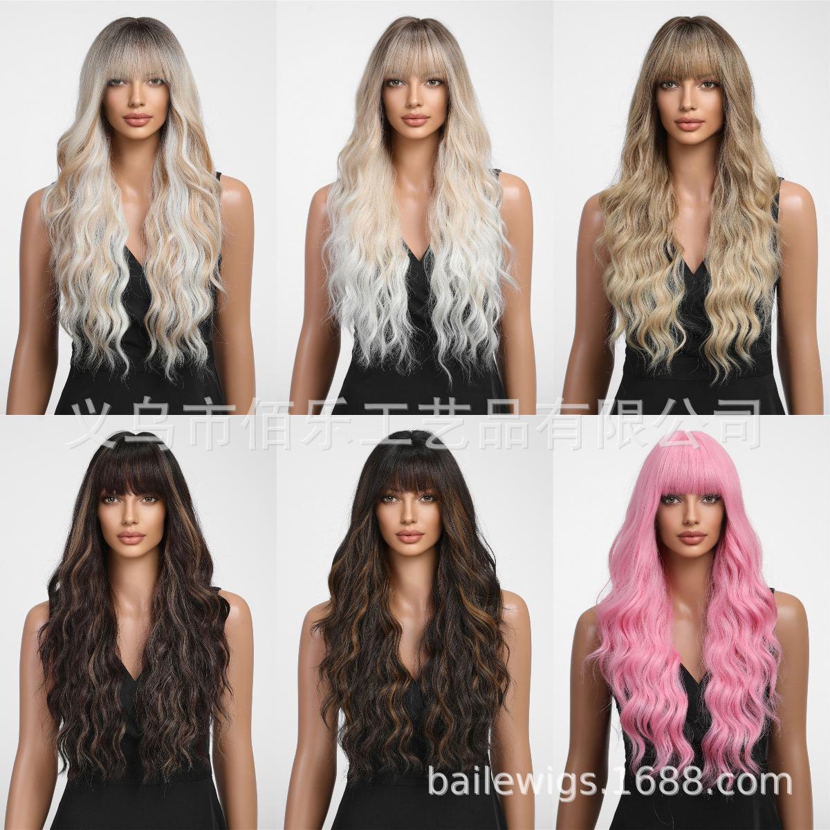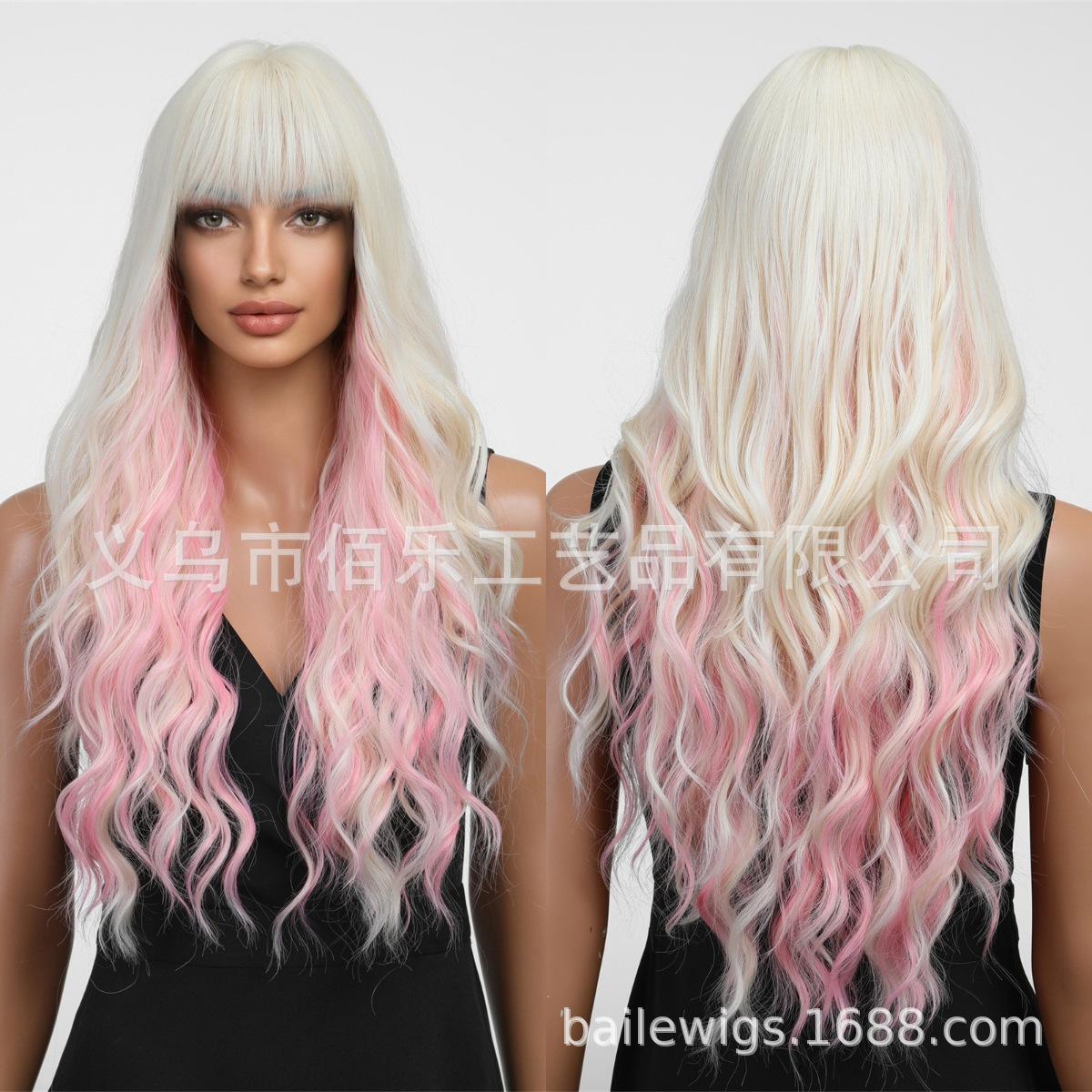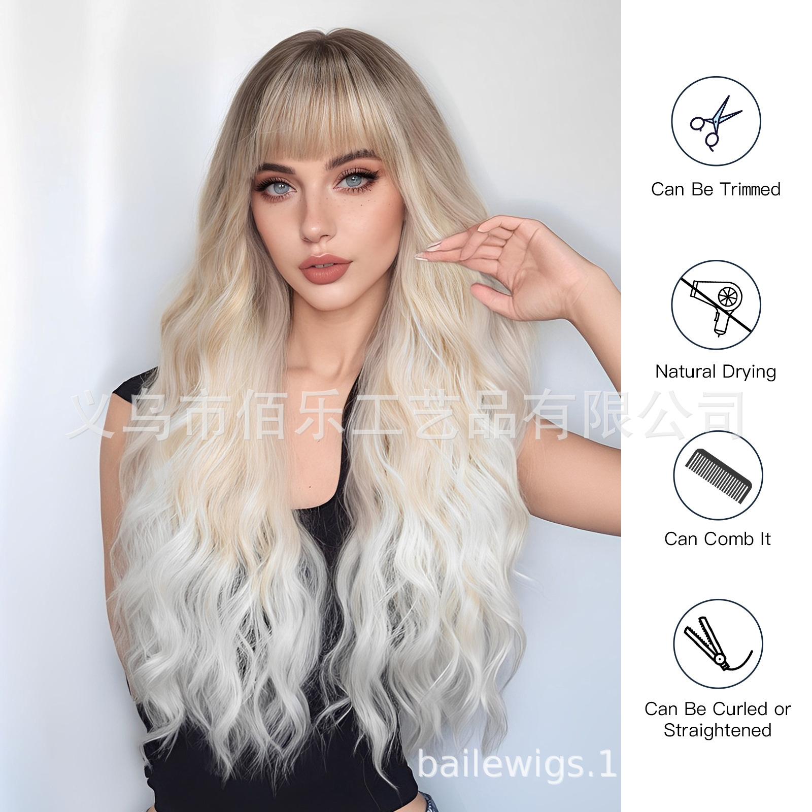 Peruca Amazon Hot Long Curly Hair Fibra Química Chapelaria Feminina com Bang Platinum Gradient Perucas Transfronteiriças em estoque Atacado