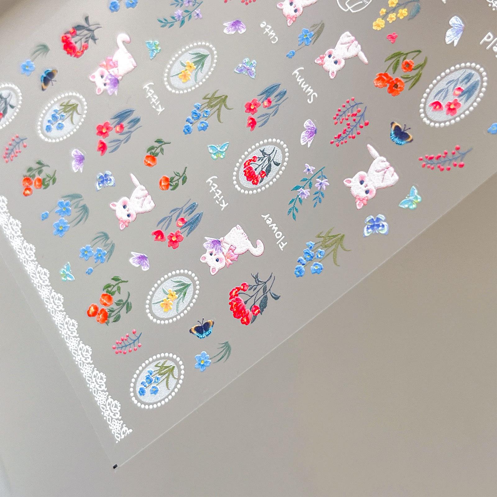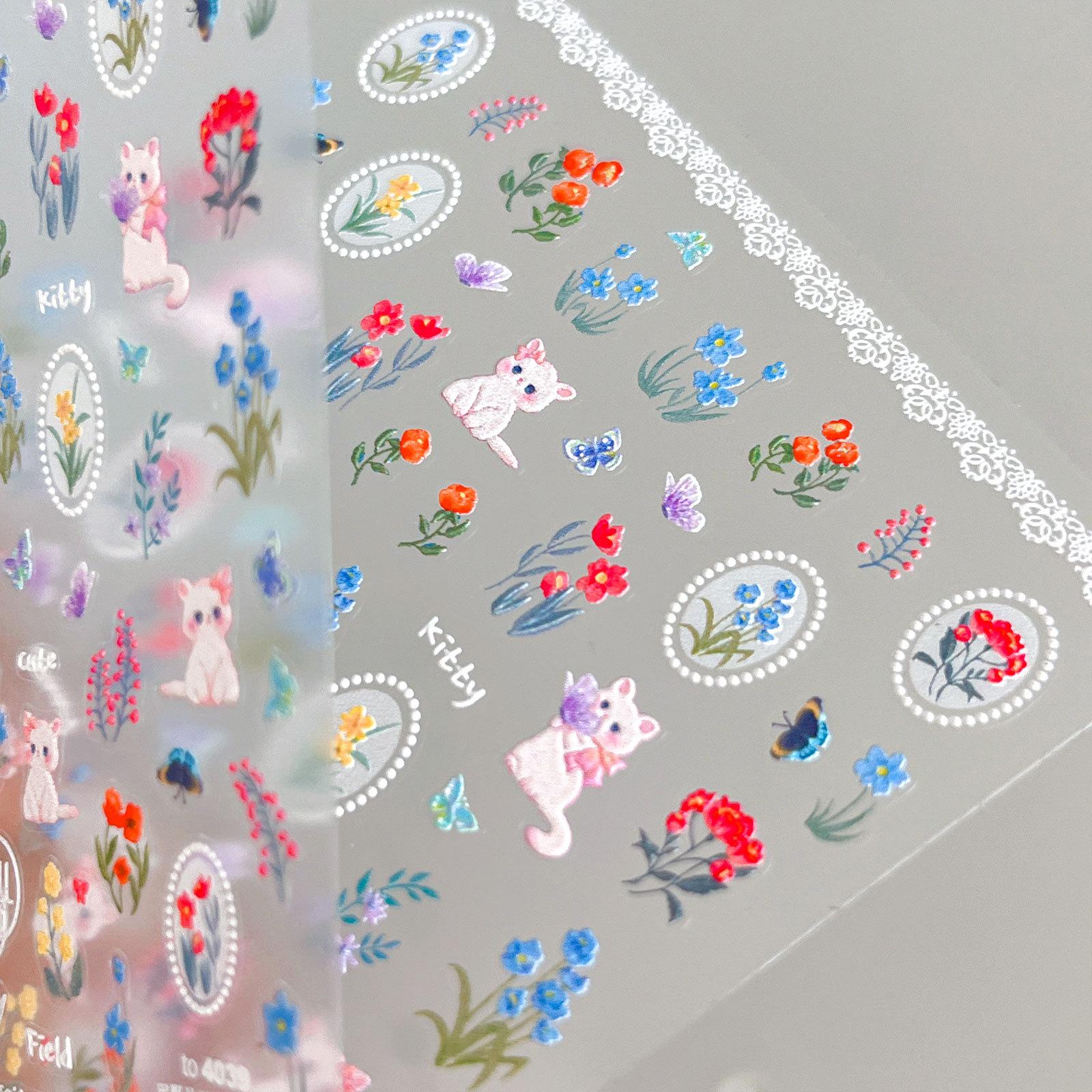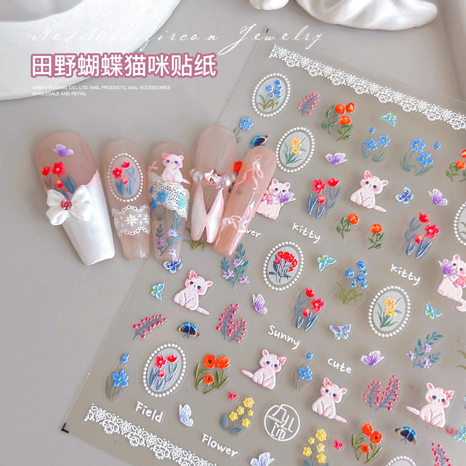 Adesivos de unha de gato borboleta de campo fofos pastorais adesivos de unha de alívio de flor de borboleta romântica atacado