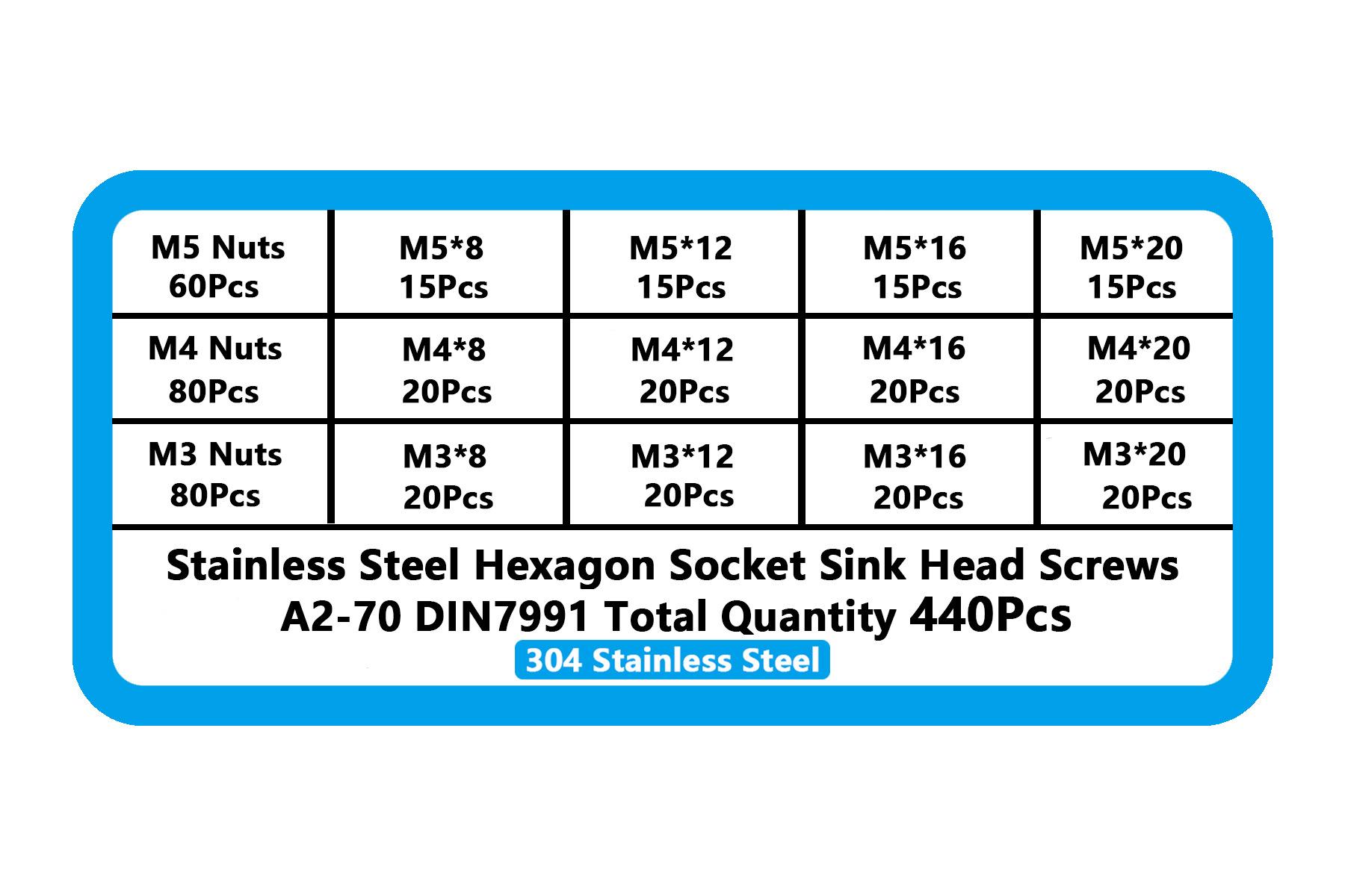 500 peças M3 M4 M5 Comércio Exterior Aço Inoxidável 304 Cabeça Escareada Parafusos Hexagonais Conjunto de Combinação A2-7991