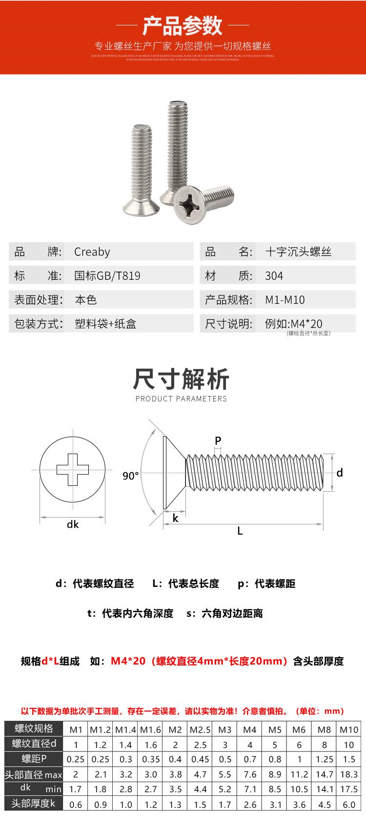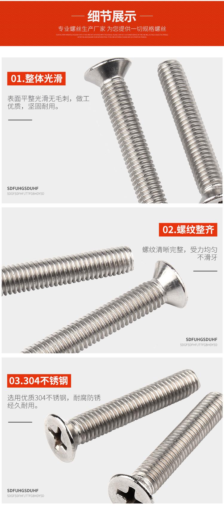 304 Parafuso de cabeça chata cruzada de aço inoxidável Parafuso de cabeça chata Parafuso de cabeça escareada
