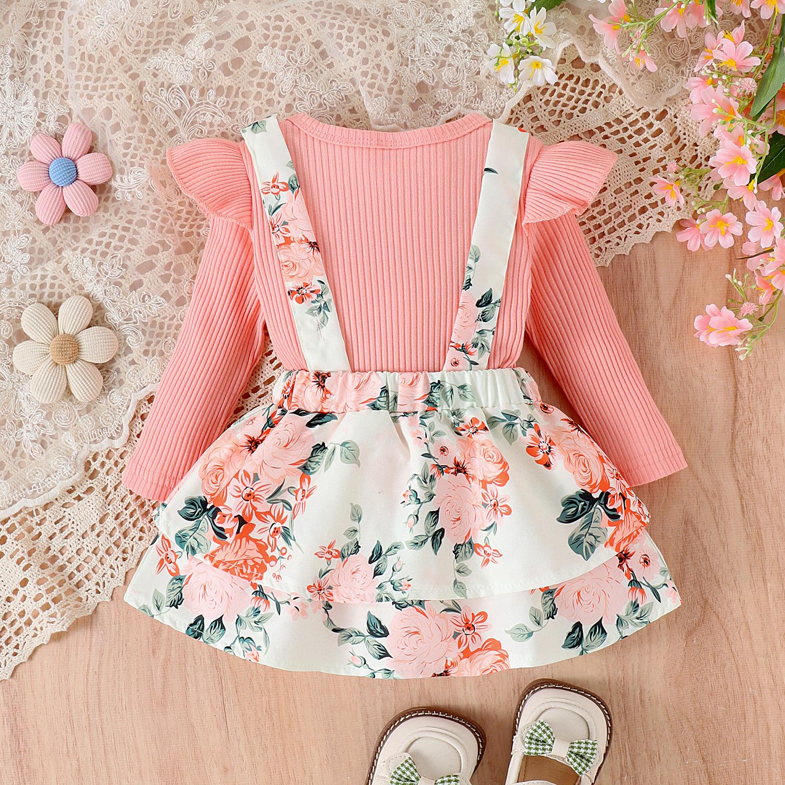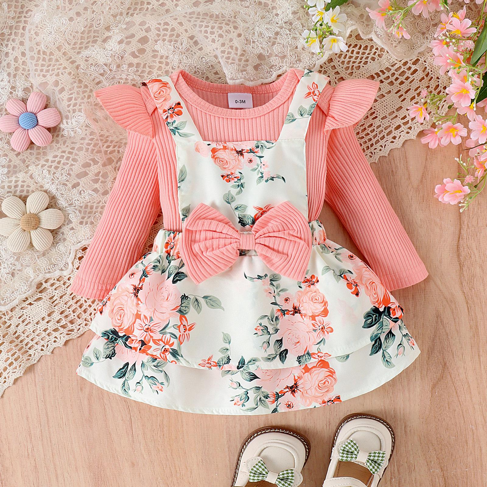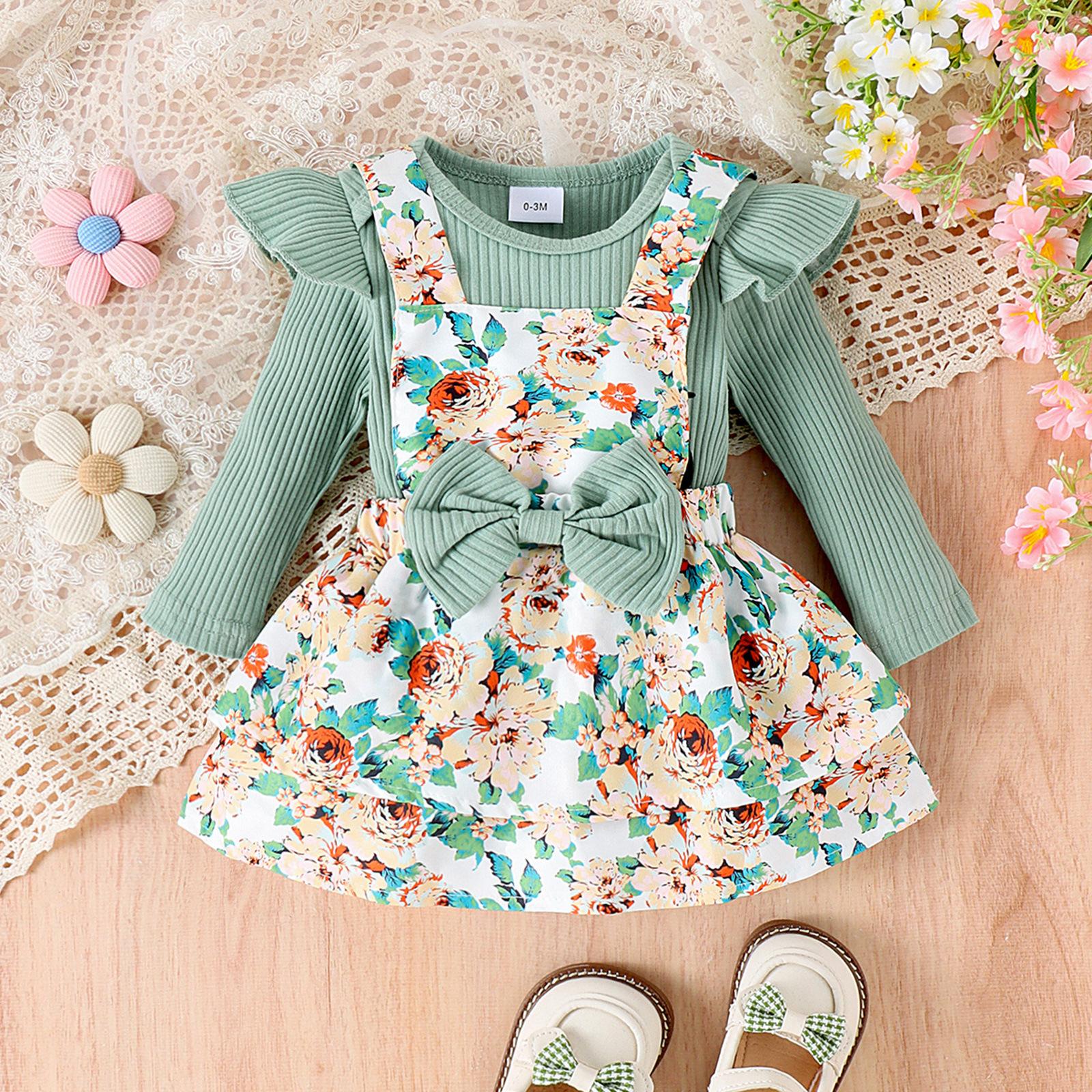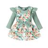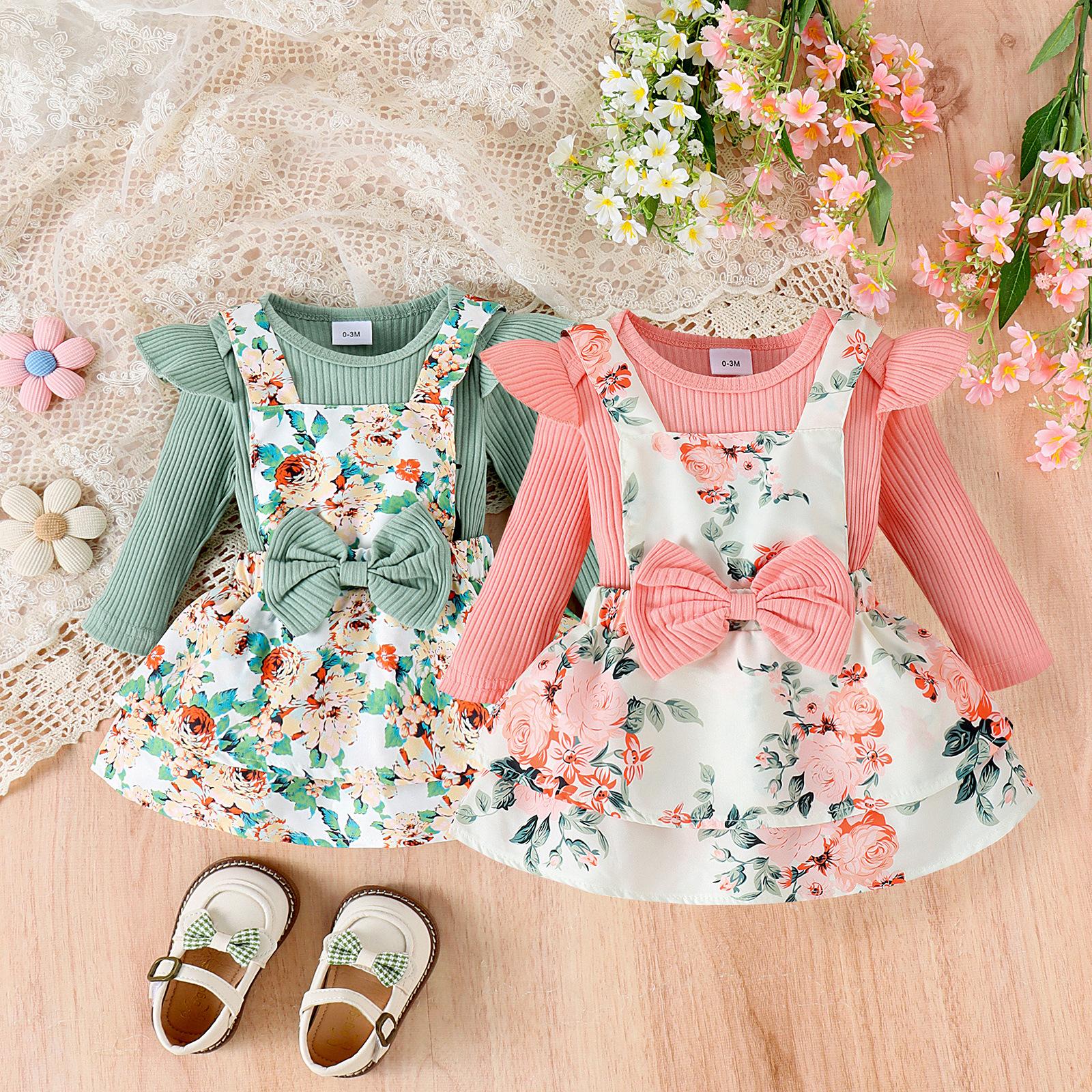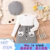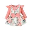 Conjunto Infantil Europeu e Americano de Outono e Inverno da Amazon Top de Manga Comprida Cor Pura Saia Suspender com Laço Estampado Conjunto de Duas Peças