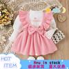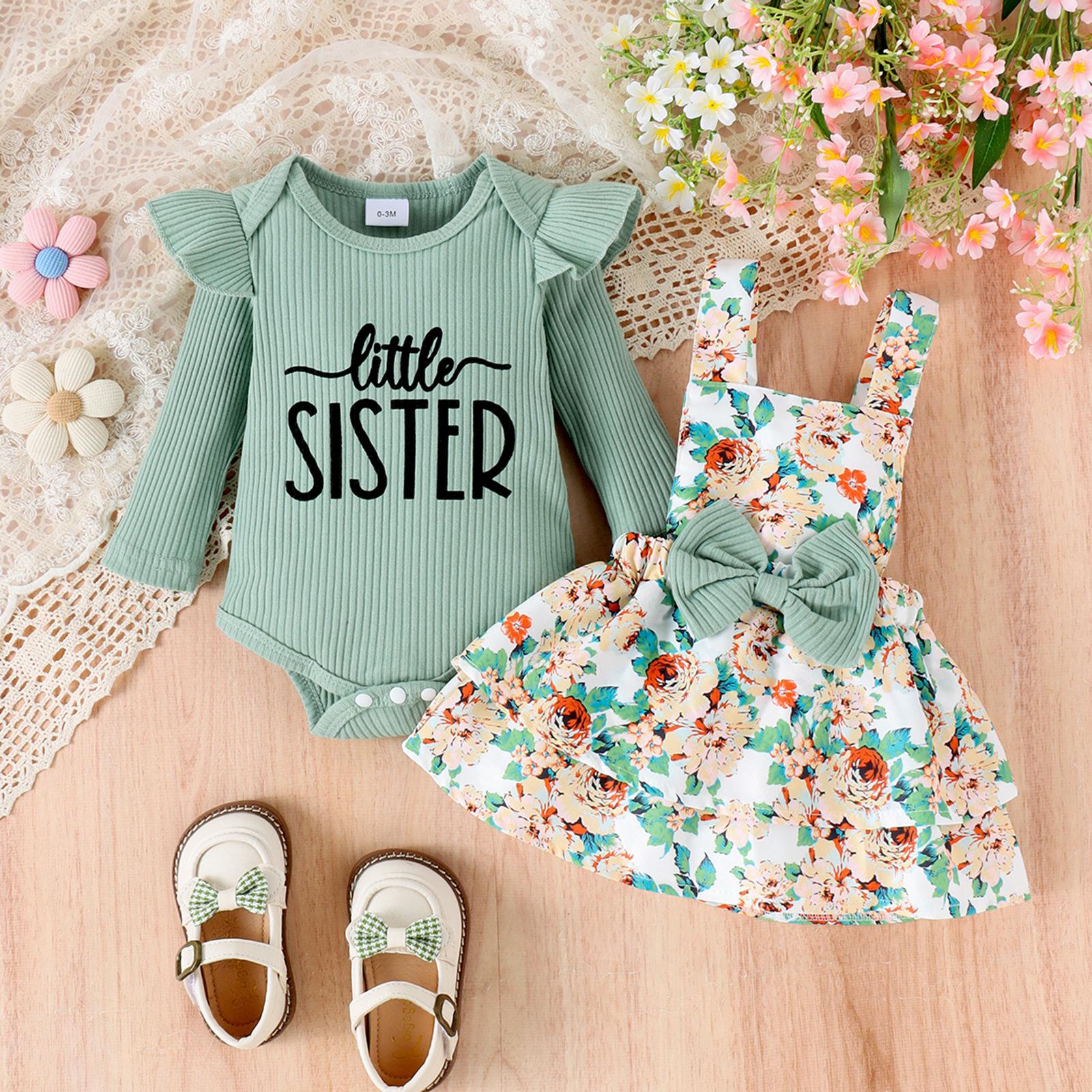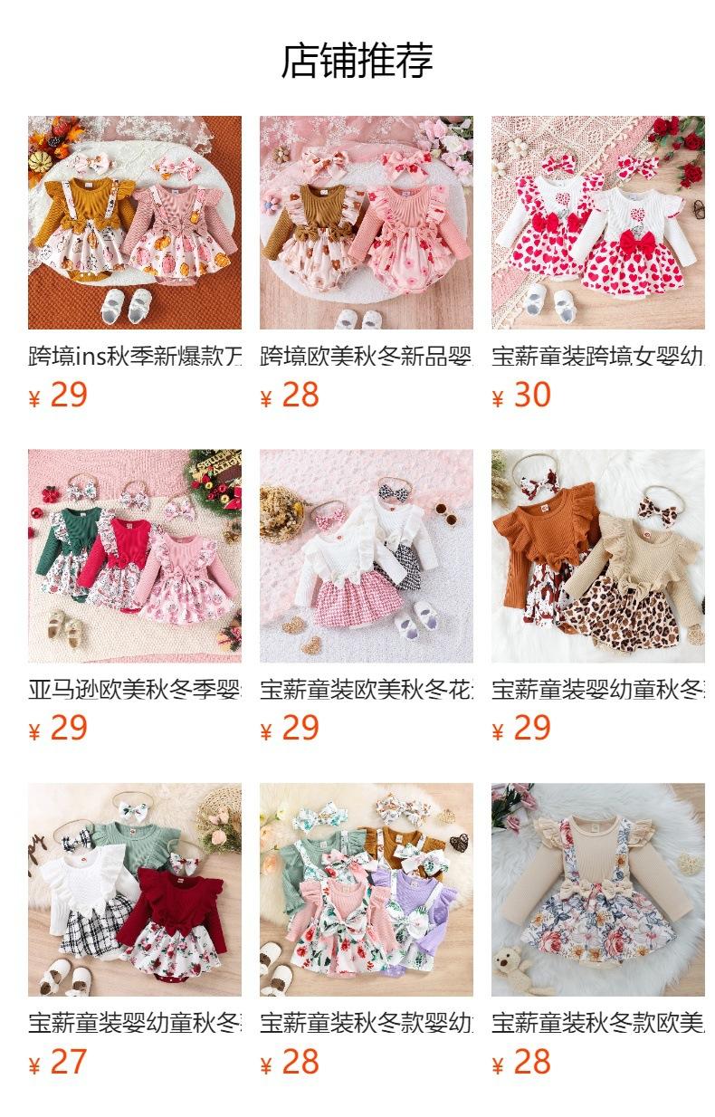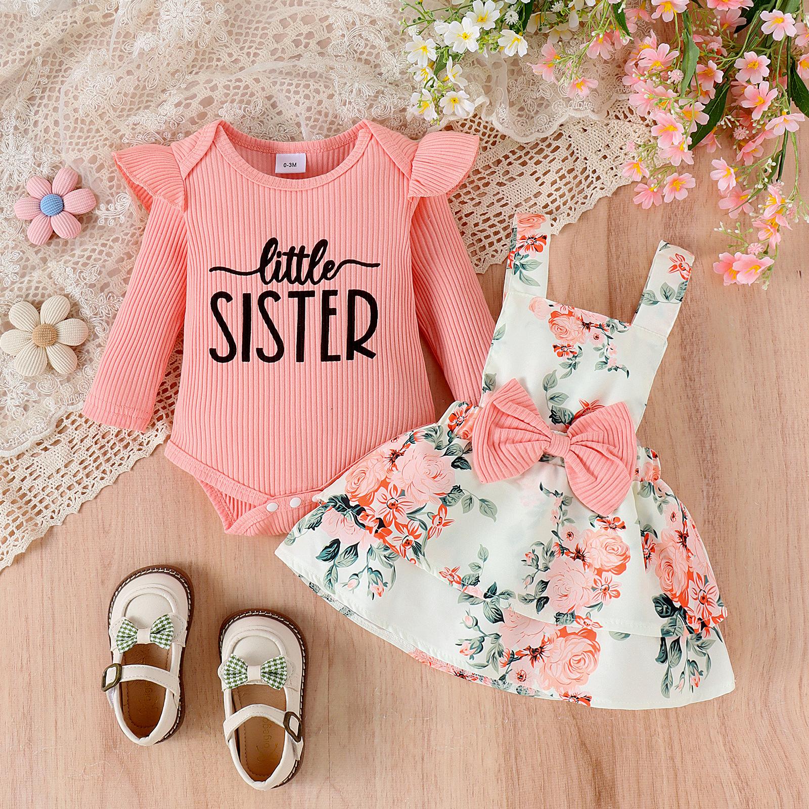 Conjunto Infantil Europeu e Americano de Outono e Inverno da Amazon Top de Manga Comprida Cor Pura Saia Suspender com Laço Estampado Conjunto de Duas Peças