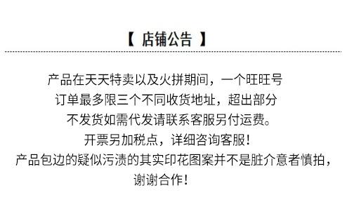 Durante a venda especial diária e o período de venda quente, um pedido de conta Wangwang é limitado a três endereços de entrega diferentes. O excesso não será enviado. Se você precisar enviar em seu nome, entre em contato com o atendimento ao cliente para pagar a taxa de envio. Pontos de imposto serão adicionados à fatura, consulte o atendimento ao cliente para obter detalhes!