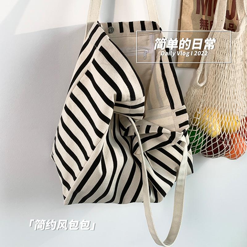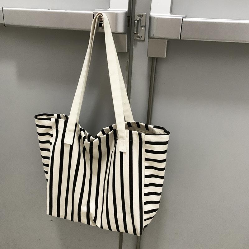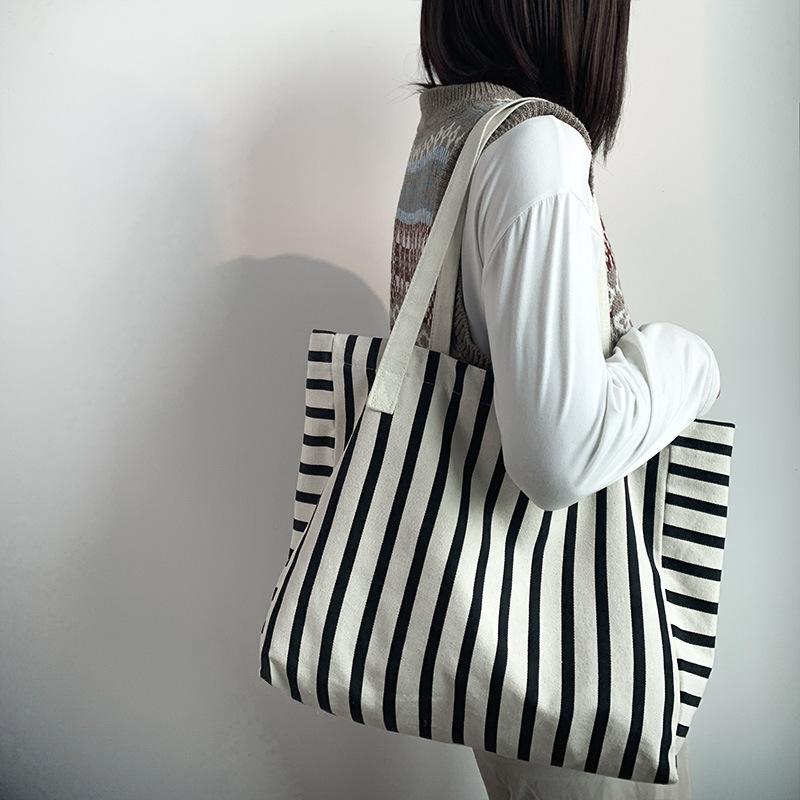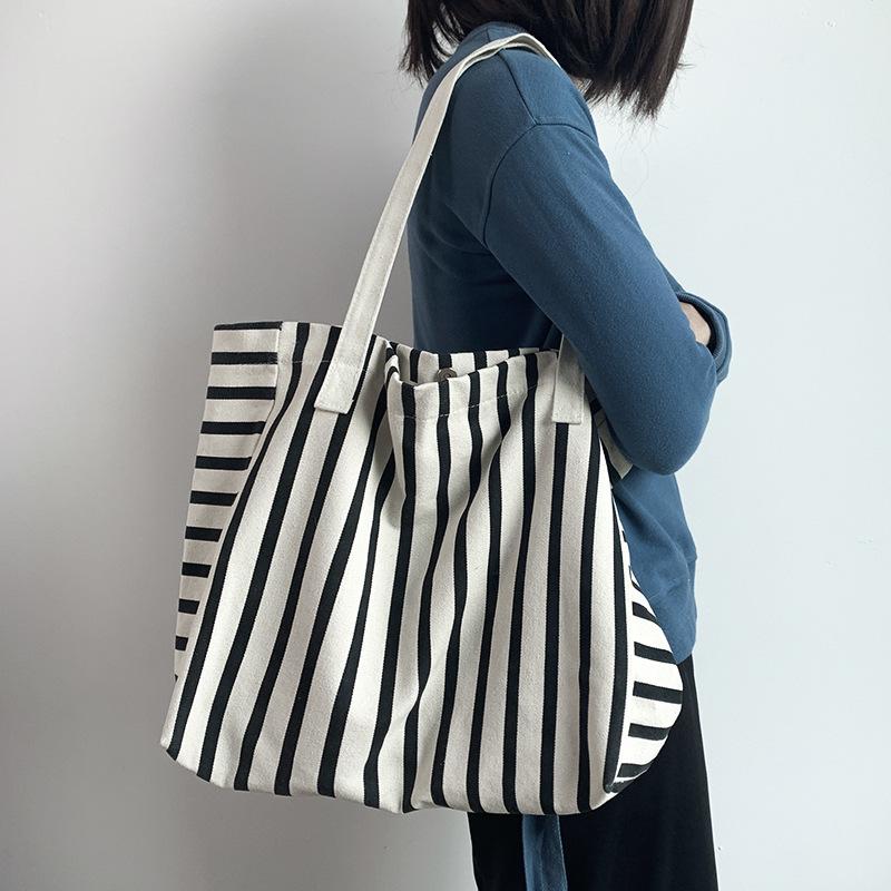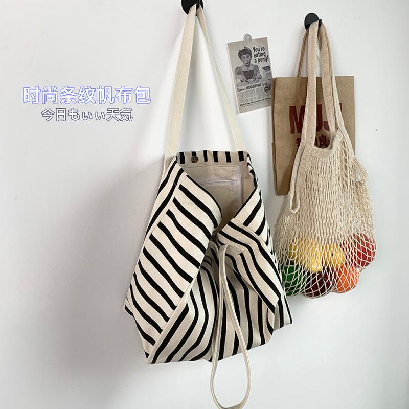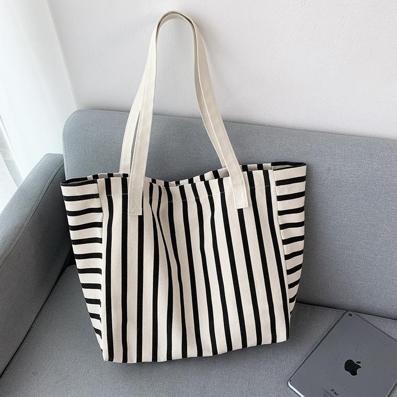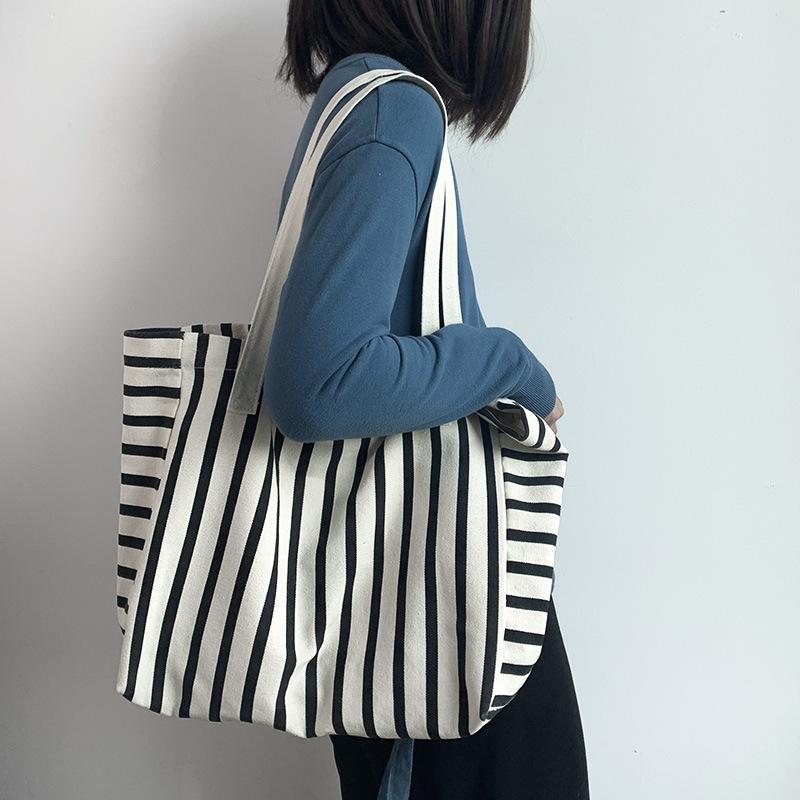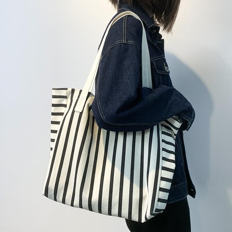 Nova Bolsa de Lona Listrada Bolsa de Ombro Feminina Grande Capacidade Bolsa Escolar para Estudantes Ins Japonês e Coreano Bolsa de Compras Sacola