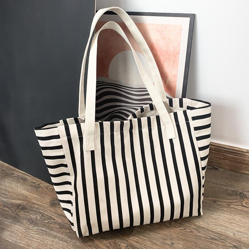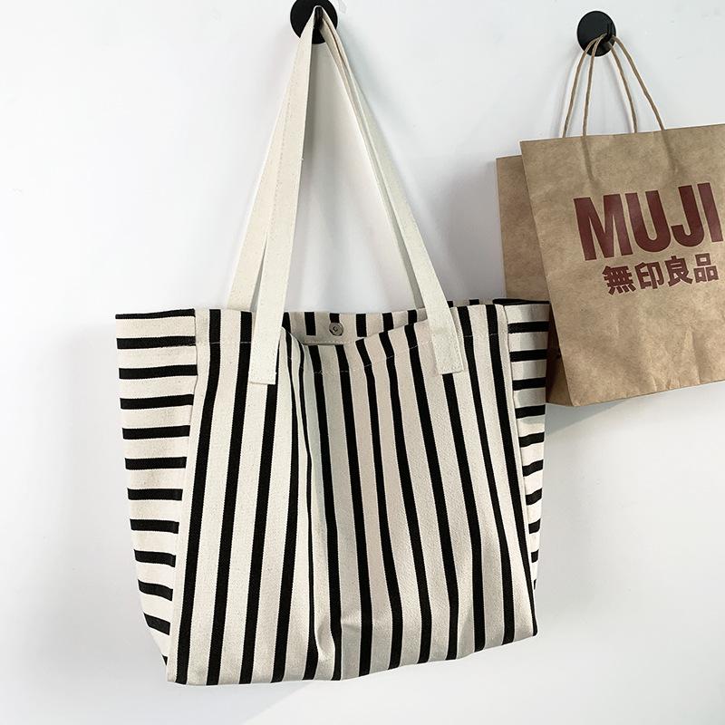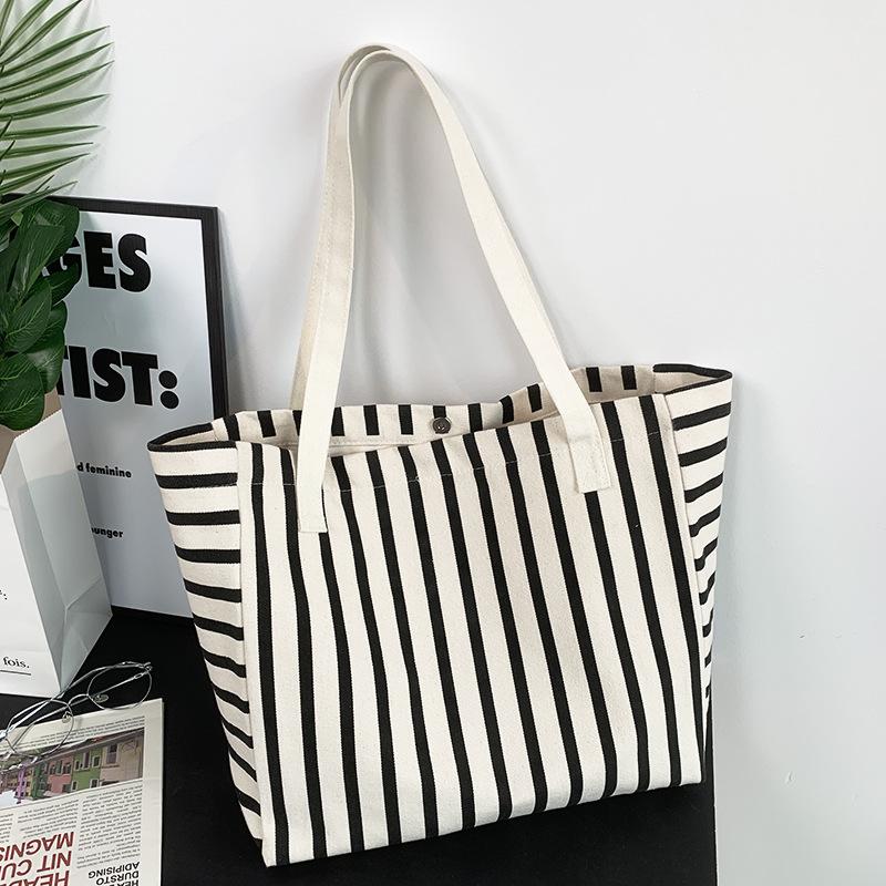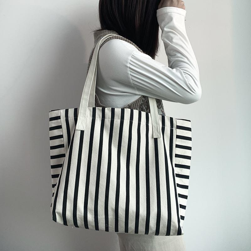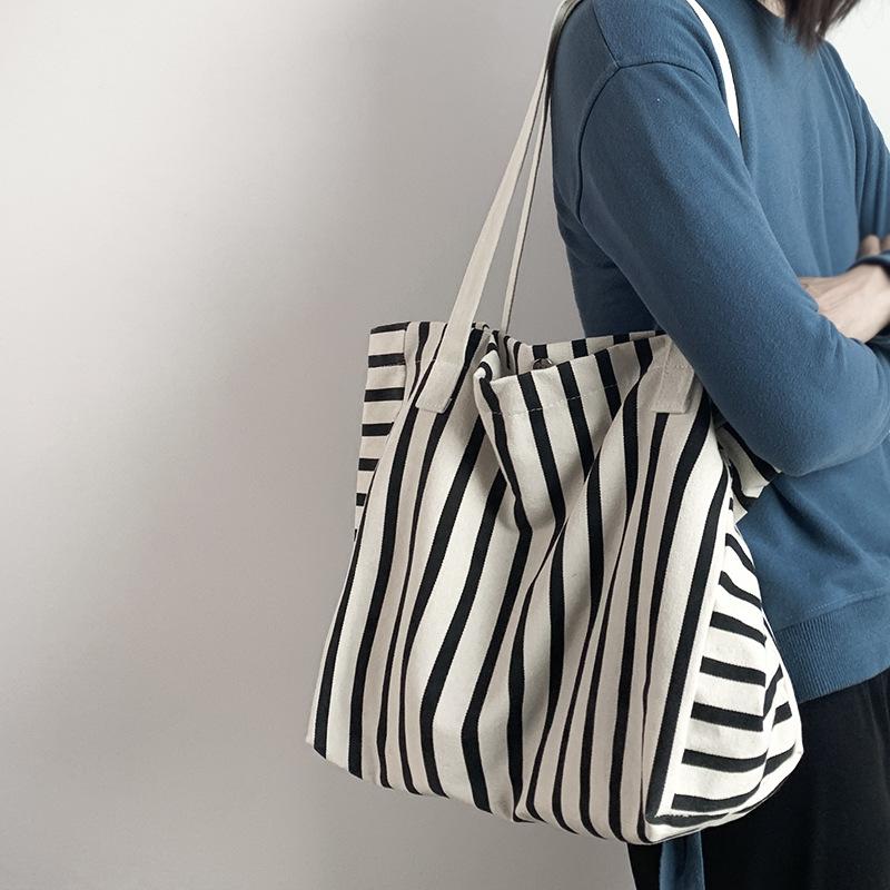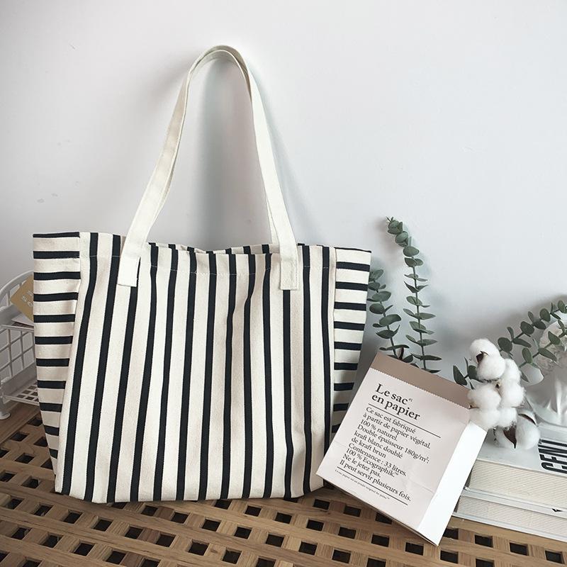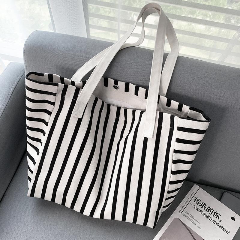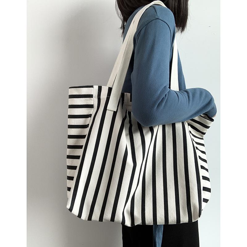 Nova Bolsa de Lona Listrada Bolsa de Ombro Feminina Grande Capacidade Bolsa Escolar para Estudantes Ins Japonês e Coreano Bolsa de Compras Sacola
