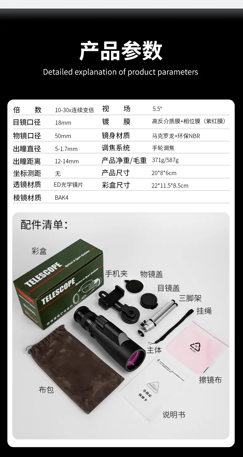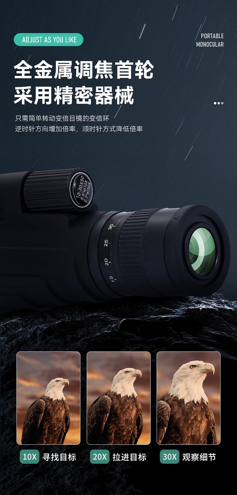 Atacado de Fabricantes Transfronteiriços Telescópio Monocular com Zoom de 10-30x Alta Definição Alta Ampliação Grande Campo de Visão Ed à Prova d'Água para Observação de Aves ao Ar Livre