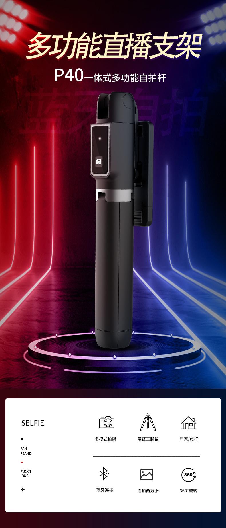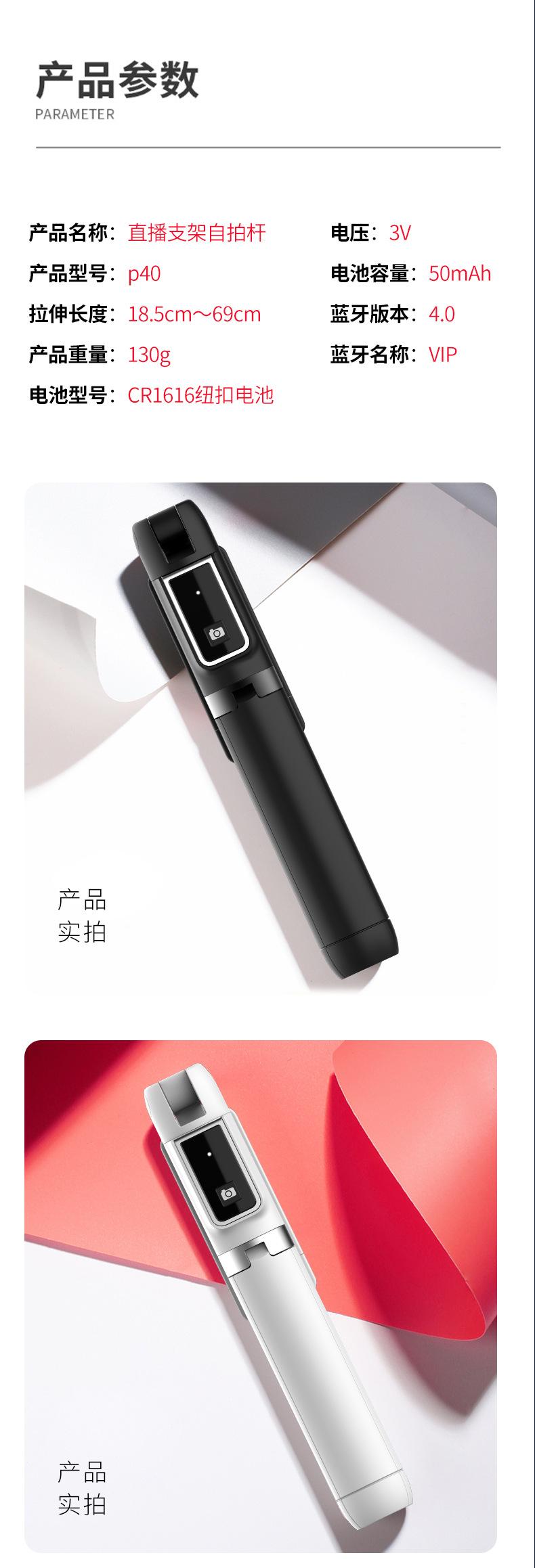 Bastão de Selfie Bluetooth P40, Bastão Integrado de Mão, Bastão Tripé Portátil para Transmissão ao Vivo e Fotografia, Disparo Vertical