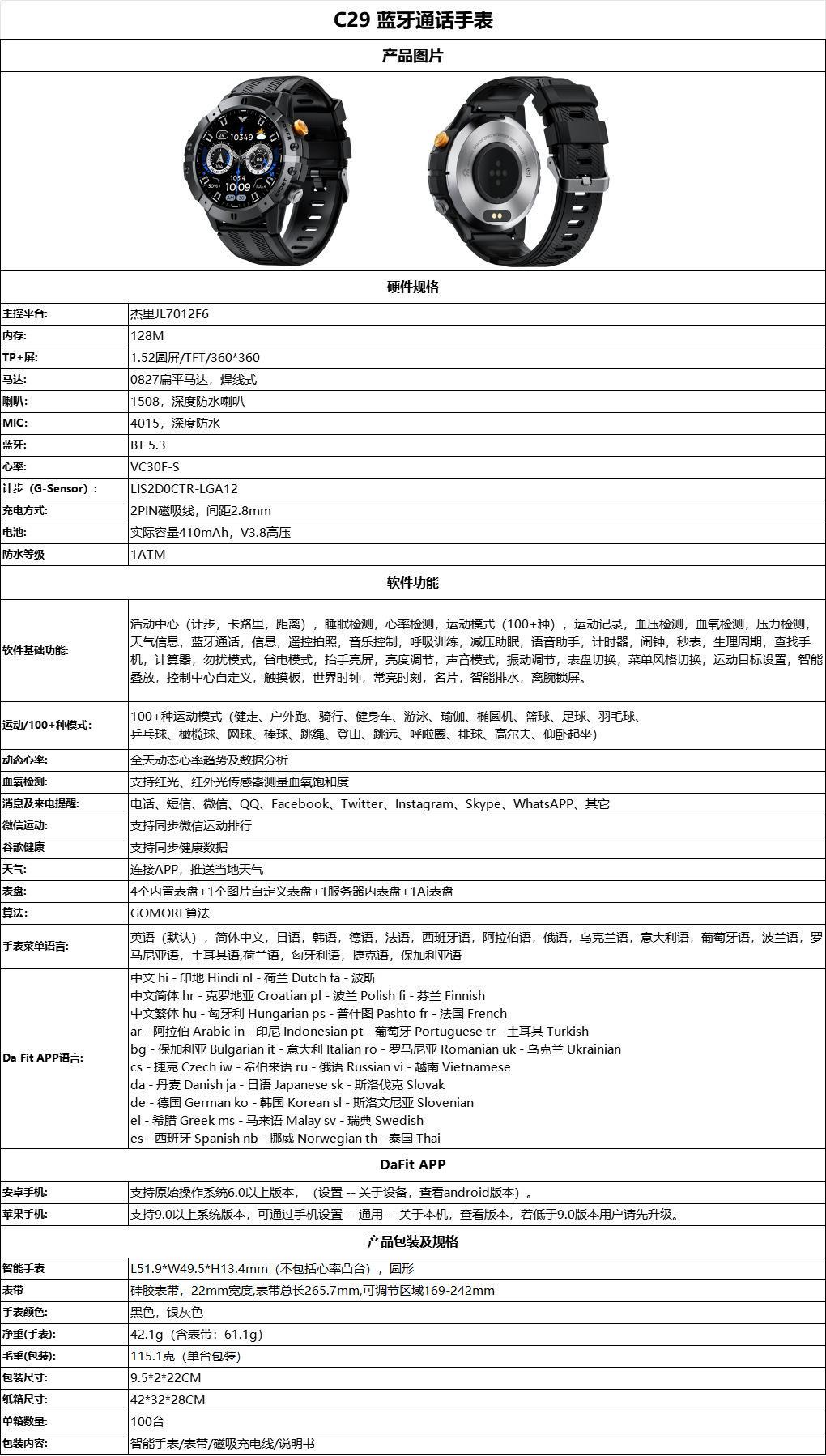 1.52 Chamada Bluetooth, modo multi-exercício, sono, frequência cardíaca, monitoramento da pressão arterial, música meteorológica, pulseira inteligente C29