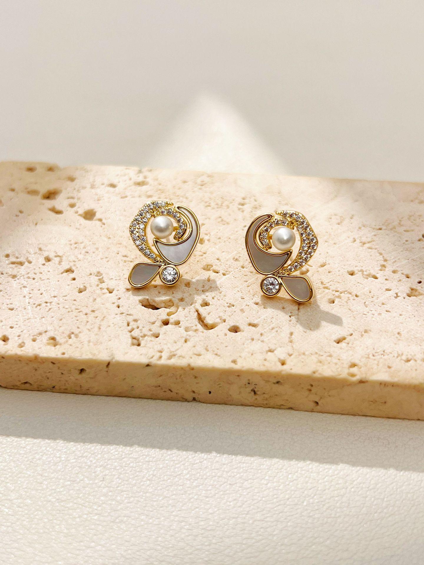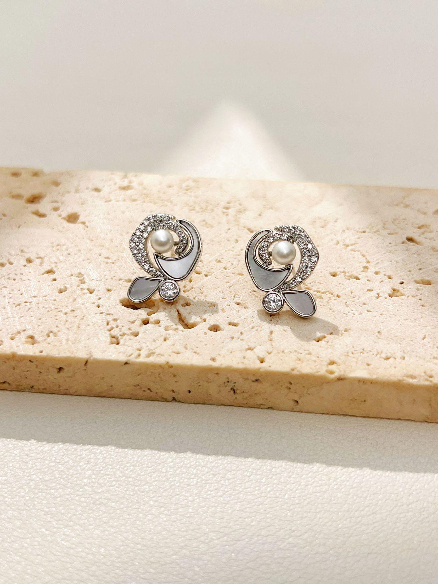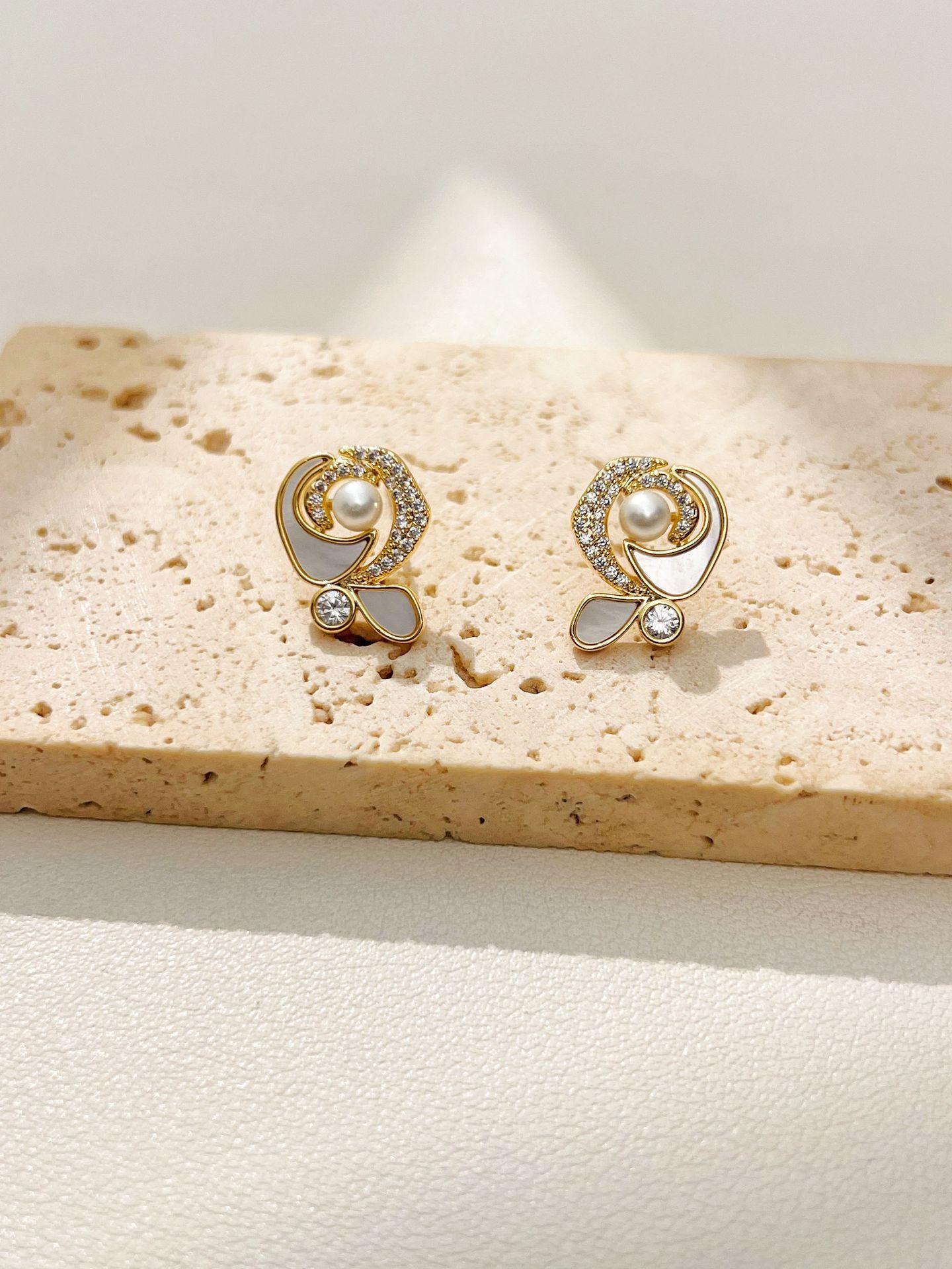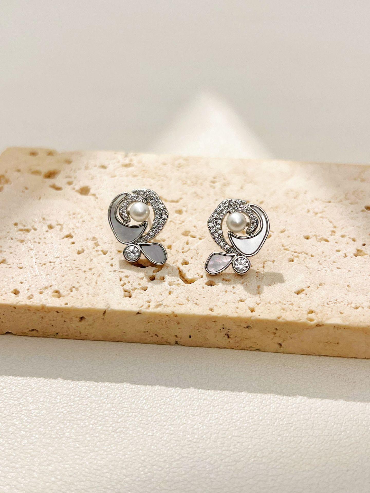 Novos Brincos de Flor Simples e Elegantes, Estilo Luxo Leve com Incrustações de Concha, Acessórios Versáteis para Mulheres