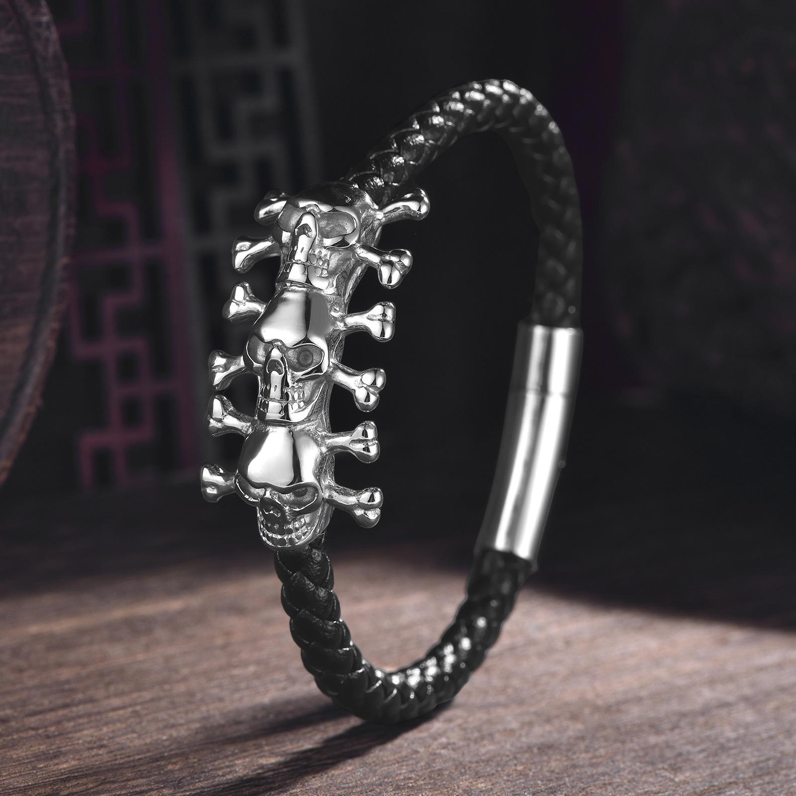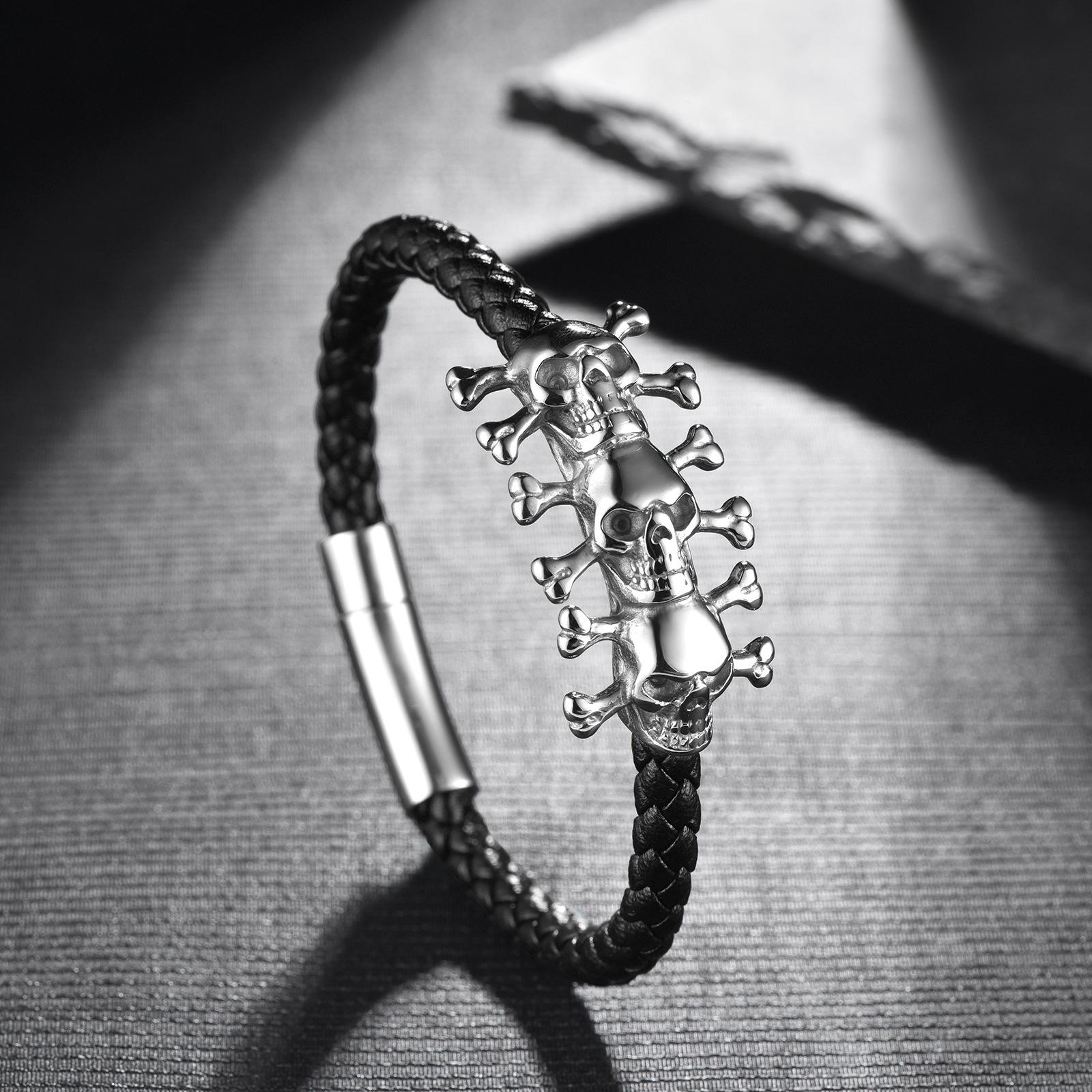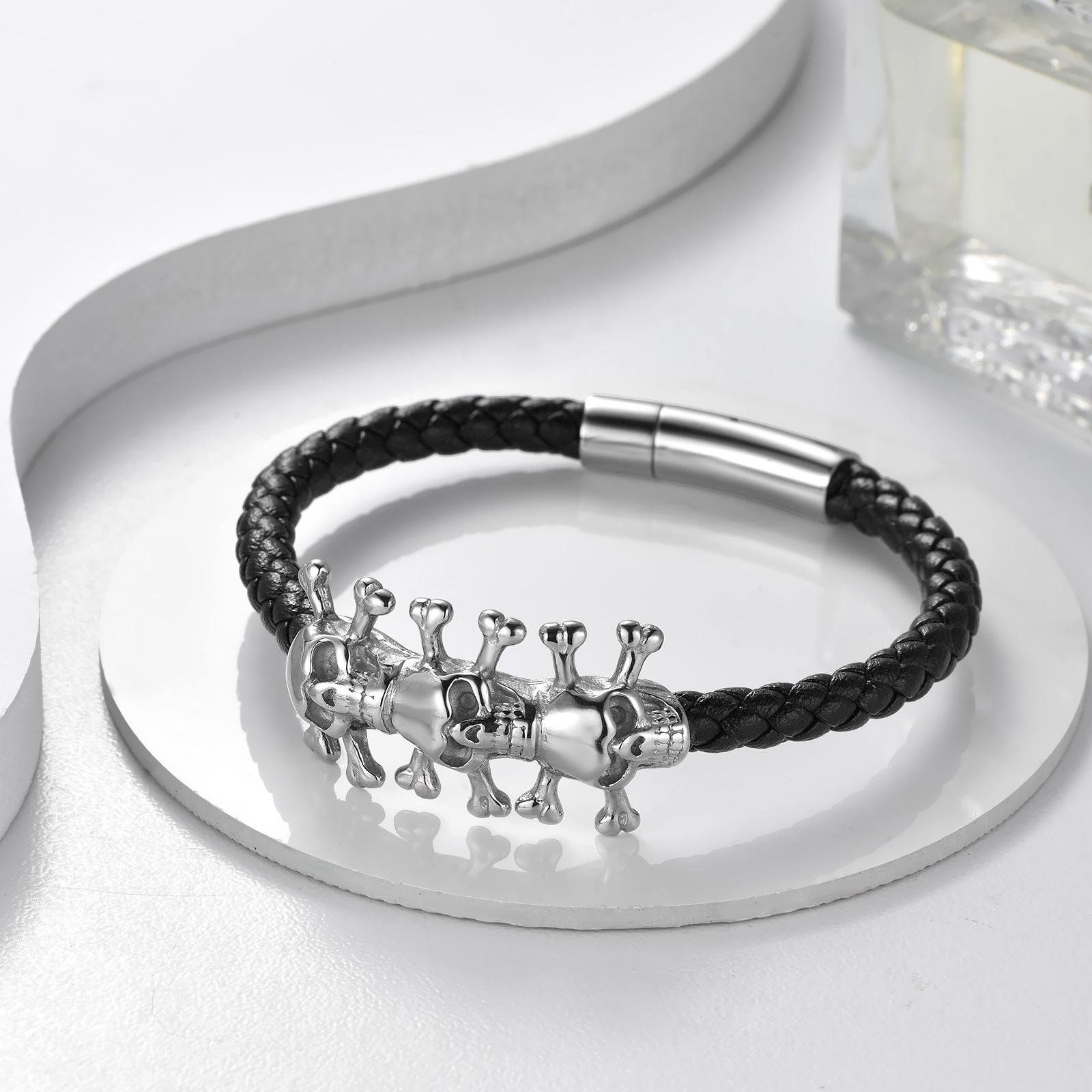 Pulseira de caveira criativa de personalidade europeia e americana, nova pulseira de couro trançado masculina, joias de casal de aço inoxidável transfronteiriças