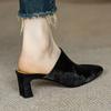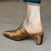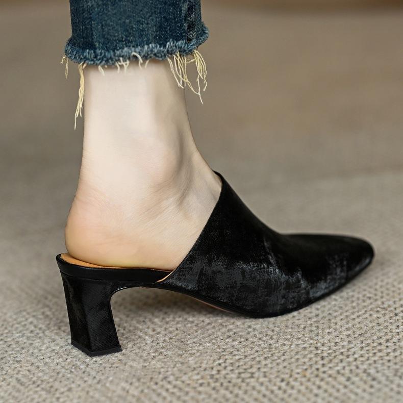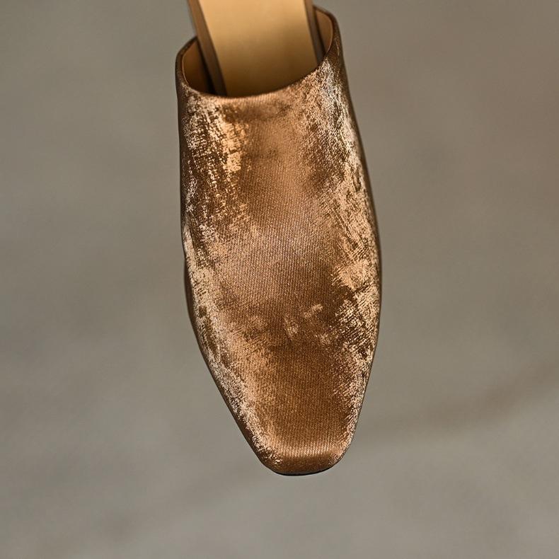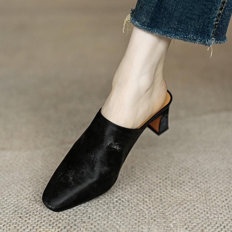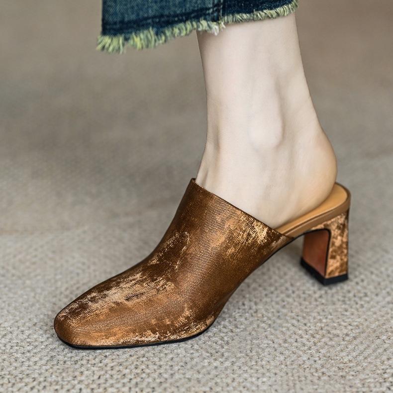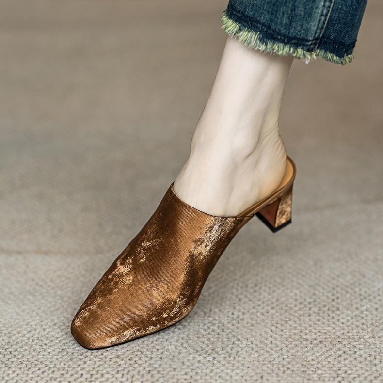 Compre Sandálias e chinelos de seda para mulheres 2024 Novo estilo de uso externo Salto grosso marrom francês salto alto Baotou Half Slippers no atacado no Joom.pro