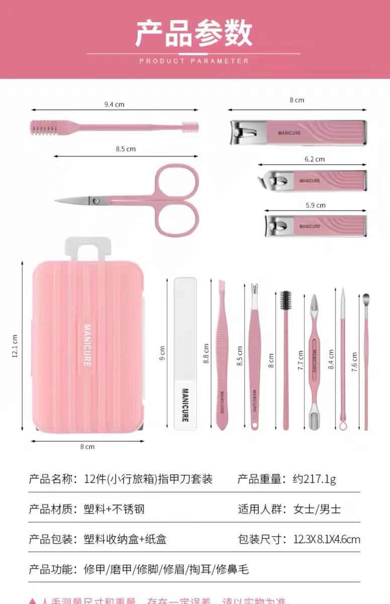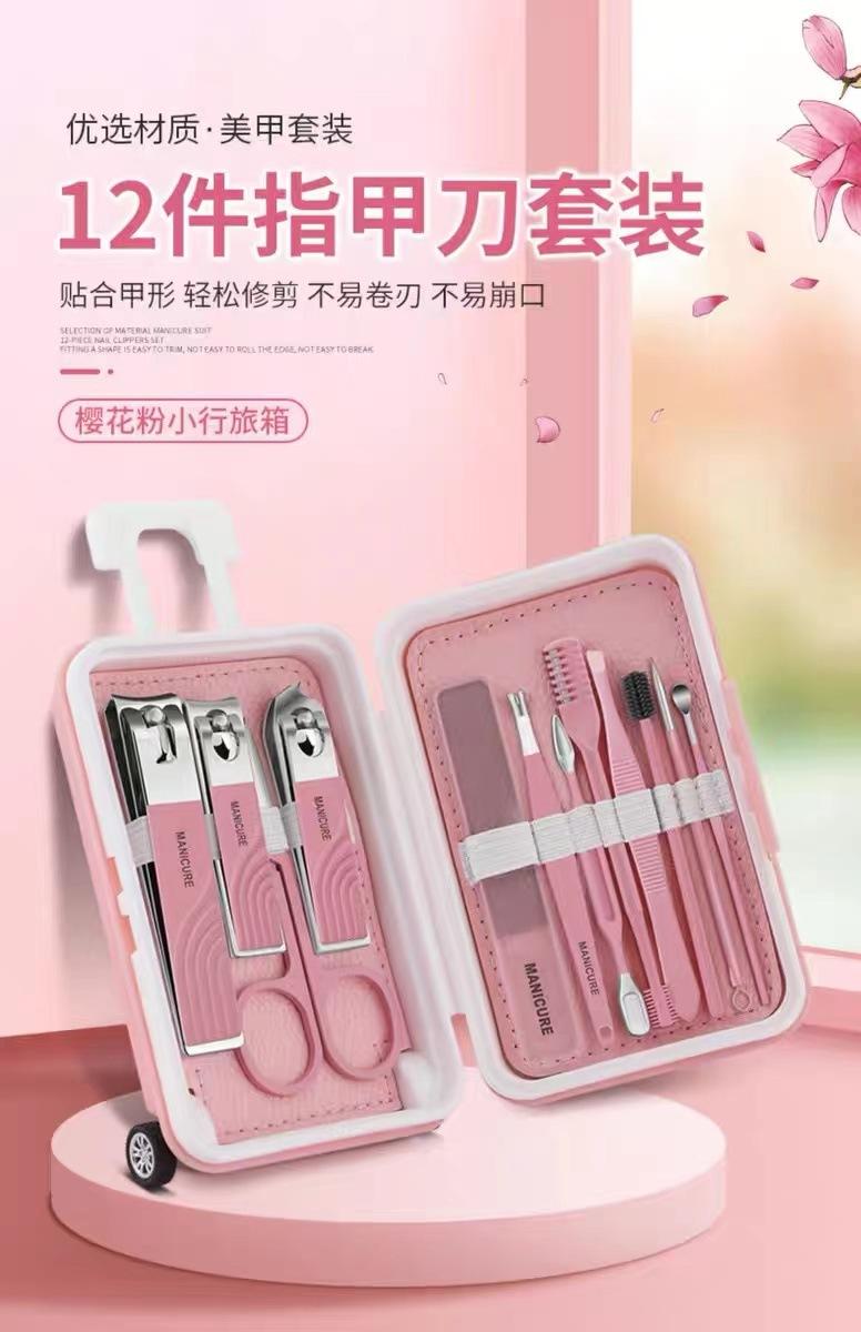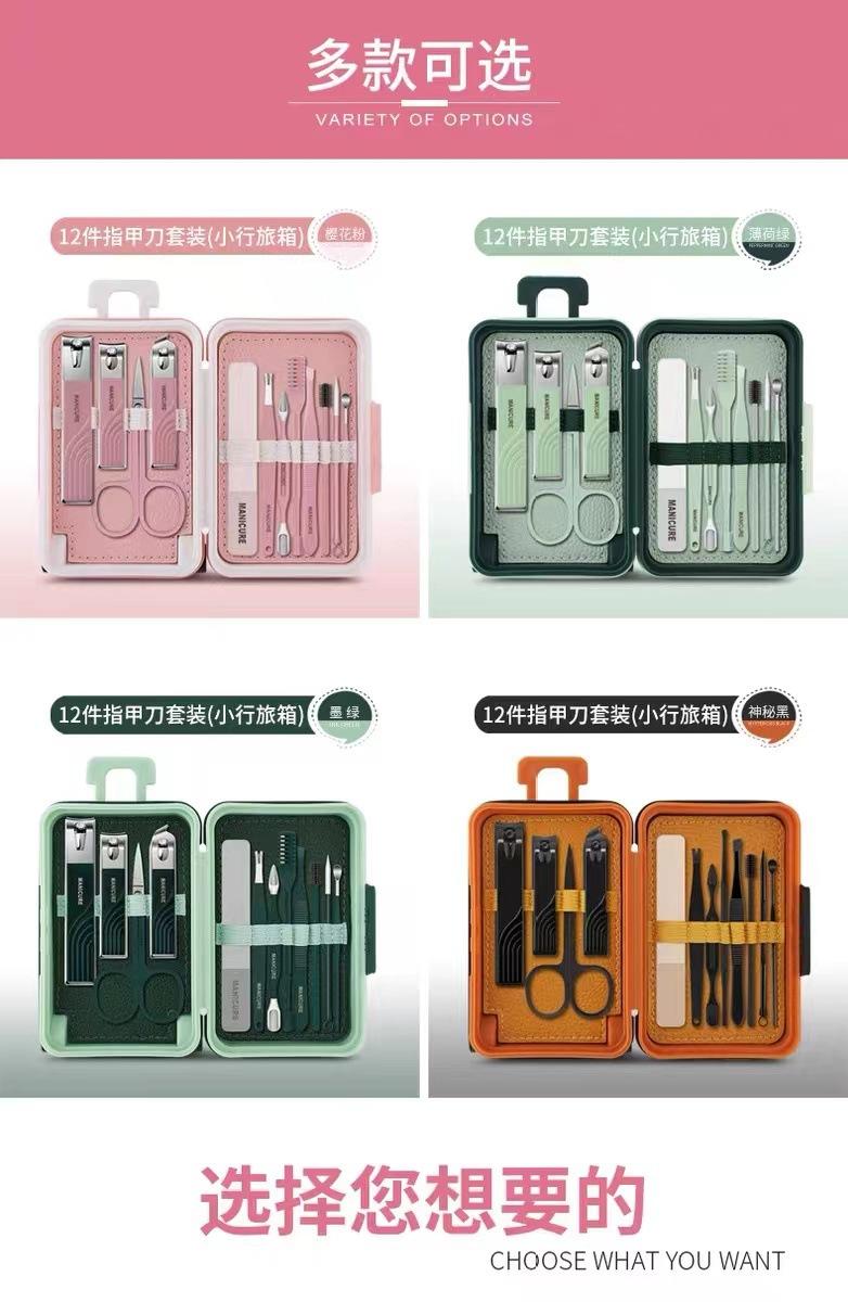Caixa de viagem portátil transfronteiriça em estoque, conjunto de 12 peças de cortadores de unha, cortadores de unha grandes, manicure, ferramenta de cortadores de unha, conjunto completo
