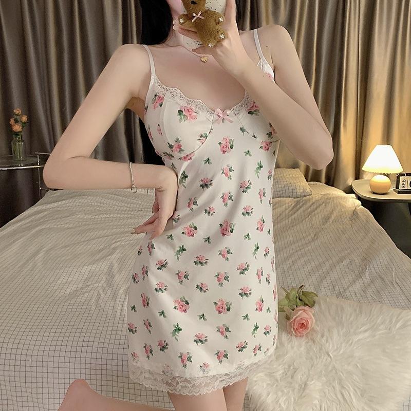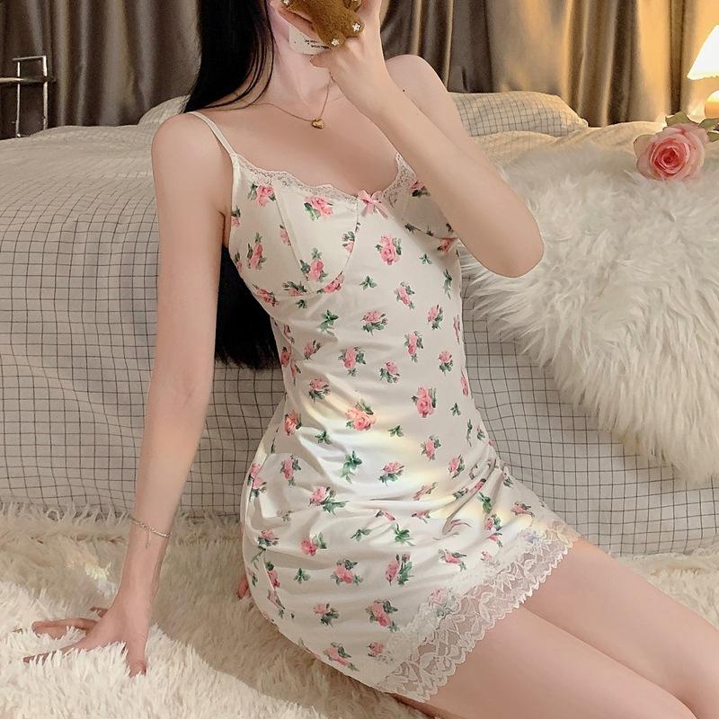 Compre Loja Física Pijama Sexy Sem Almofada Camisola Feminina de Verão Sling Puro Desejo Estilo Floral Saia Curta Slim Fit Imitação de Algodão Renda no atacado no Joom.pro