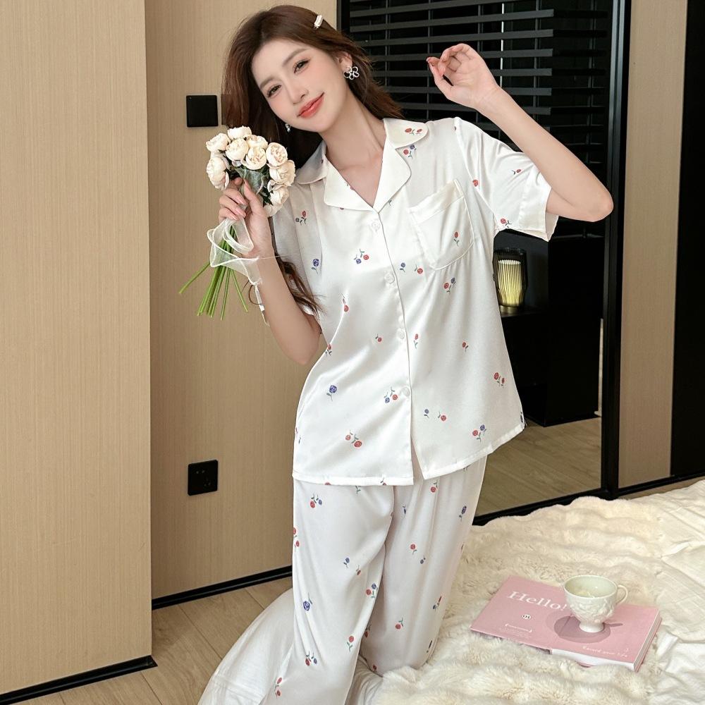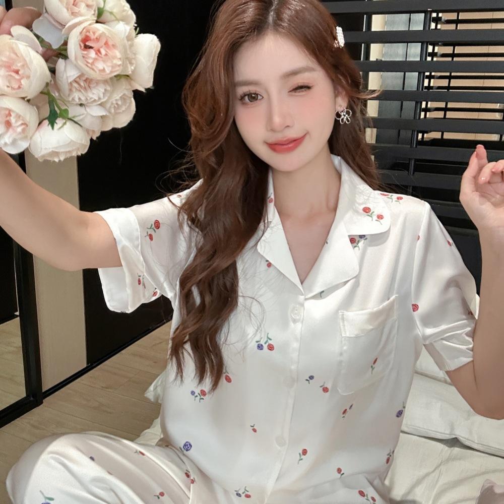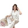 Novo pijama feminino de seda de verão, calça de manga curta, roupa de casa fina e doce para o verão