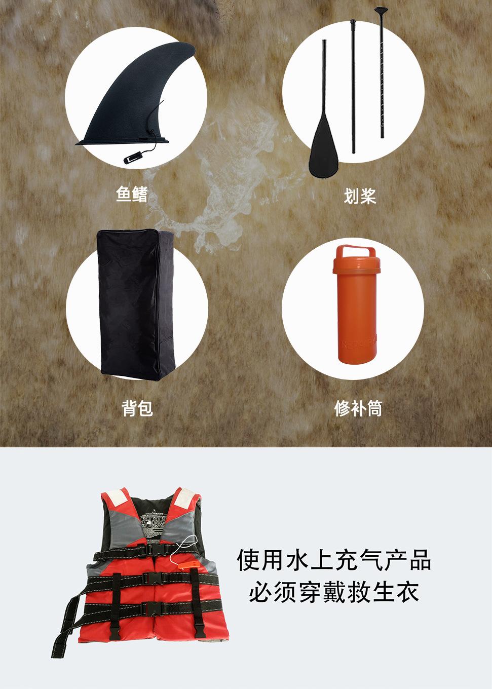 Acessórios: corda de apoio, bomba, remo, bolsa, nadadeiras, manual de instruções, balde de reparo.