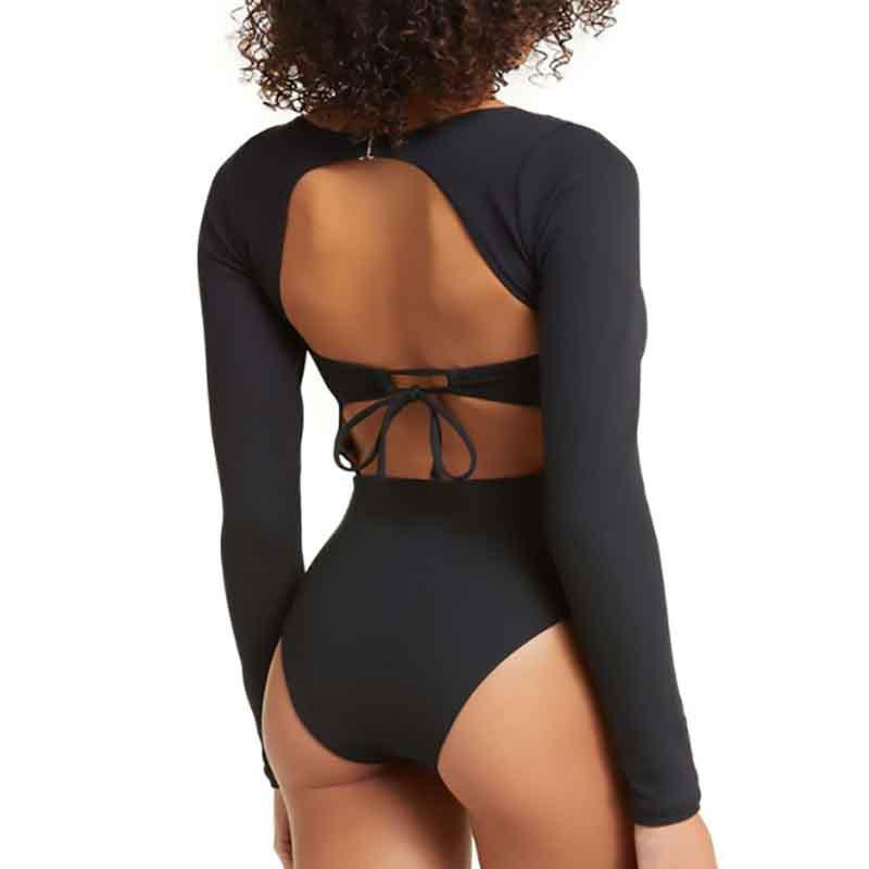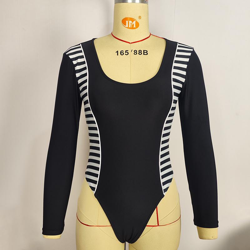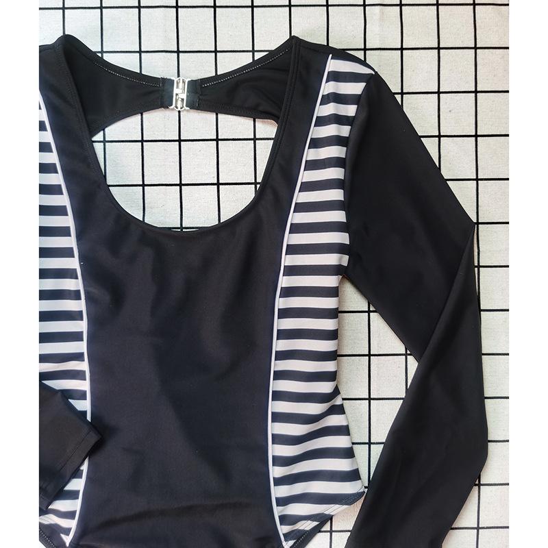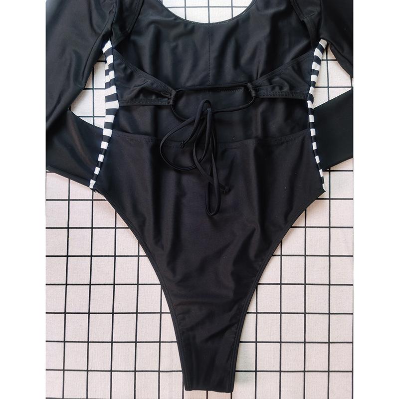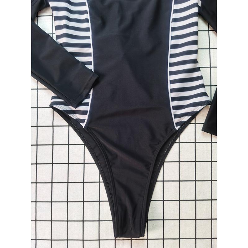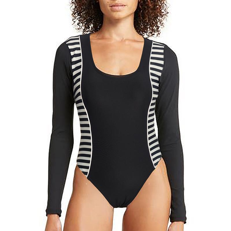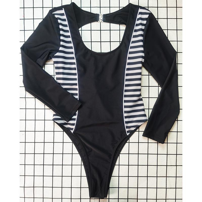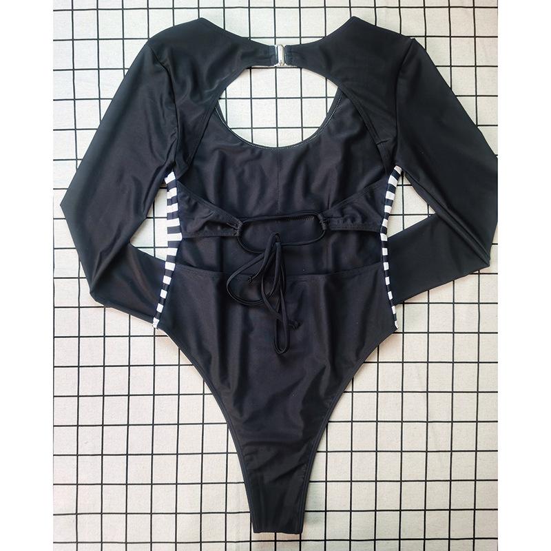 Novo Maiô Feminino Costura Color-blocking uma peça sem encosto manga comprida Europeu e Americano sexy protetor solar feminino maiô praia terno de surf