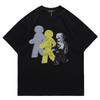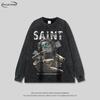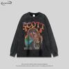 Vintage Moda Nacional T-shirt Americano Hip Hop Street Cartoon Impresso Em Torno Do Pescoço Top Lavado Solto Manga Comprida T-shirt para Homens e Mulheres Outono