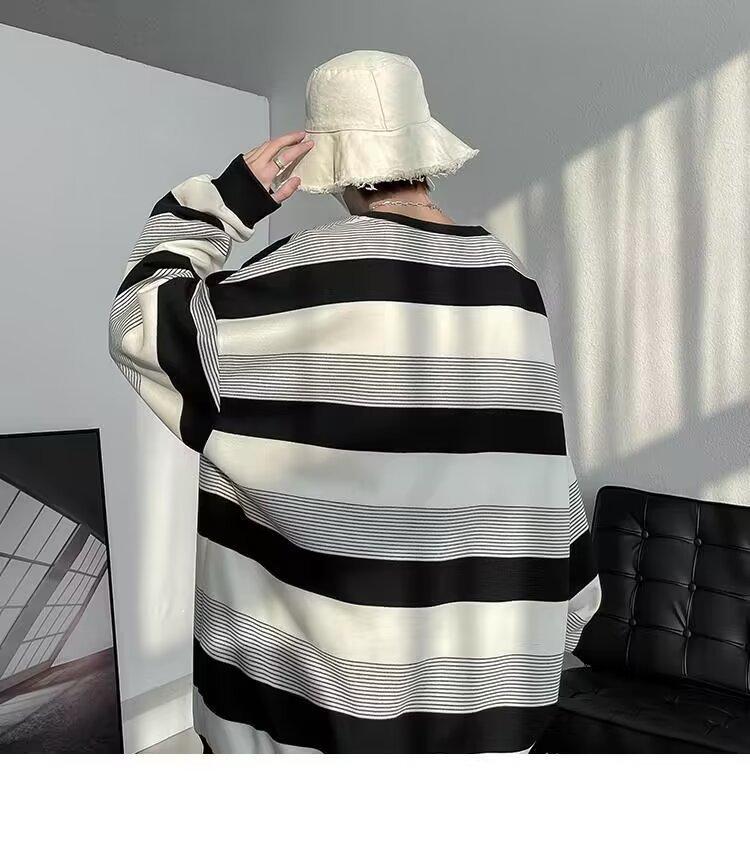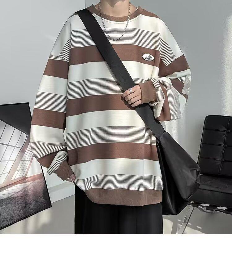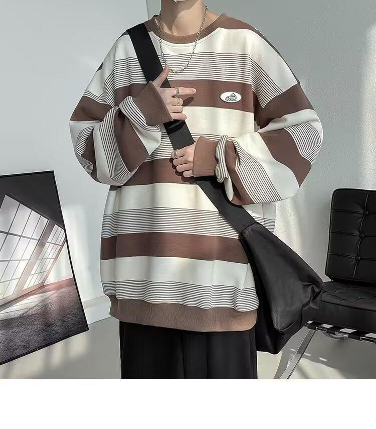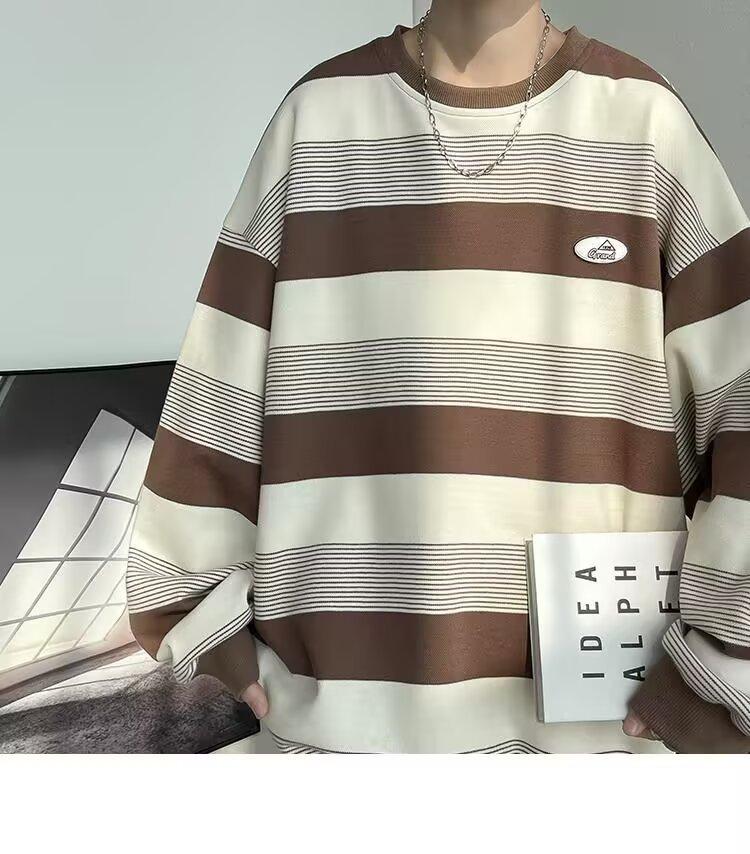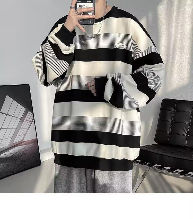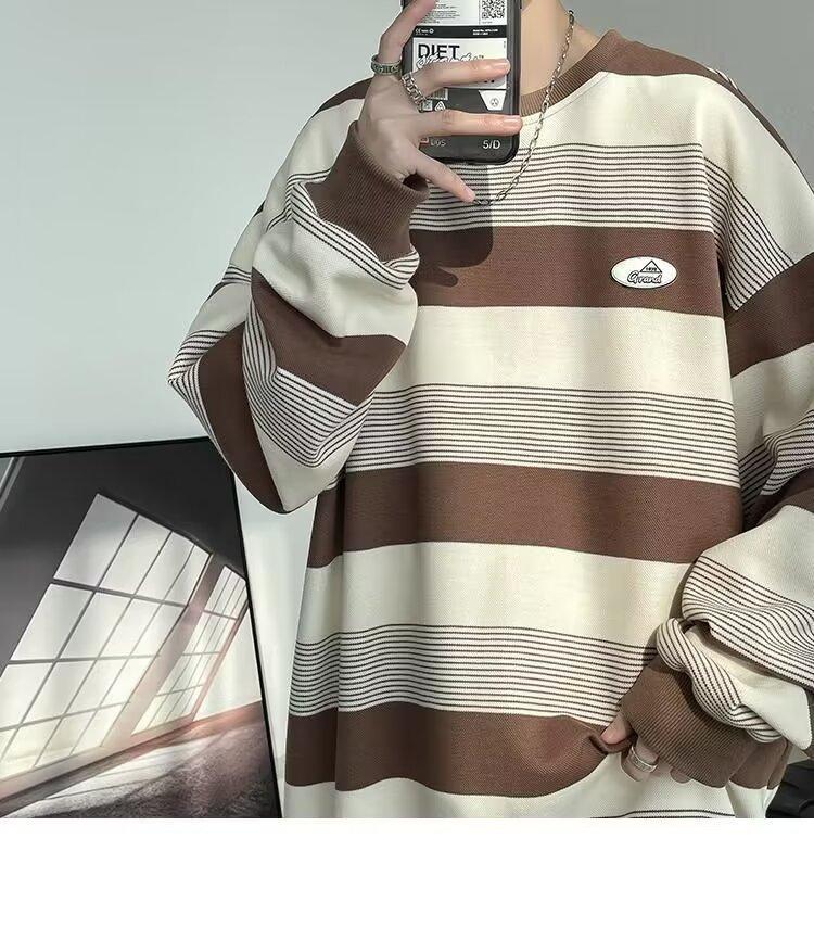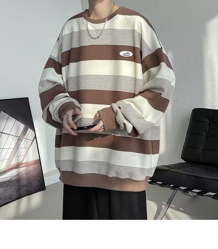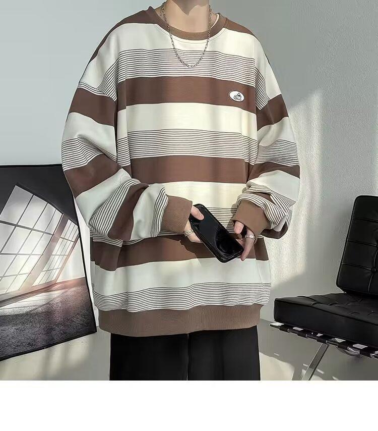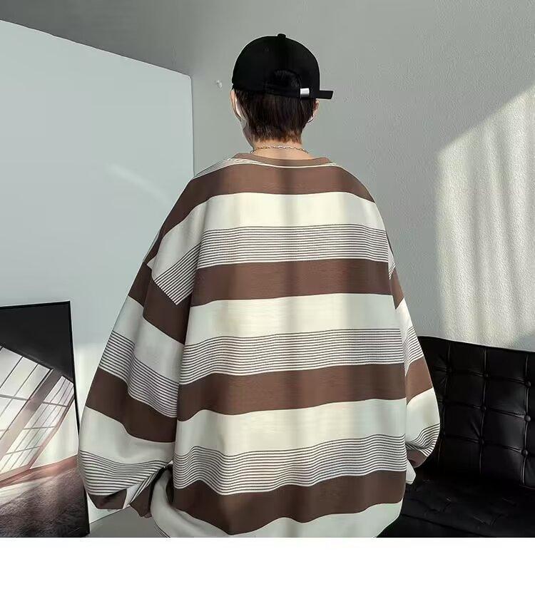 2024 Novo Gola Redonda Moletom Masculino Primavera e Outono Estilo Japonês Retro Preguiçoso Listrado Manga Longa Top Adolescentes Solto