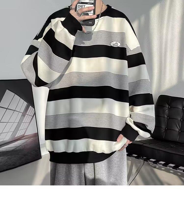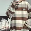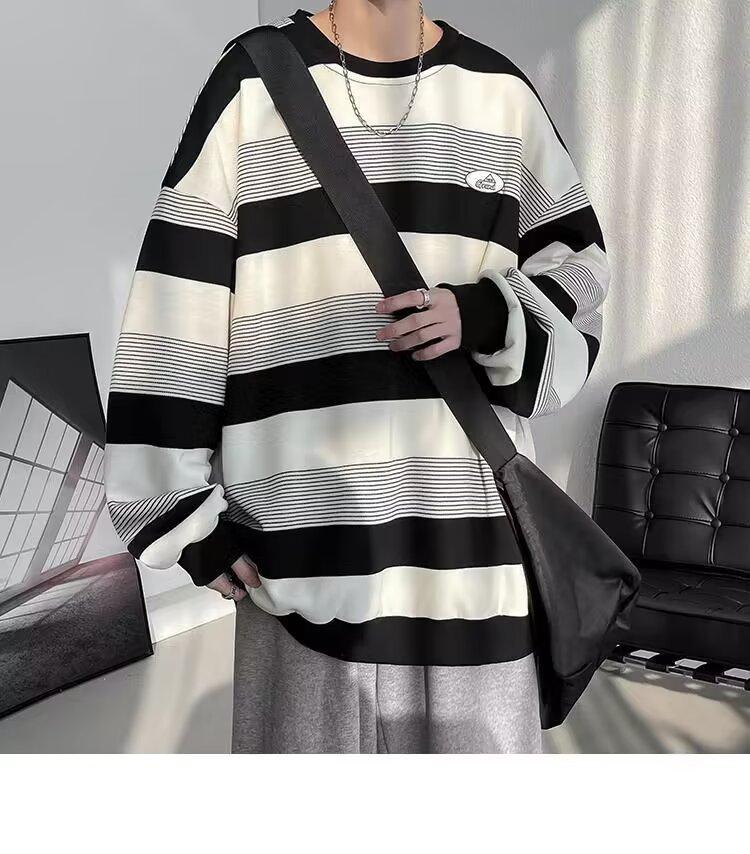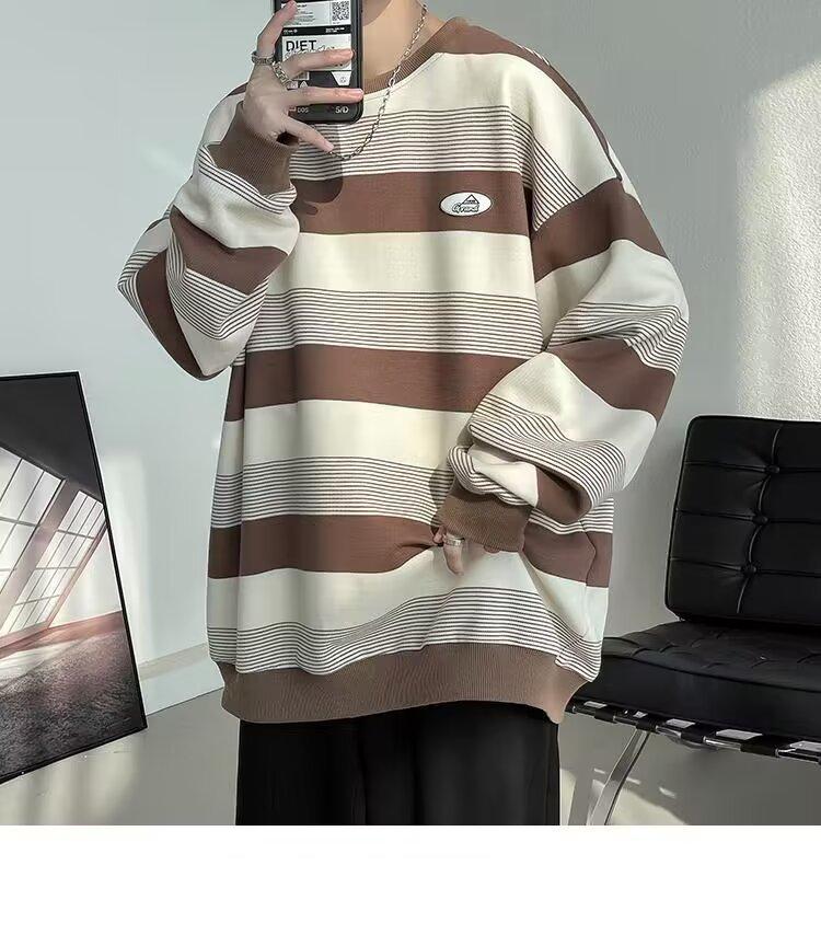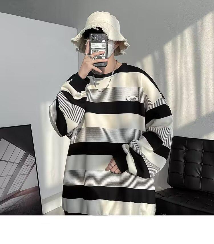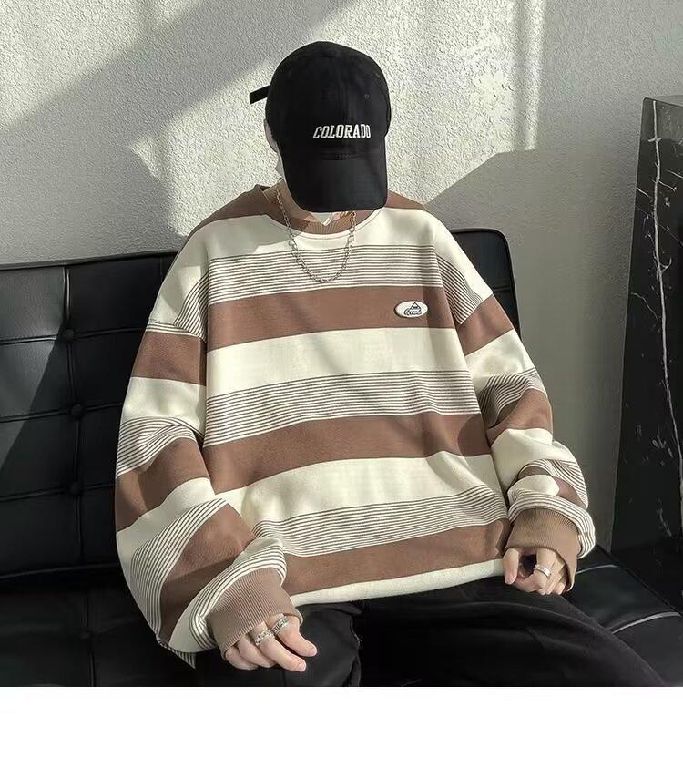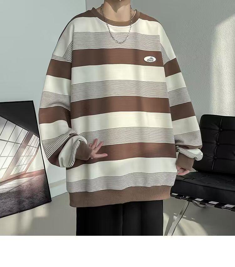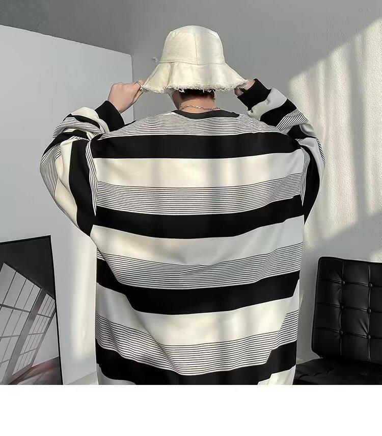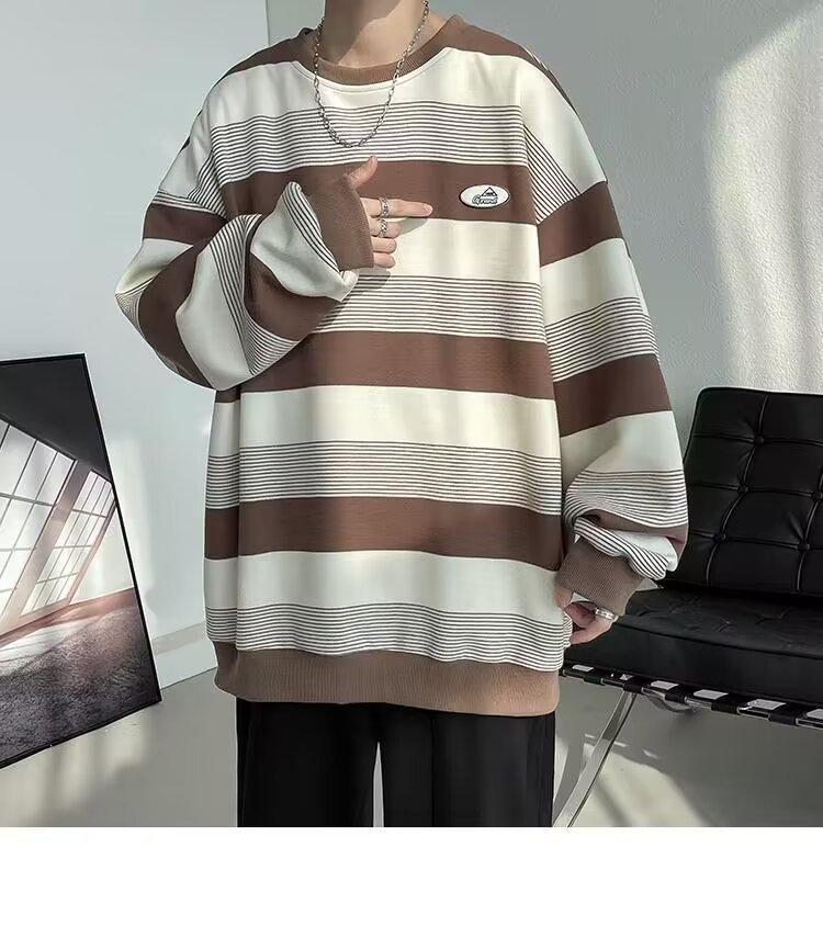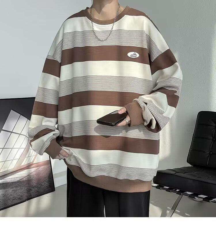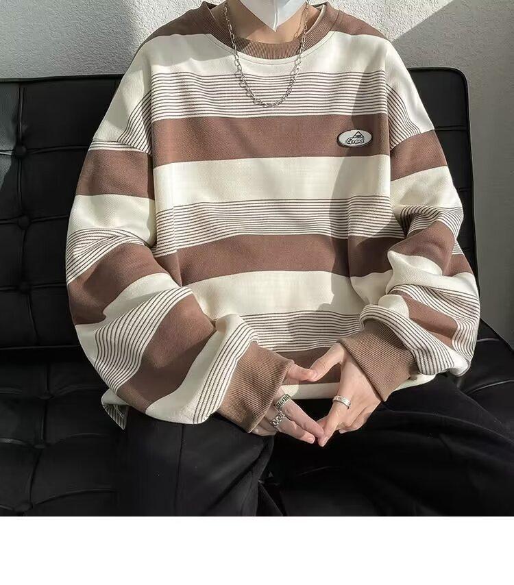 2024 Novo Gola Redonda Moletom Masculino Primavera e Outono Estilo Japonês Retro Preguiçoso Listrado Manga Longa Top Adolescentes Solto