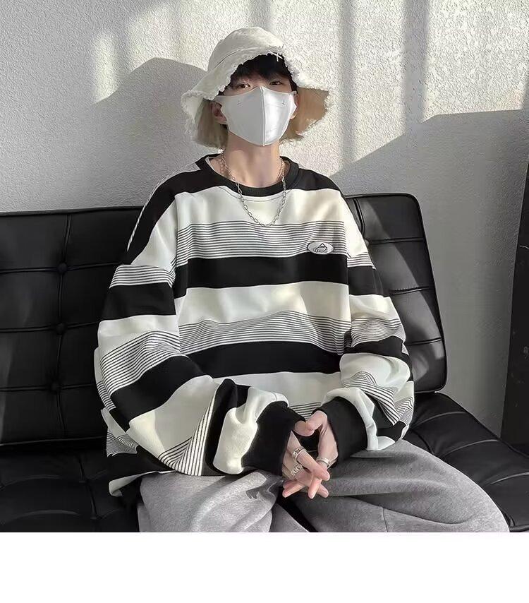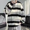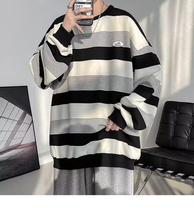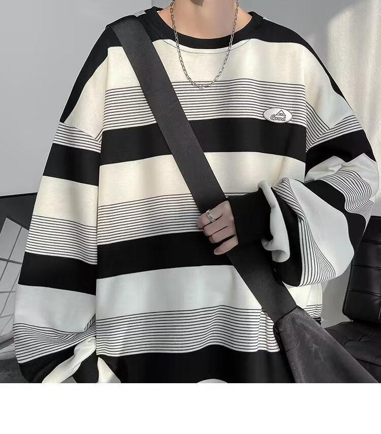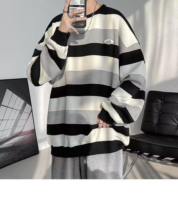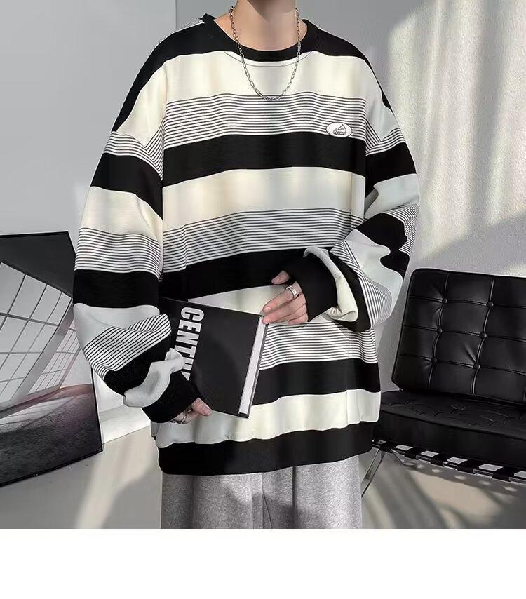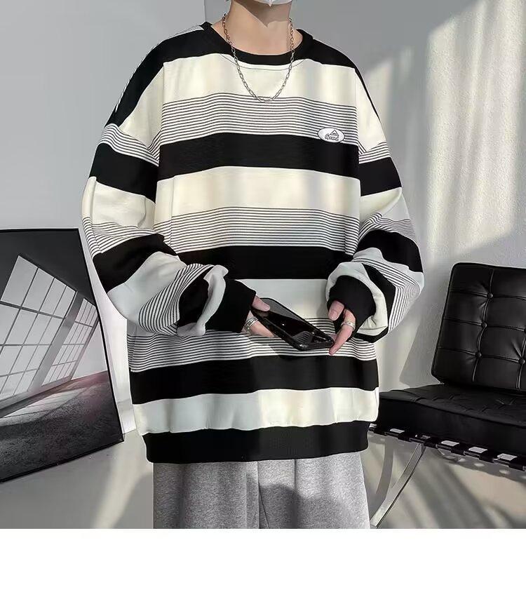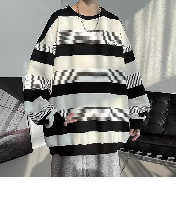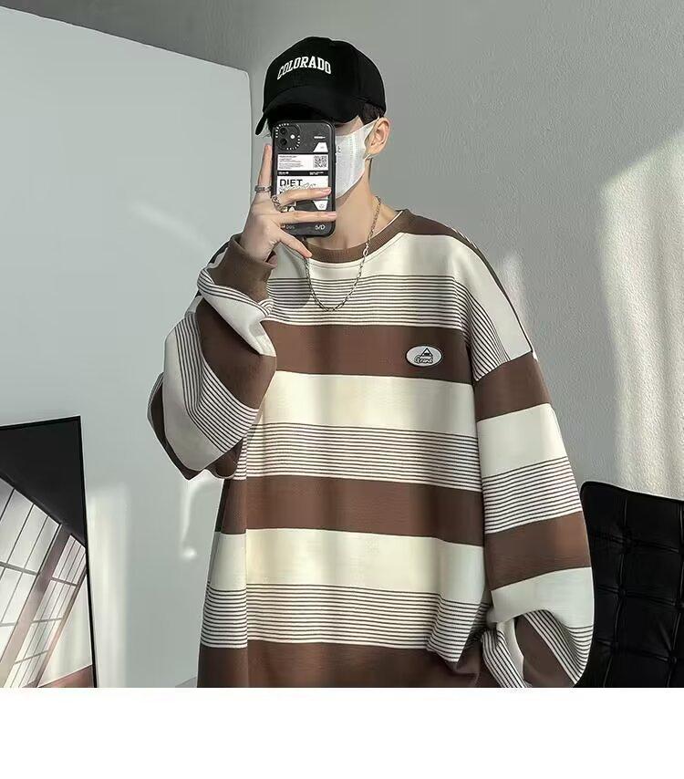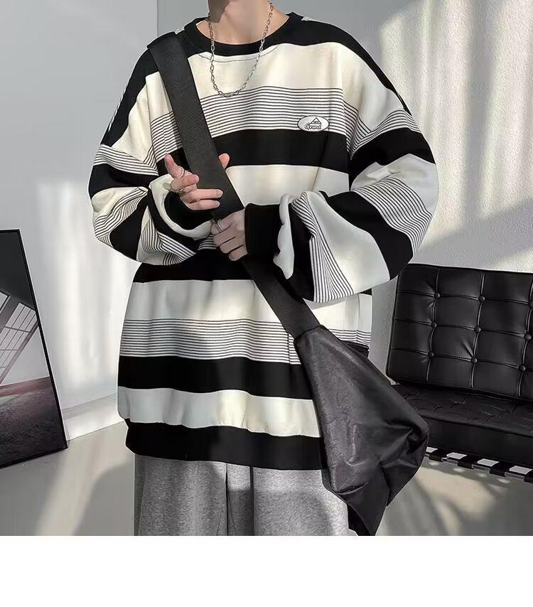 2024 Novo Gola Redonda Moletom Masculino Primavera e Outono Estilo Japonês Retro Preguiçoso Listrado Manga Longa Top Adolescentes Solto