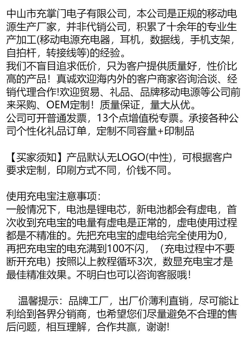 Em circunstâncias normais, a bateria é uma bateria de lítio e as baterias novas terão eletricidade vazia. É normal ficar sem eletricidade ao receber energia do banco de potência pela primeira vez. O processo de utilização de eletricidade vazia é impreciso. Primeiro, use a potência virtual do banco de potência para 0 e, em seguida, carregue totalmente o banco de potência até 100 sem piscar. (Não desconecte o carregador durante o processo de carregamento.) Siga o tutorial acima e faça o ciclo 3 vezes. O banco de potência digital é o mais preciso. Efeito. Se você não entende, também pode consultar o atendimento ao cliente! [Serviço Especial] A empresa pode emitir faturas ordinárias e faturas especiais de imposto sobre valor agregado de 13 pontos. Realize encomendas de brindes personalizados de diversas empresas e personalize diferentes capacidades + produtos impressos. O produto não possui LOGOTIPO por padrão (neutro) e pode ser customizado de acordo com a necessidade do cliente. Diferentes métodos de impressão e preços são diferentes. [Entrega expressa] Cada loja tem como padrão YTO e Jitu Express. Se precisar enviar outra entrega expressa, informe-nos com antecedência. Providencie a entrega em até 24 horas após o pagamento e a entrega em até 48 horas, no máximo. [Garantia pós-venda] O Dropshipping suporta devoluções e trocas sem motivo em sete dias, substituição de três meses e garantia de meio ano. Descrição verdadeira, garantia de qualidade, serviço pós-venda atencioso, compre com confiança. Fábrica de marca, preço à saída da fábrica e vendas diretas de baixo lucro, tentamos o nosso melhor para dar lucros a distribuidores de todas as esferas da vida. Também esperamos que vocês tentem evitar problemas pós-venda irracionais, se entendam e cooperem entre si para obter resultados ganha-ganha. Obrigado! |