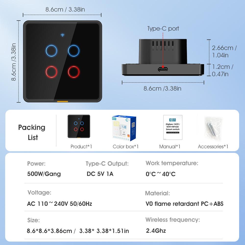 O switch pode carregar o celular (carregamento lento), e também pode ser usado com acessórios inteligentes com interface Tipo-C, sem cabos de dados, deixando a casa mais arrumada. Fácil de instalar, montagem modular, e pode ser livremente personalizado.