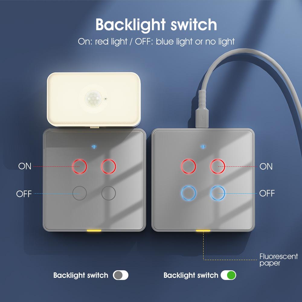 O indicador do interruptor usa luz vermelha e luz azul/sem luz (a luz de fundo pode ser desligada através do APP à noite) para distinguir o status do interruptor. A parte inferior do switch é cuidadosamente equipada com uma faixa fluorescente, que emite um leve lembrete. Mesmo se a luz de fundo estiver desligada, você poderá encontrar facilmente a posição do interruptor à noite. Ao mesmo tempo, o brilho da faixa de luz é moderado e não afetará o seu sono.