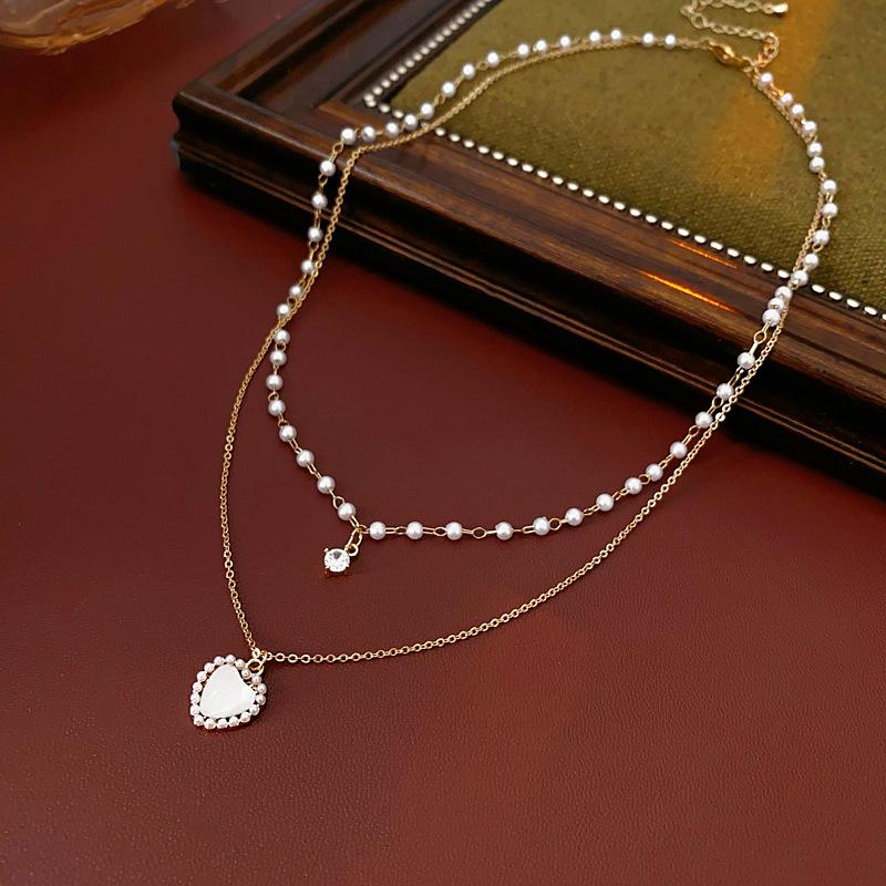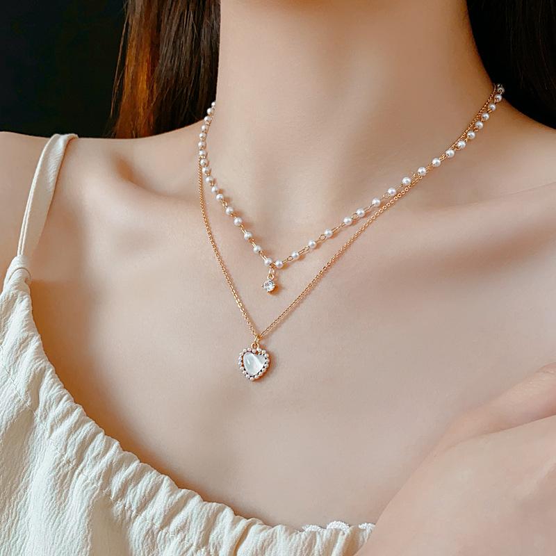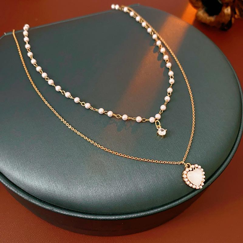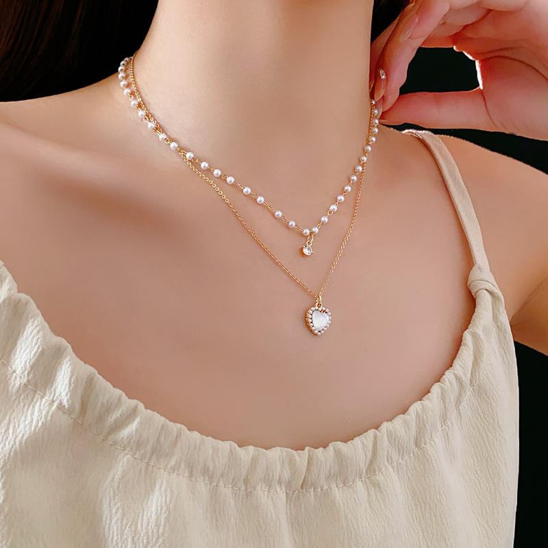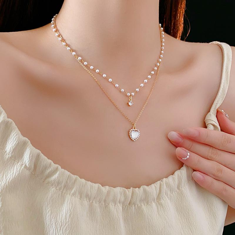Colar de amor, estilo de luxo leve, corrente de clavícula de camada dupla de pérolas de zircônia, colar moderno, simples, sofisticado e elegante, fábrica de casa