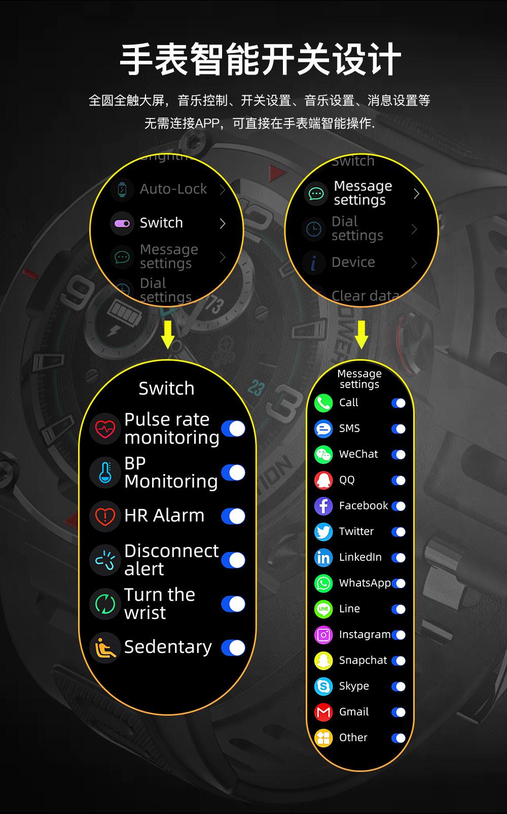Step counting, Heart rate monitoring, Blood pressure measurement, Social entertainment, Bluetooth call, Smart ...