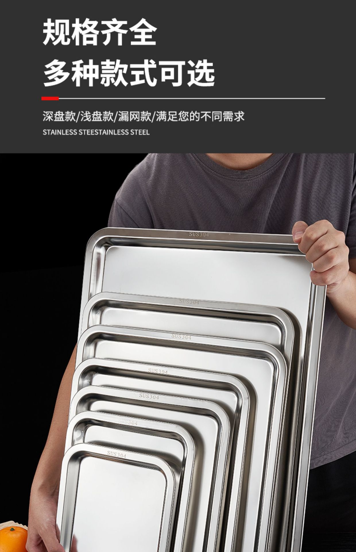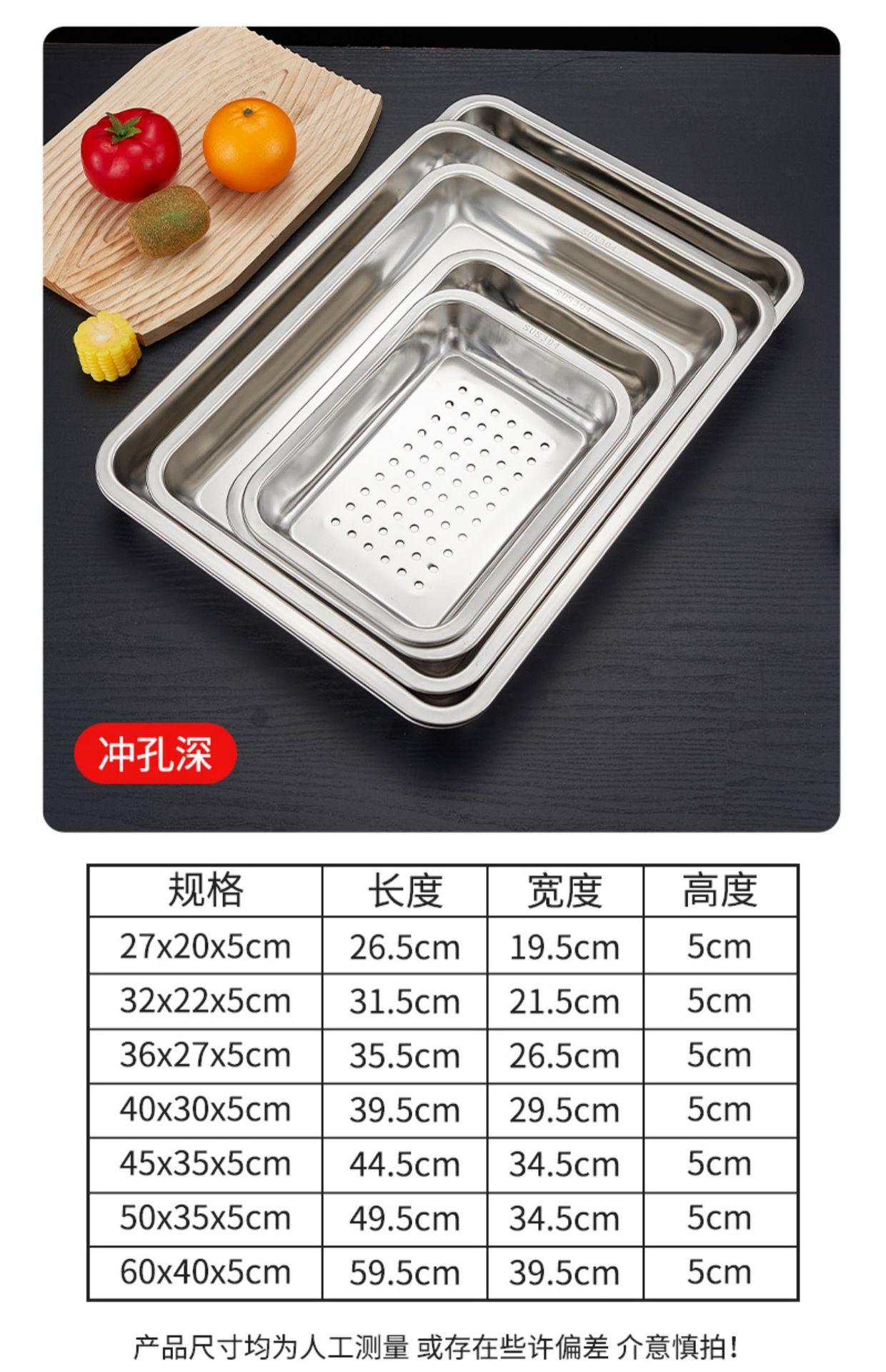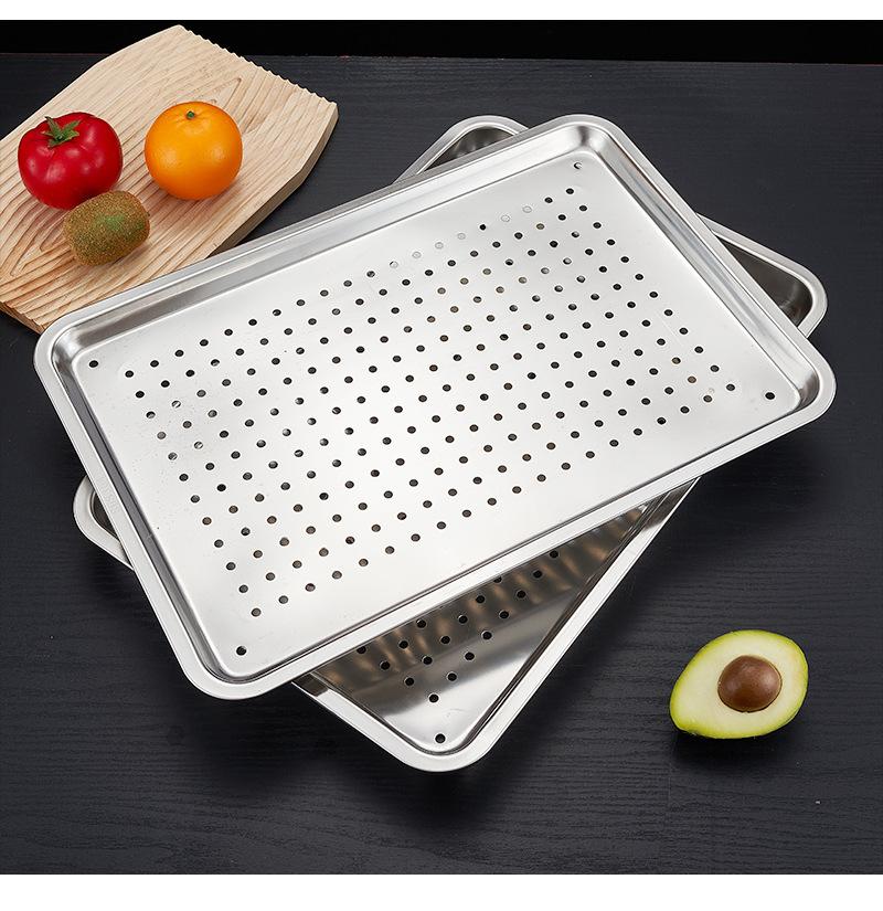 304 Bandeja de aço inoxidável de grau alimentício Cozinha retangular Bandeja quadrada de fundo plano perfurado Bandeja de cozimento Bacia com vazamento comercial Bandeja de arroz cozido no vapor