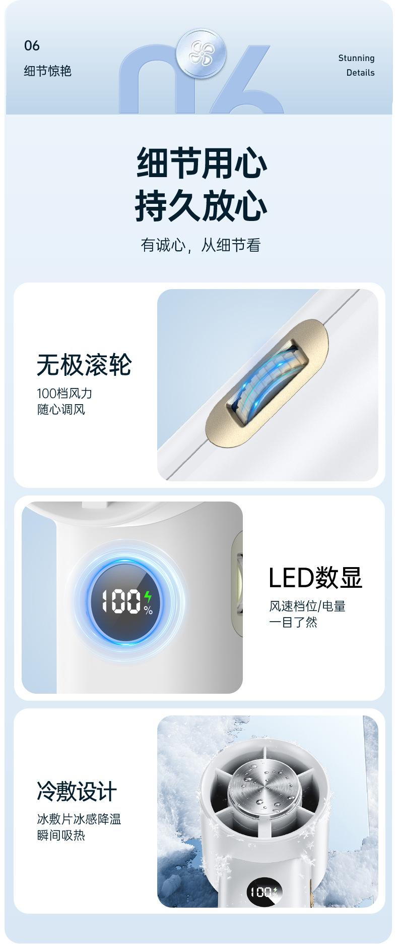 Função do ventilador: pressione rapidamente o interruptor para ligar a velocidade inicial do vento do ventilador "20 marchas", gire o volante para ajustar a velocidade do vento "01-100 marchas" e pressione rapidamente o interruptor novamente para desligar o ventilador;