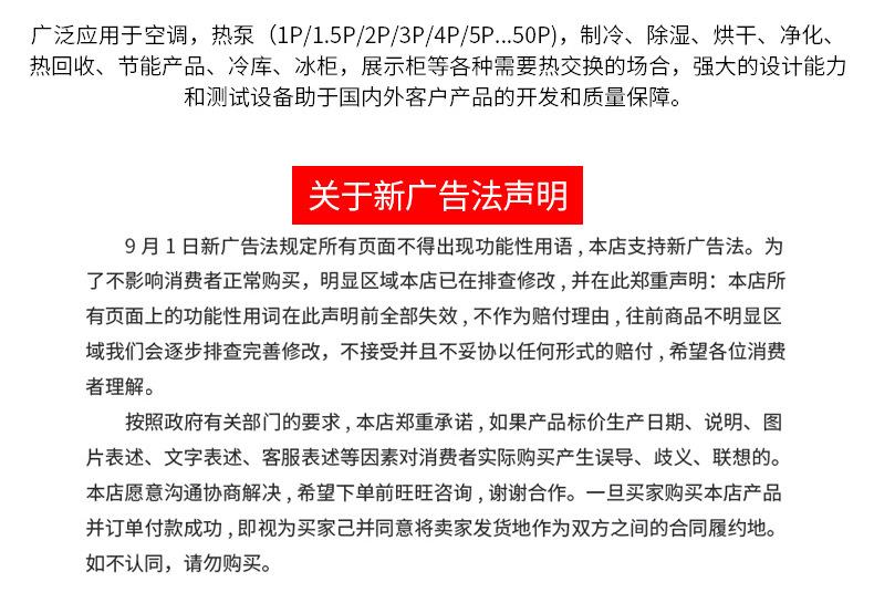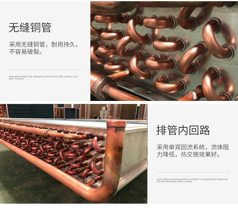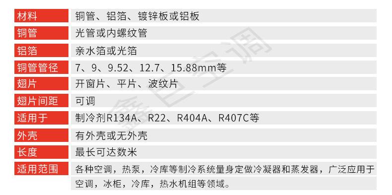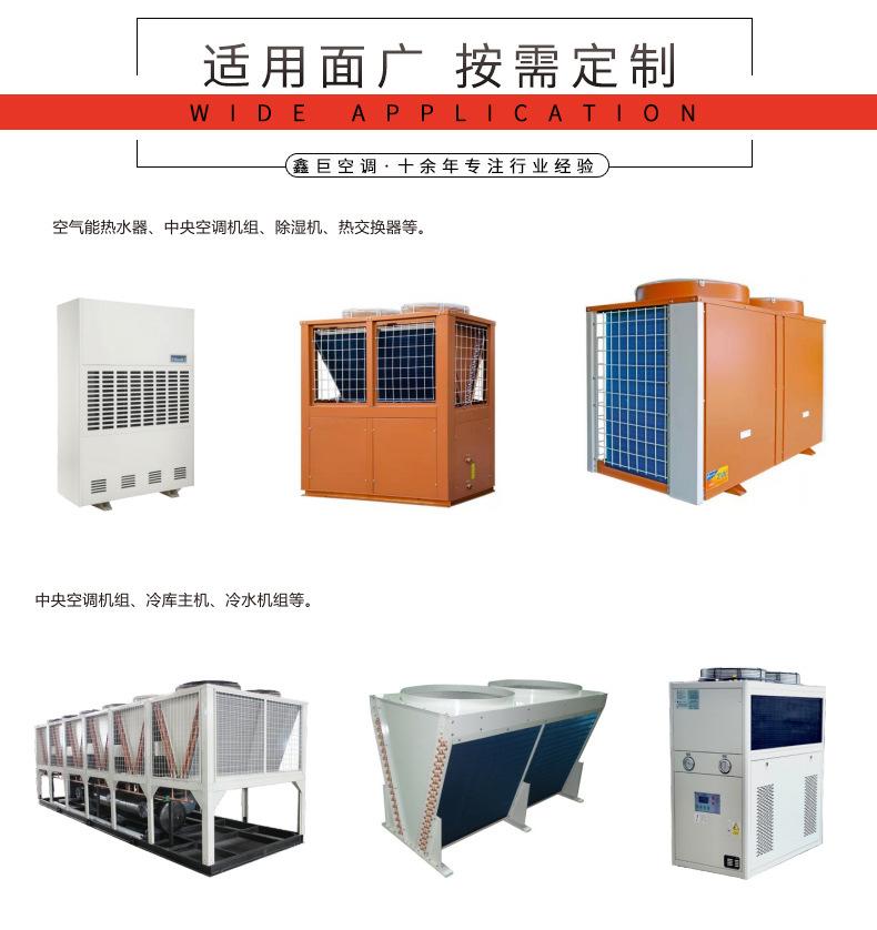 Somos especializados na produção de tubos de cobre com roscas internas ou tubos simples de φ7mm, φ7,94mm, φ9mm, φ9,52mm, φ12,7mm e φ15,88mm de diâmetro, e evaporadores, condensadores e resfriadores de superfície com aletas com chapas corrugadas avançadas ou tecnologia de dobra e flangeamento. Podemos produzir evaporadores, condensadores e resfriadores de superfície de vários formatos, como tubo em tubo, em forma de U e em forma de V. Somos especializados em adaptar condensadores e evaporadores de alta qualidade e alta eficiência para várias unidades de ar condicionado e unidades de bomba de calor, e resfriadores de superfície para várias unidades de fan coil para obter troca de calor entre água quente e fria e ar, e entre refrigerantes e ar. Temos uma gama completa de especificações e variedades para atender às necessidades de diferentes condições de trabalho e várias combinações, e temos uma variedade de tubos de cobre e espaçamento de chapas para os clientes escolherem.