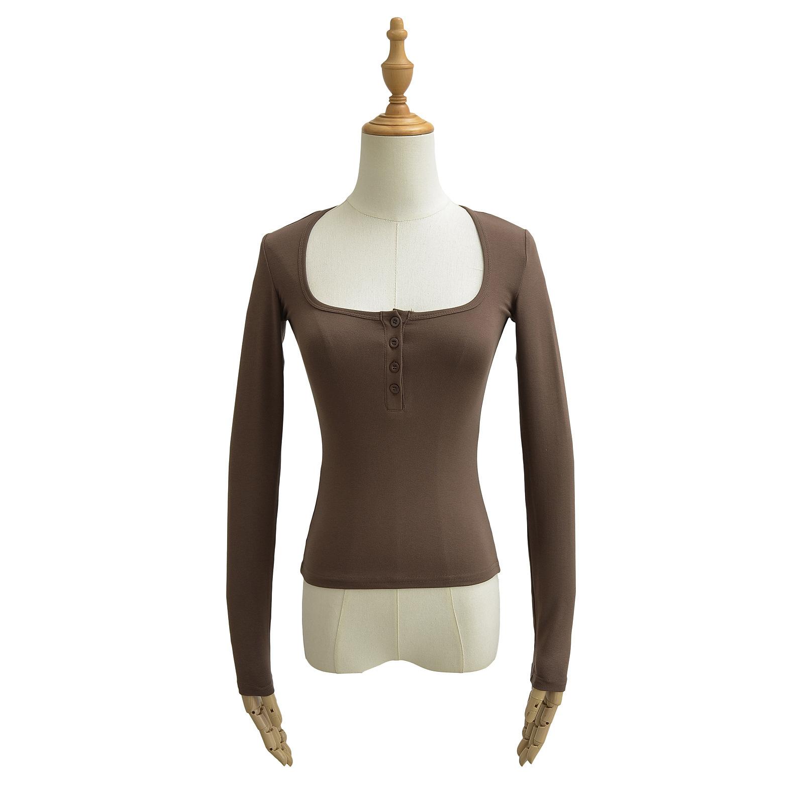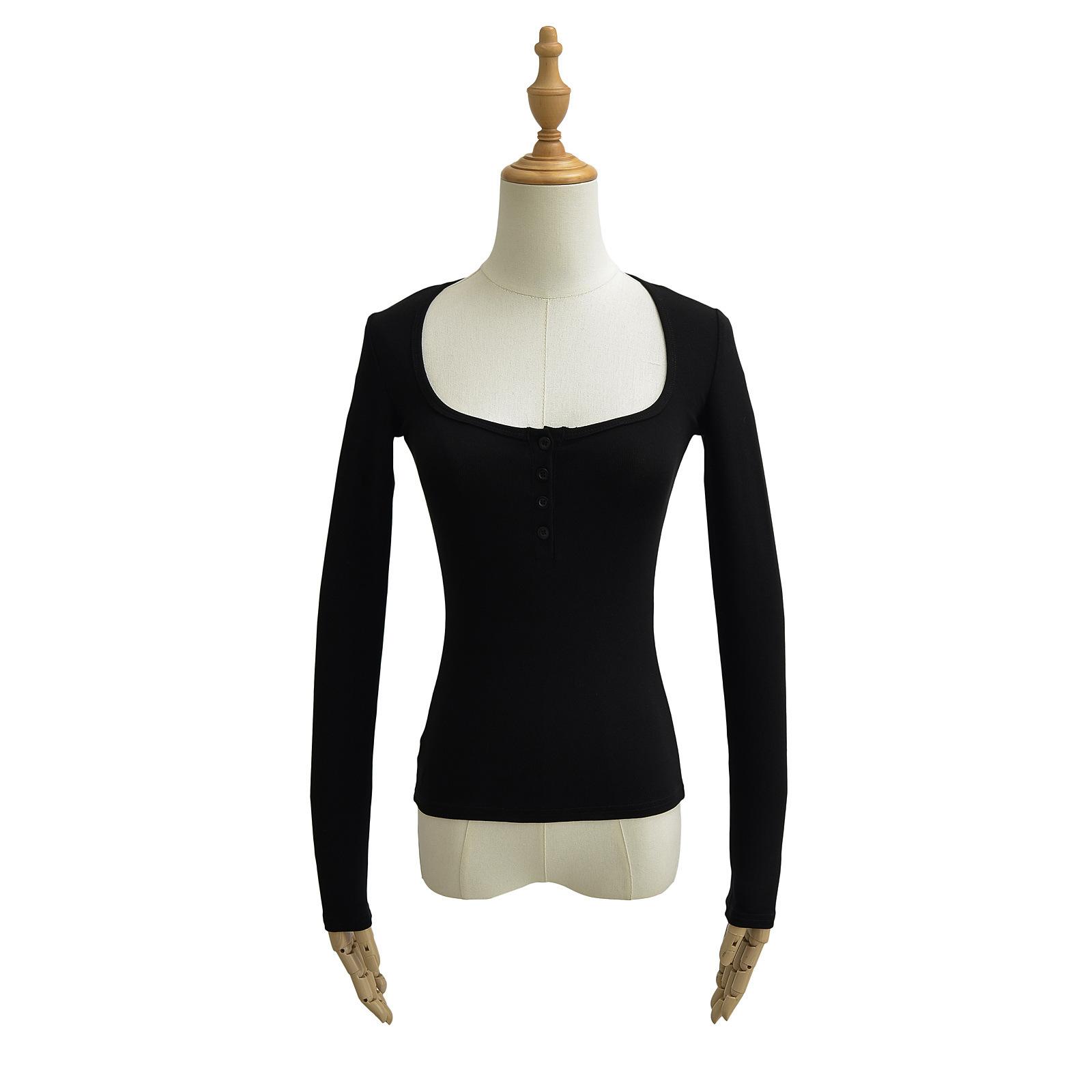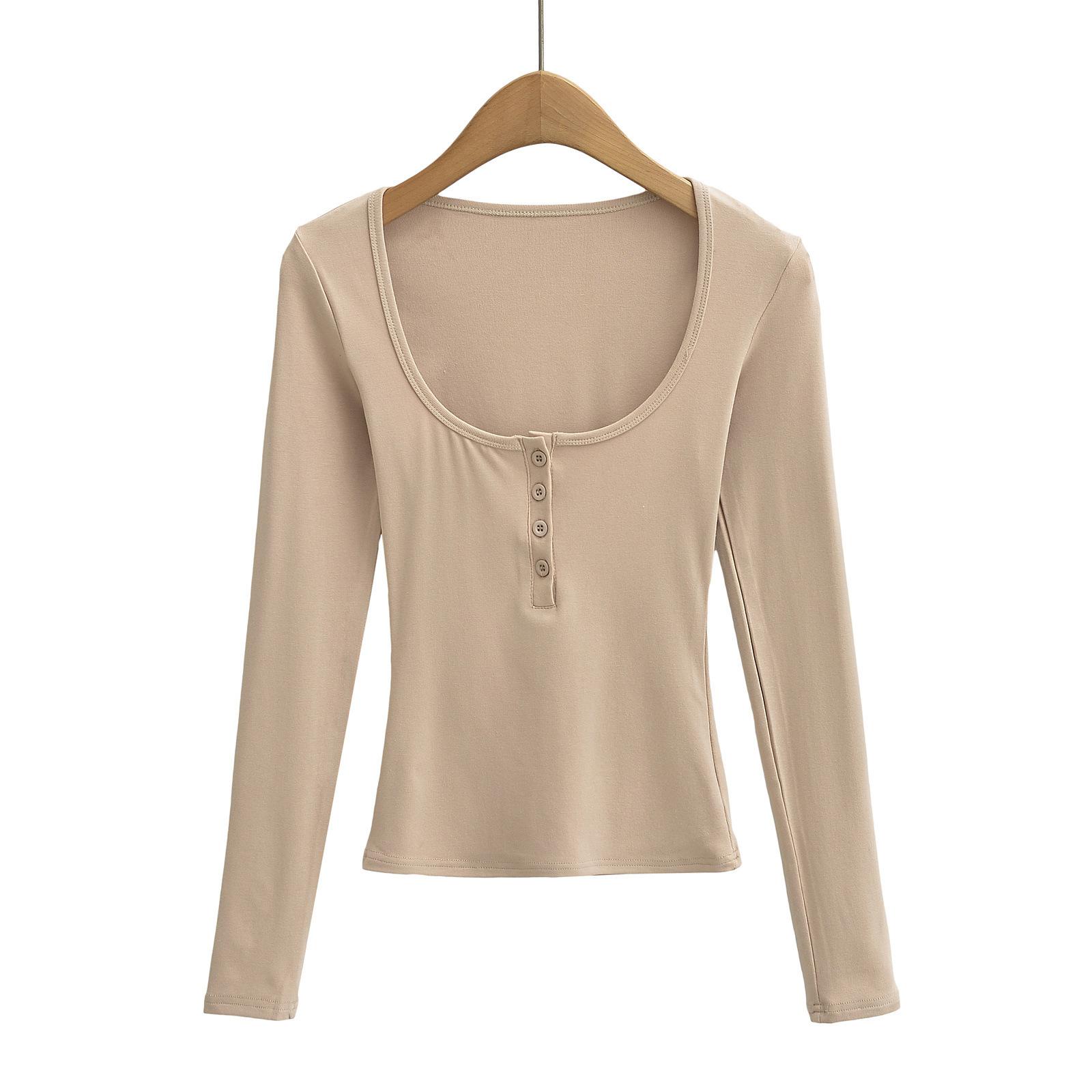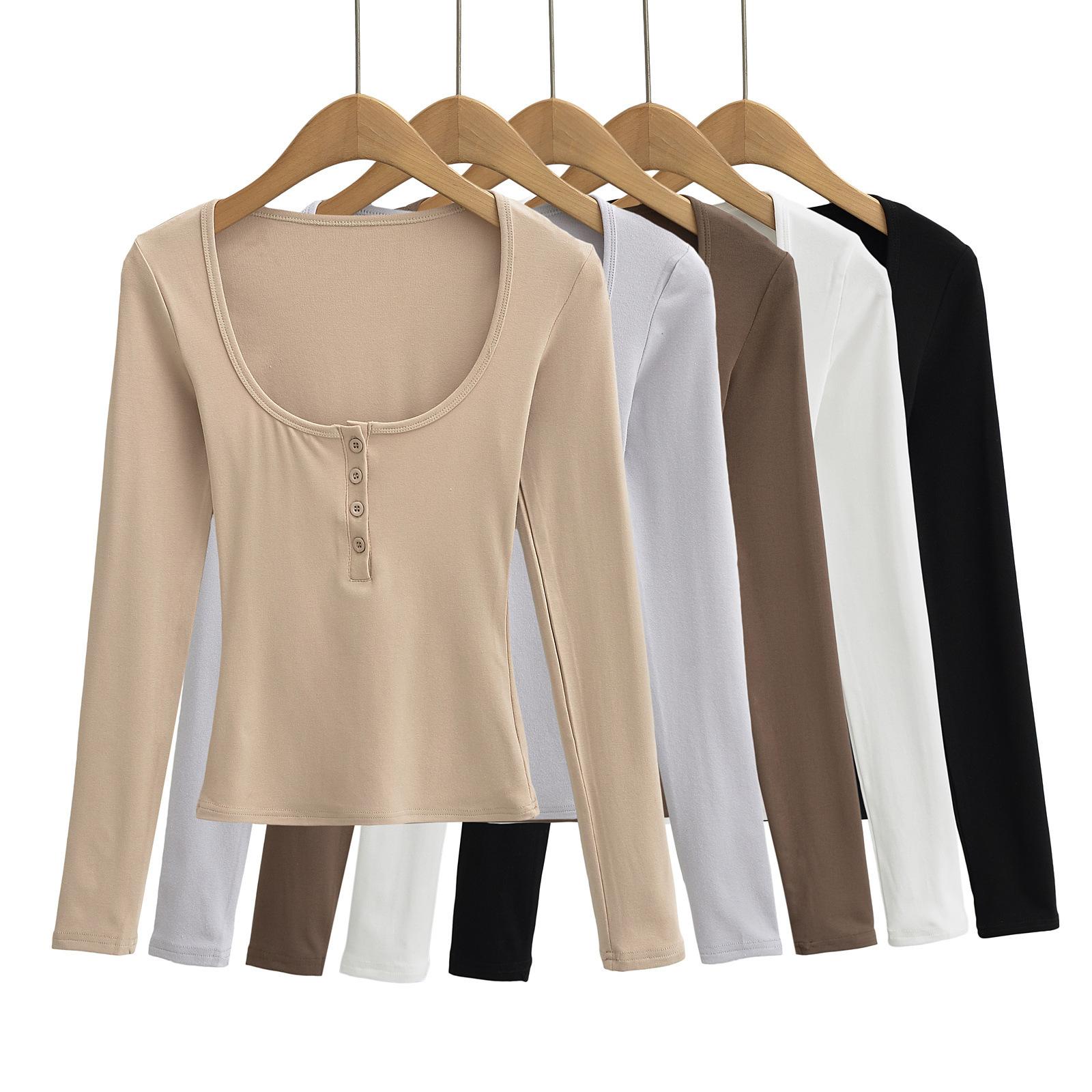 Compre 2024 primavera novo estilo americano de manga comprida camisa de assentamento botão top feminino fio slim fit emagrecimento grande gola quadrada curto T no atacado no Joom.pro