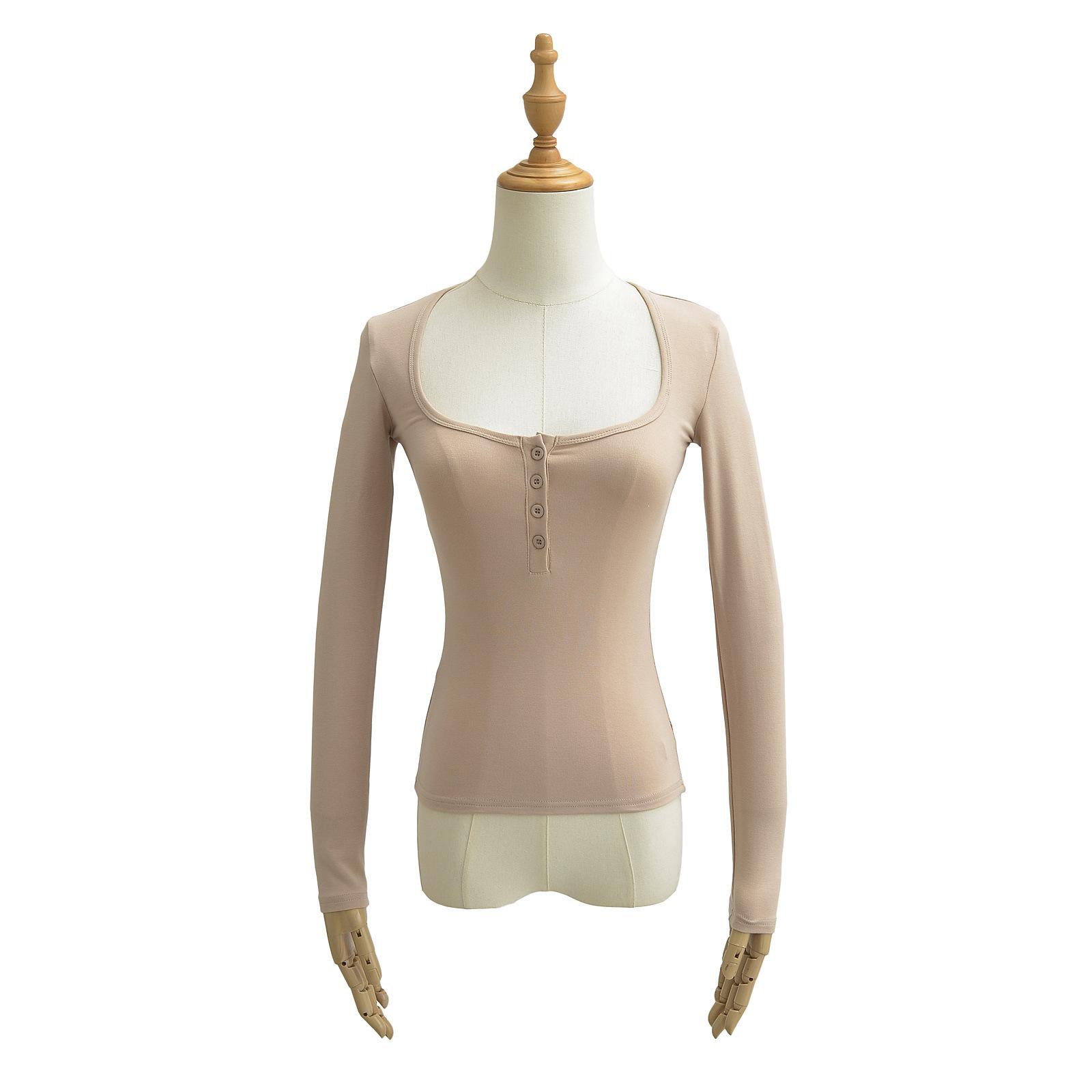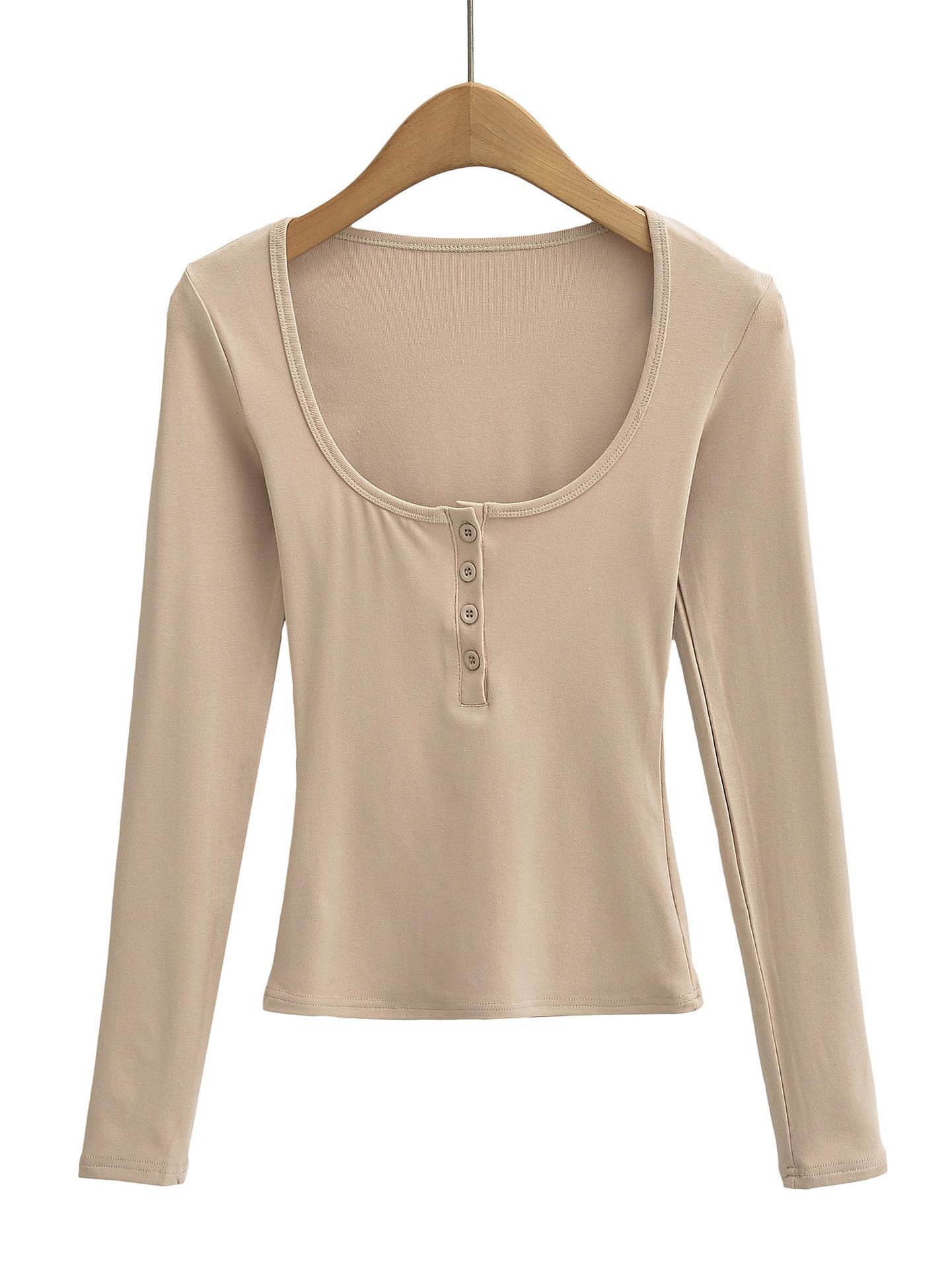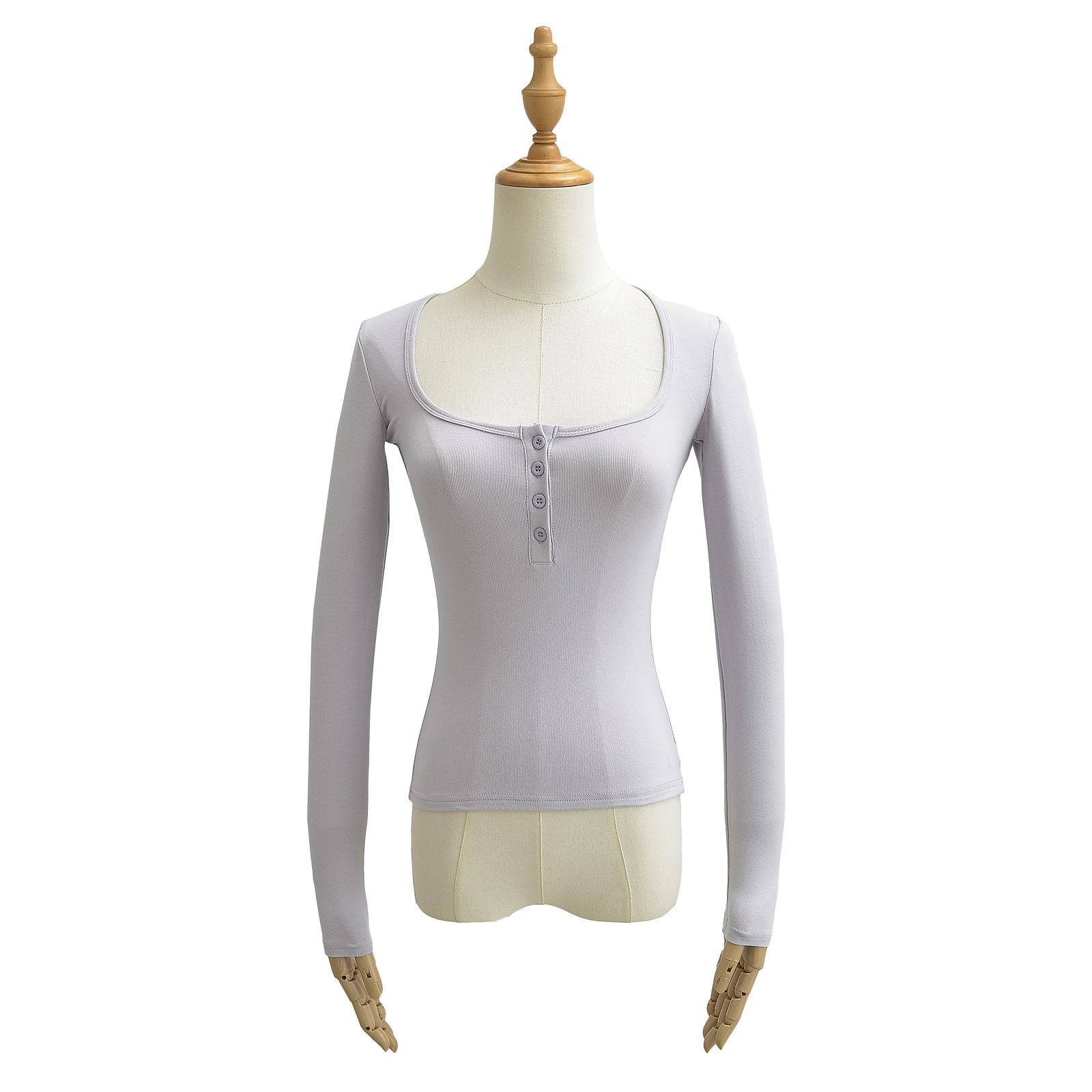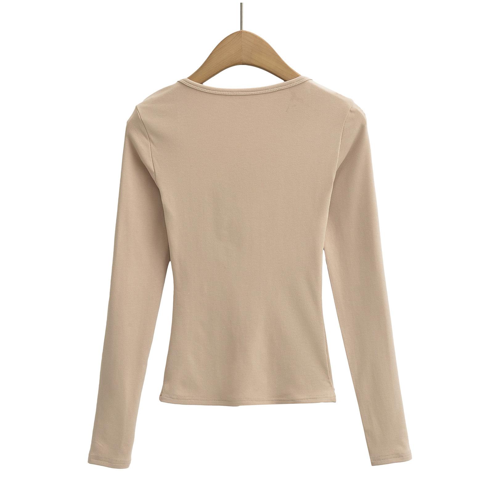 Compre 2024 primavera novo estilo americano de manga comprida camisa de assentamento botão top feminino fio slim fit emagrecimento grande gola quadrada curto T no atacado no Joom.pro