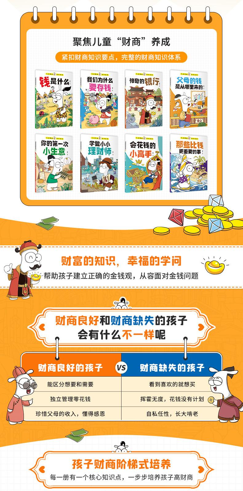 A série de histórias sobre o quociente financeiro que as crianças podem entender, todos os 8 livros de histórias ilustradas sobre o quociente financeiro para crianças de 6 a 12 anos.